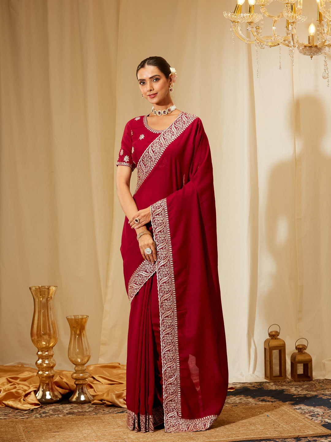 Make a striking entrance in this rose silk blend saree, exquisitely embellished with sparkling sequins...