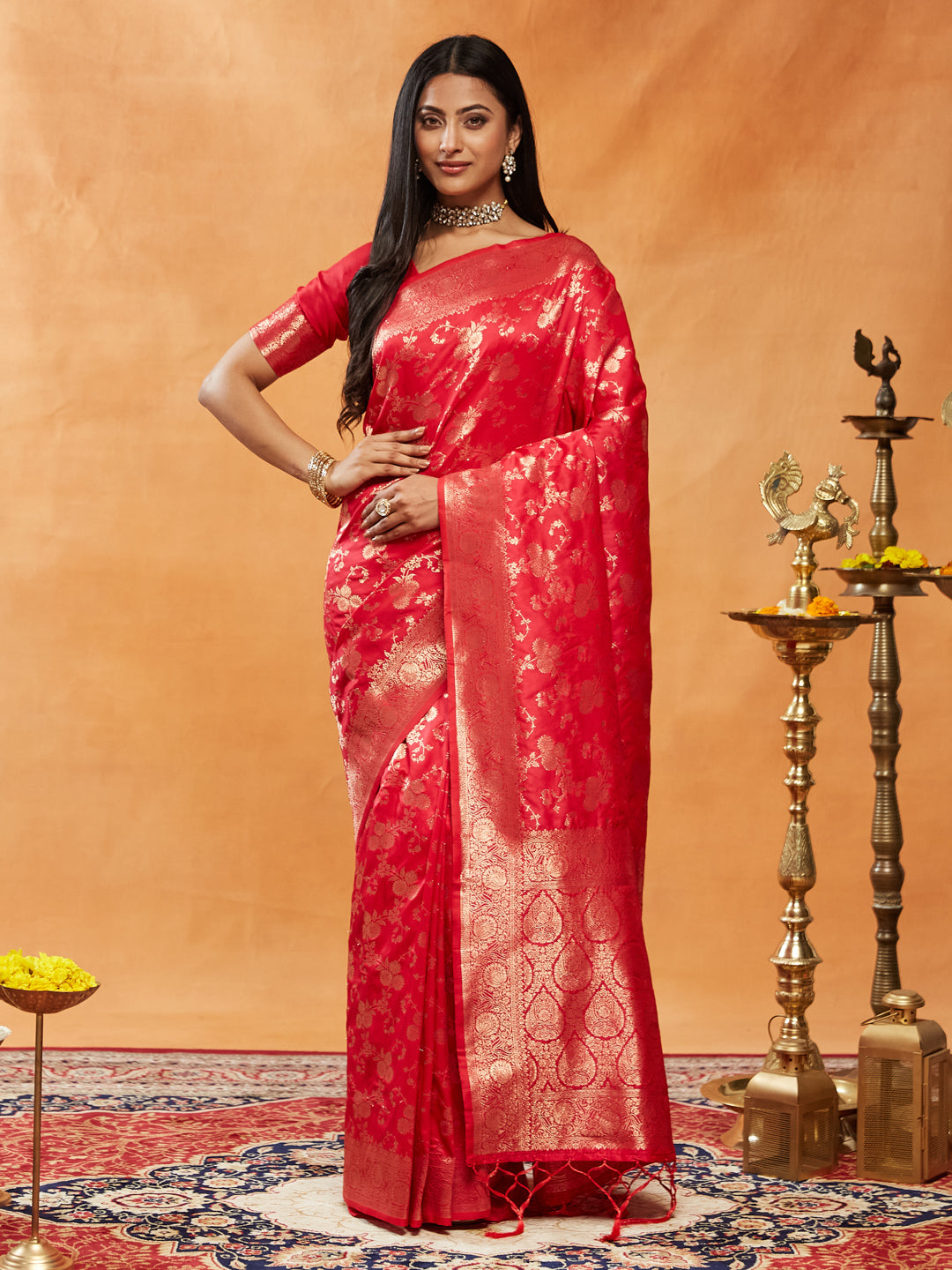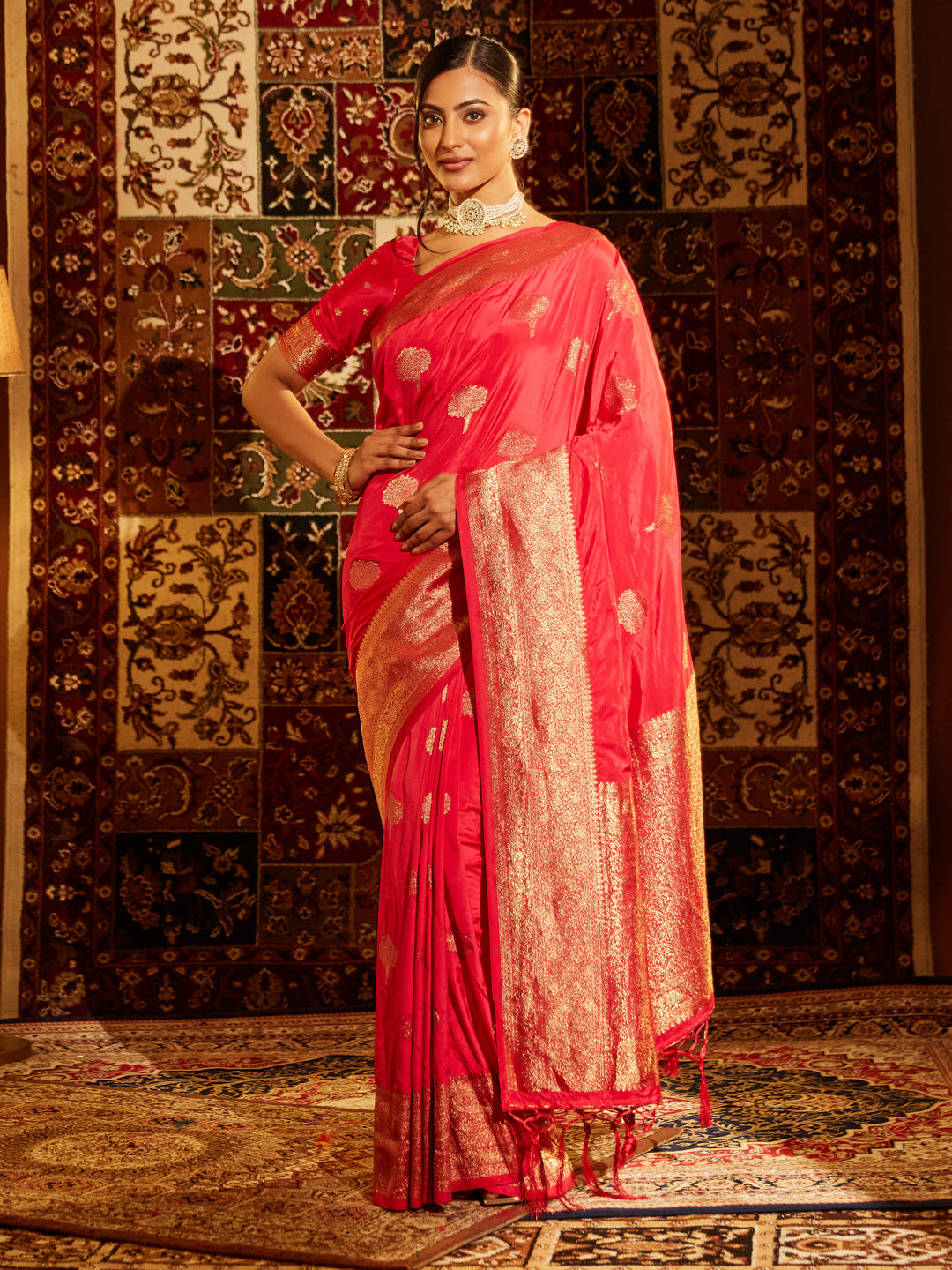 A true symbol of grandeur, this scarlet fuchsia Banarasi silk saree features an exquisite gold...