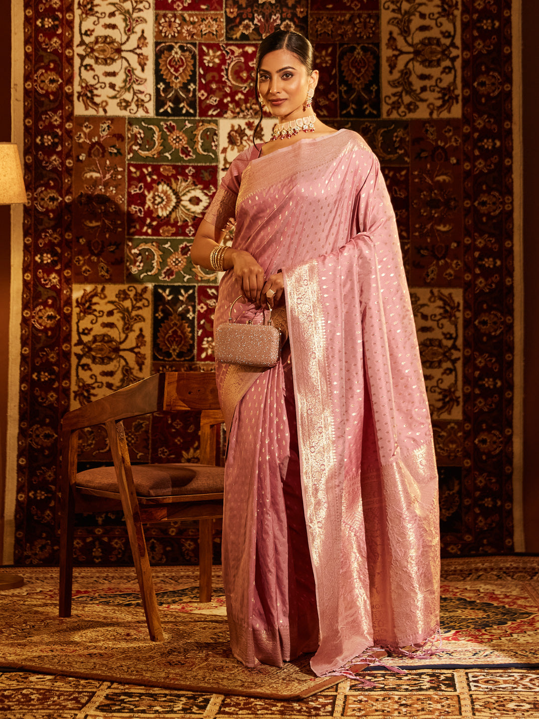 Refined elegance comes alive in this lavender Banarasi silk saree, adorned with dainty gold zari...