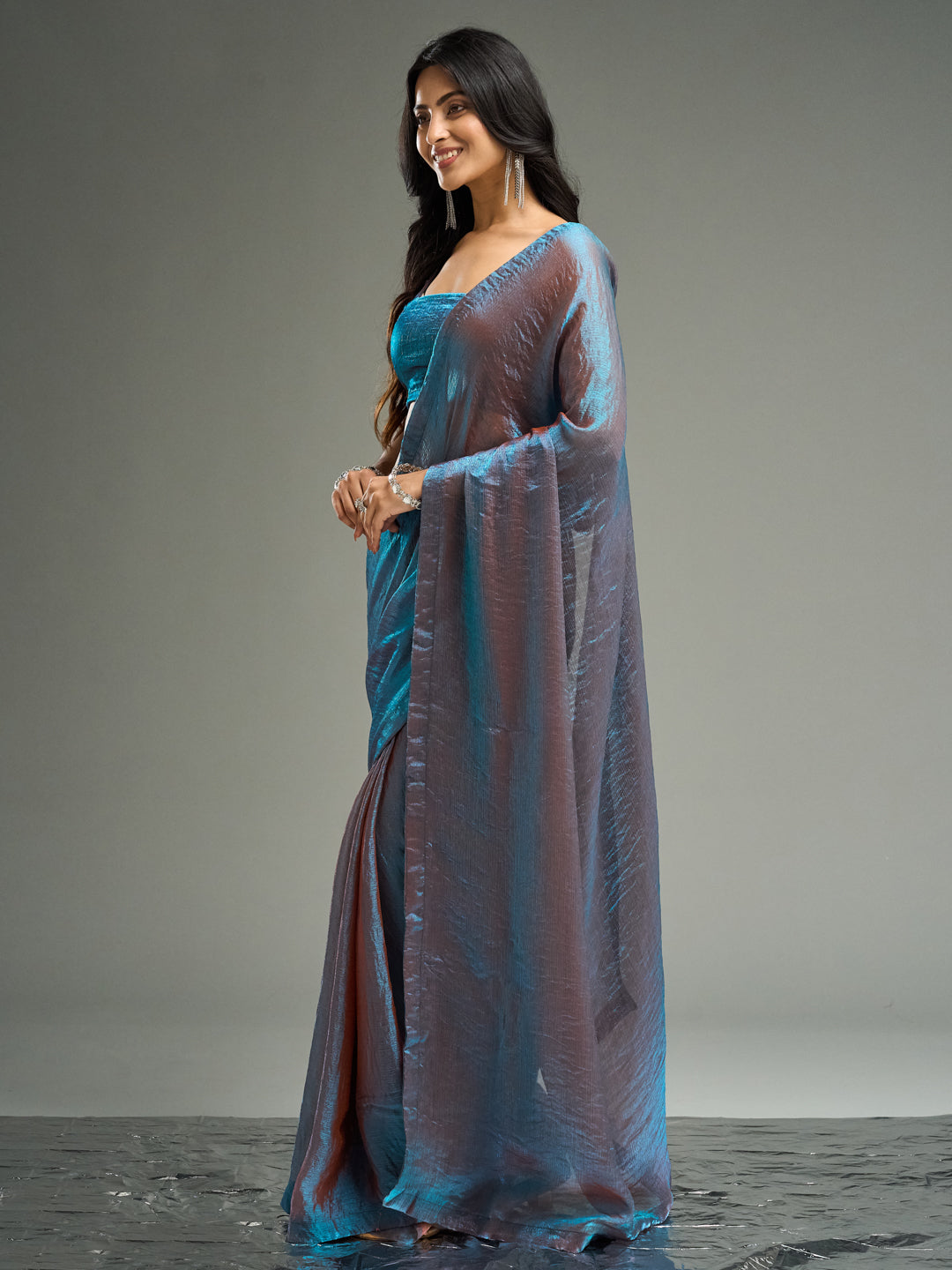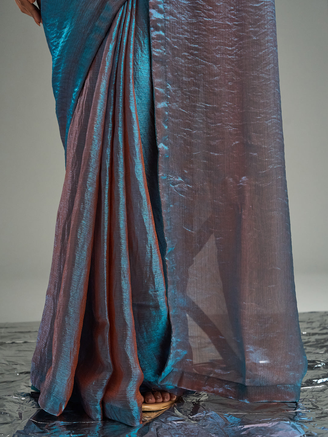 Capture the spotlight in this elegant teal blue saree crafted from soft organza and satin silk. With a sheer pallu and subtle shimmer detailing, this saree strikes the perfect balance between modern glam and timeless charm. The rich color and minimal embellishment make it ideal for cocktail evenings, festive occasions, or intimate celebrations.