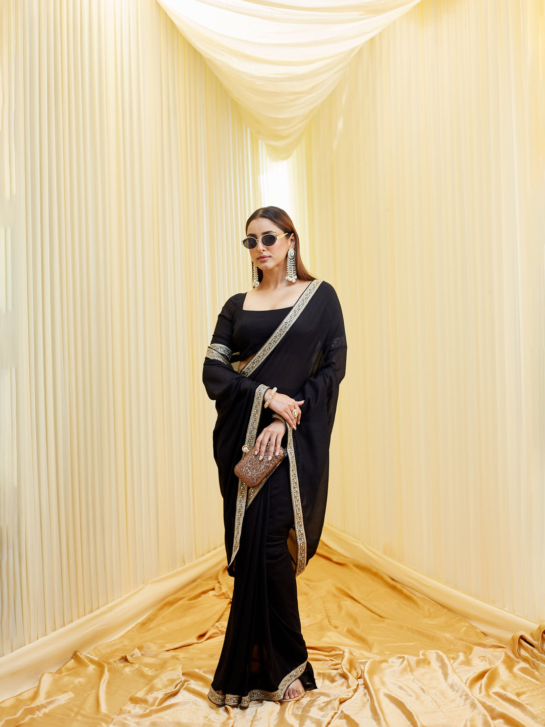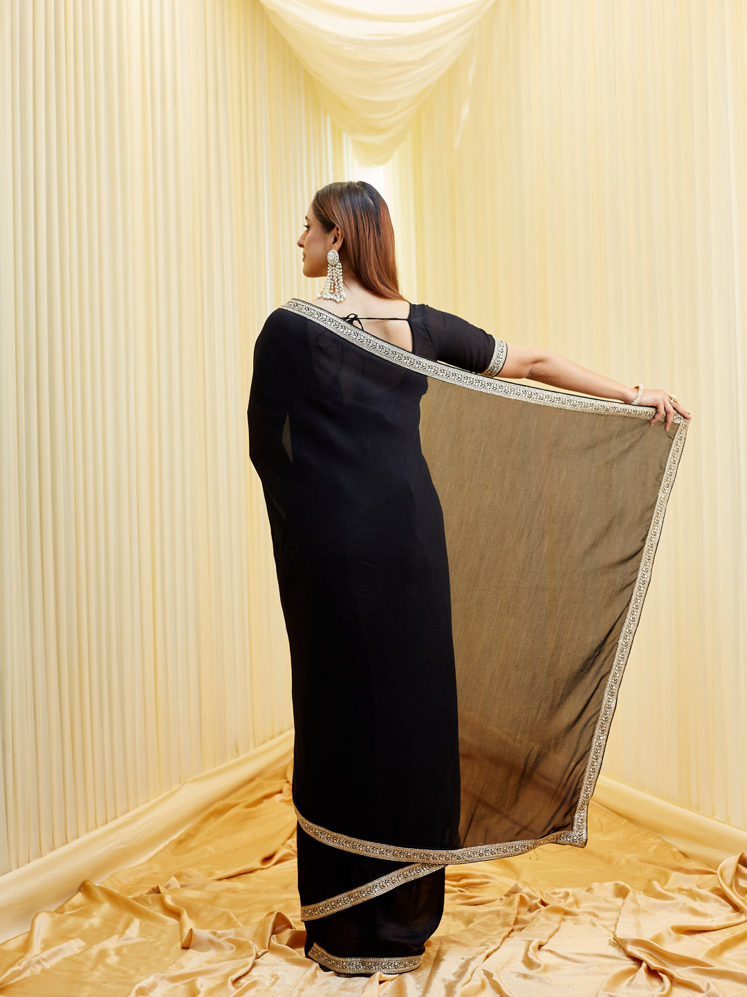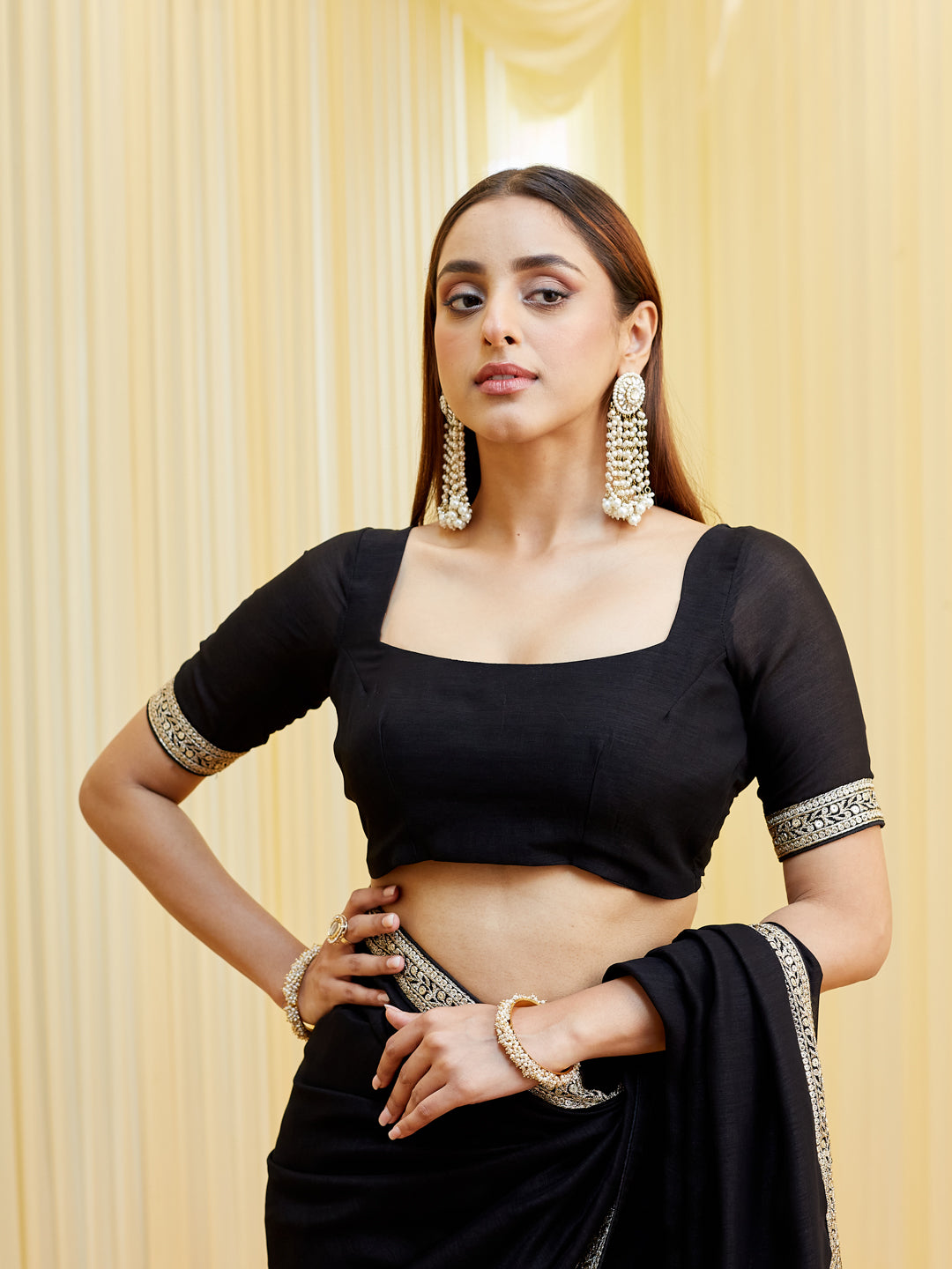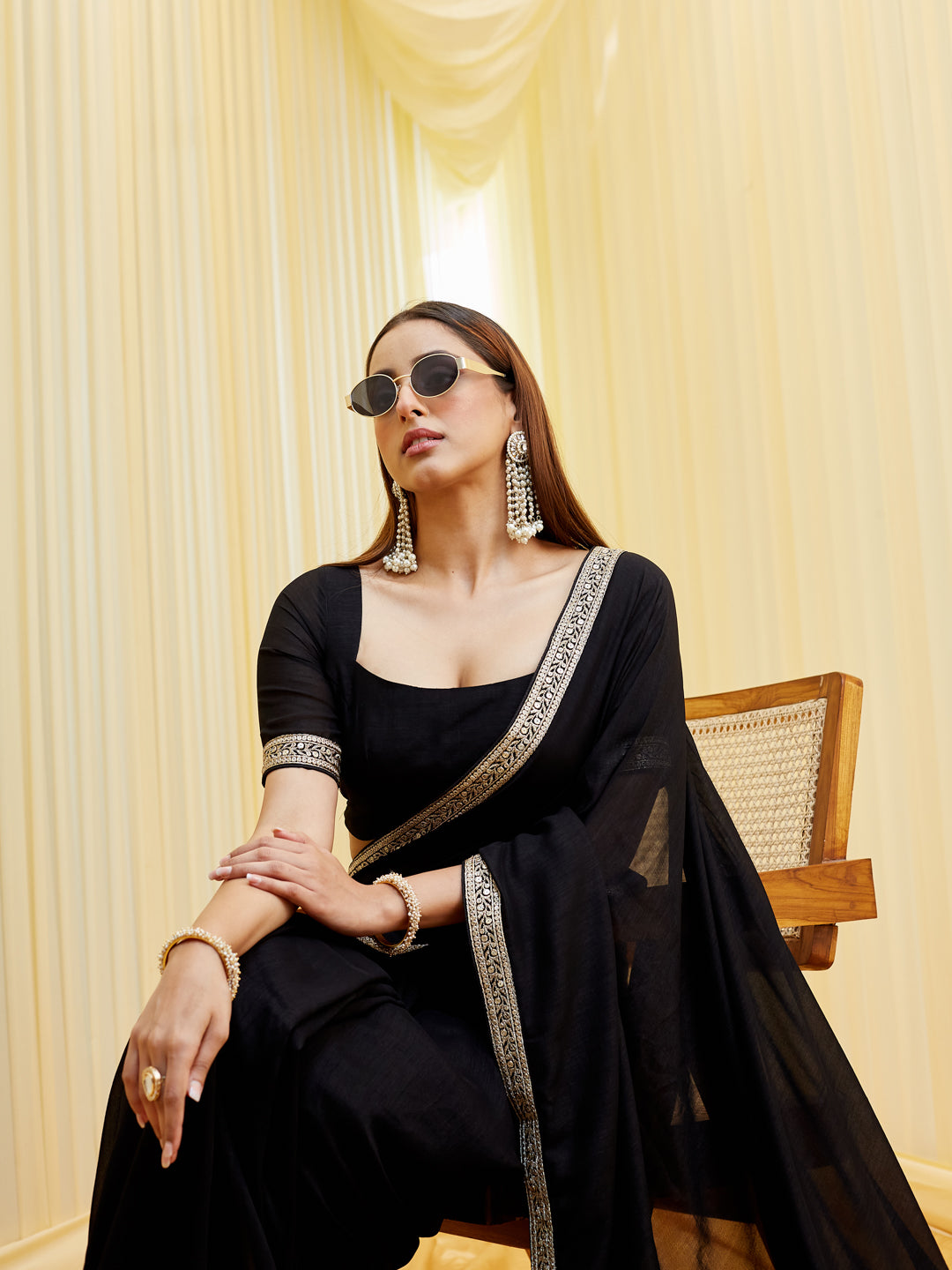 Exude effortless elegance with this serene black saree crafted in a silk cotton blend fabric, perfect for both day and evening occasions. The simplicity of the solid body is beautifully elevated by a narrow yet refined zari embroidered border, featuring intricate patterns in beige-gold tones that catch the light subtly.This saree is a timeless addition to your ethnic wardrobe — ideal for minimalistic festive looks, intimate weddings, or even formal celebrations. The unstitched blouse fabric complements the saree with matching border detailing, allowing you to customize your look effortlessly.