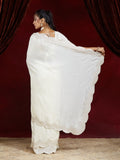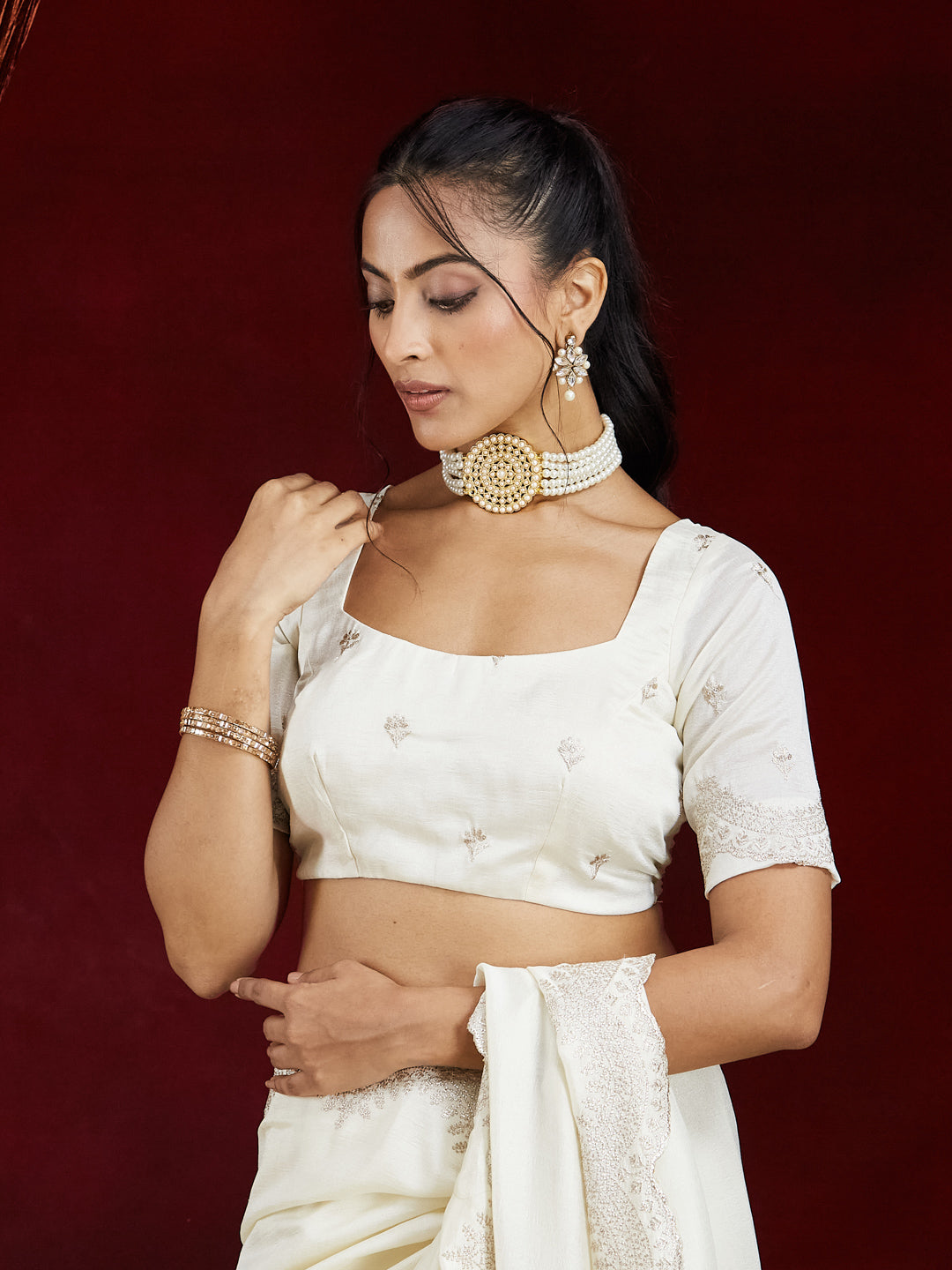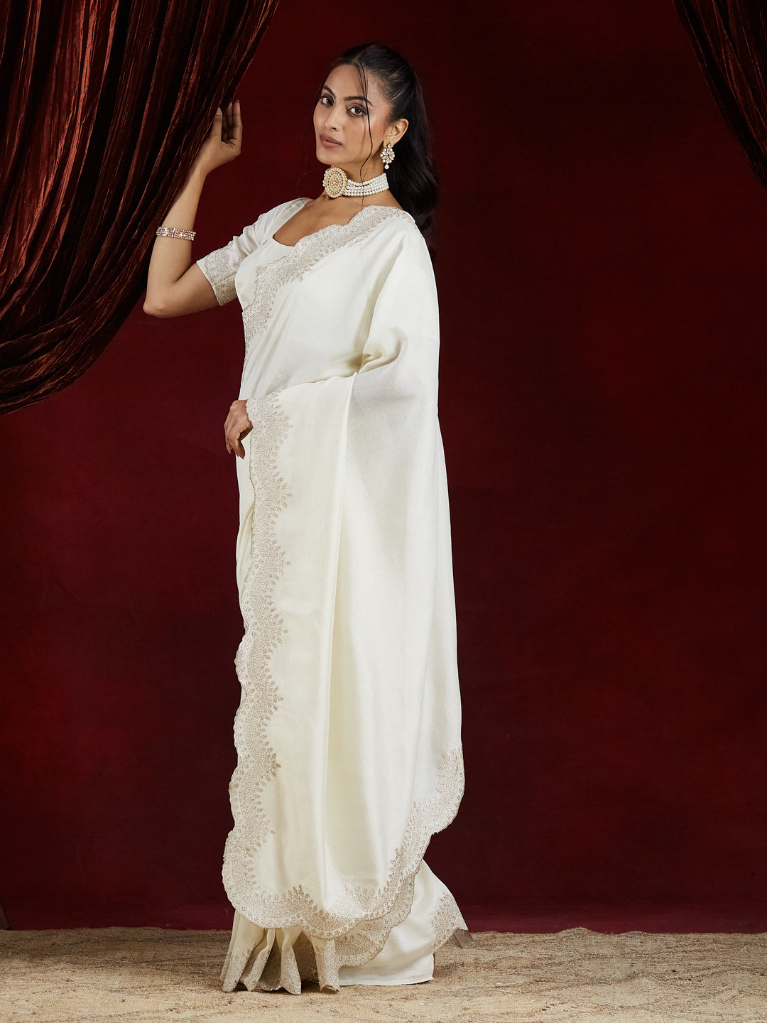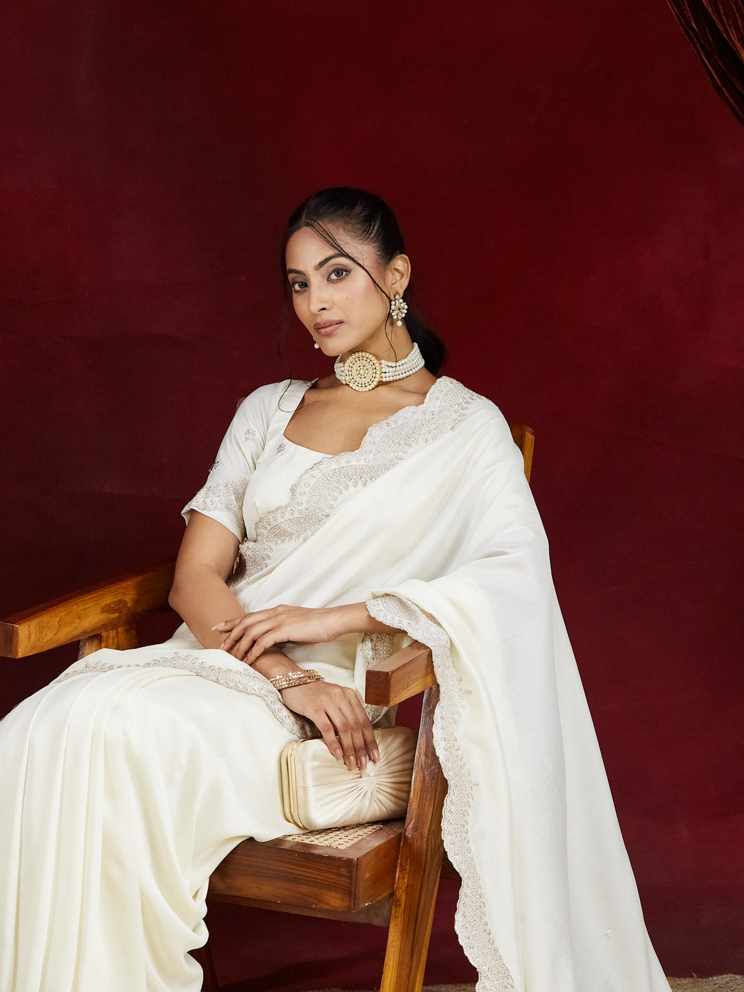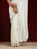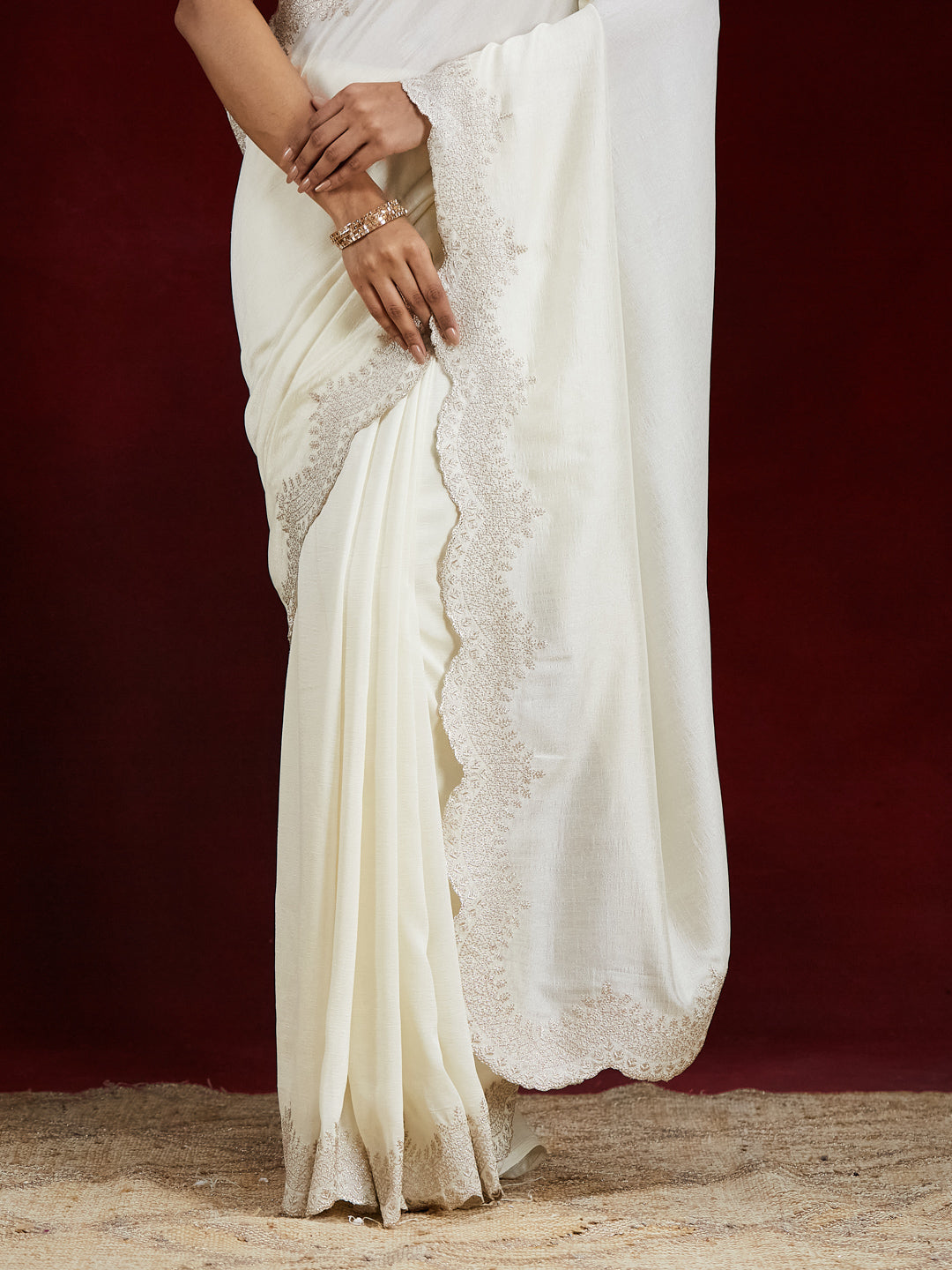 Step into understated luxury with this graceful off-white saree designed in a silk cotton blend fabric. The minimal yet refined look is elevated by an intricately embroidered scalloped border in threadwork, lending it an ethereal charm. This saree is ideal for both traditional and contemporary occasions, offering a clean, polished look with a modern silhouette. The accompanying blouse mirrors the simplicity of the saree with delicate embroidered motifs on the sleeves, perfectly harmonizing with the saree's border. A timeless piece that can be styled up or down for any event — be it a festive gathering, day function, or formal celebration.