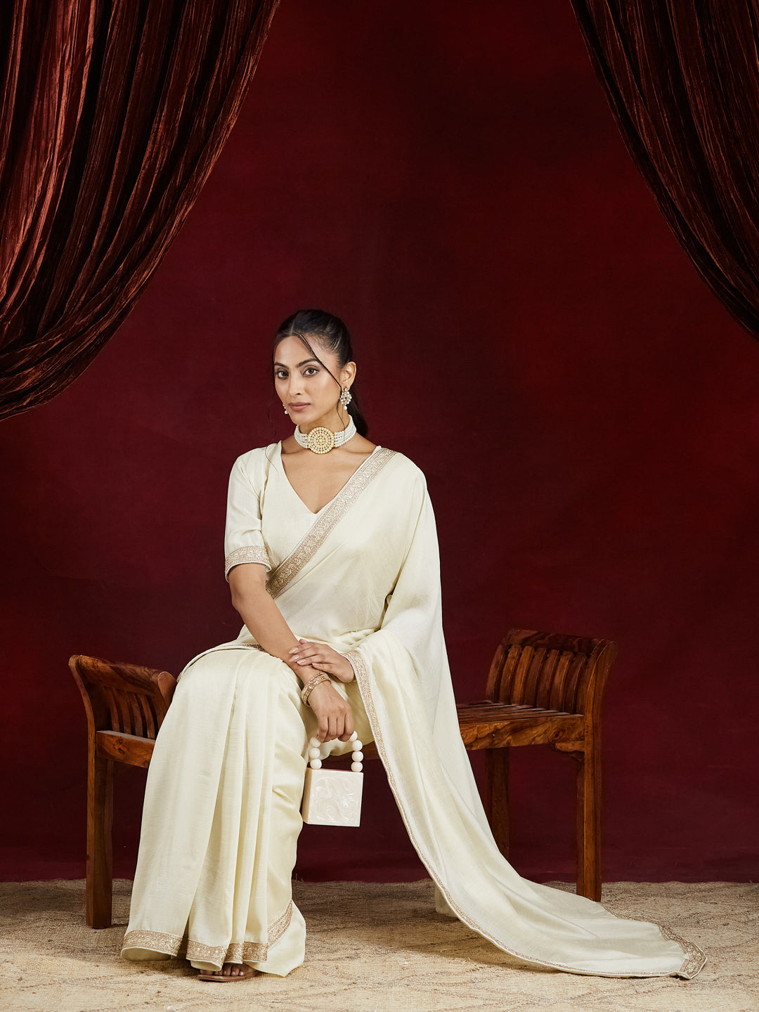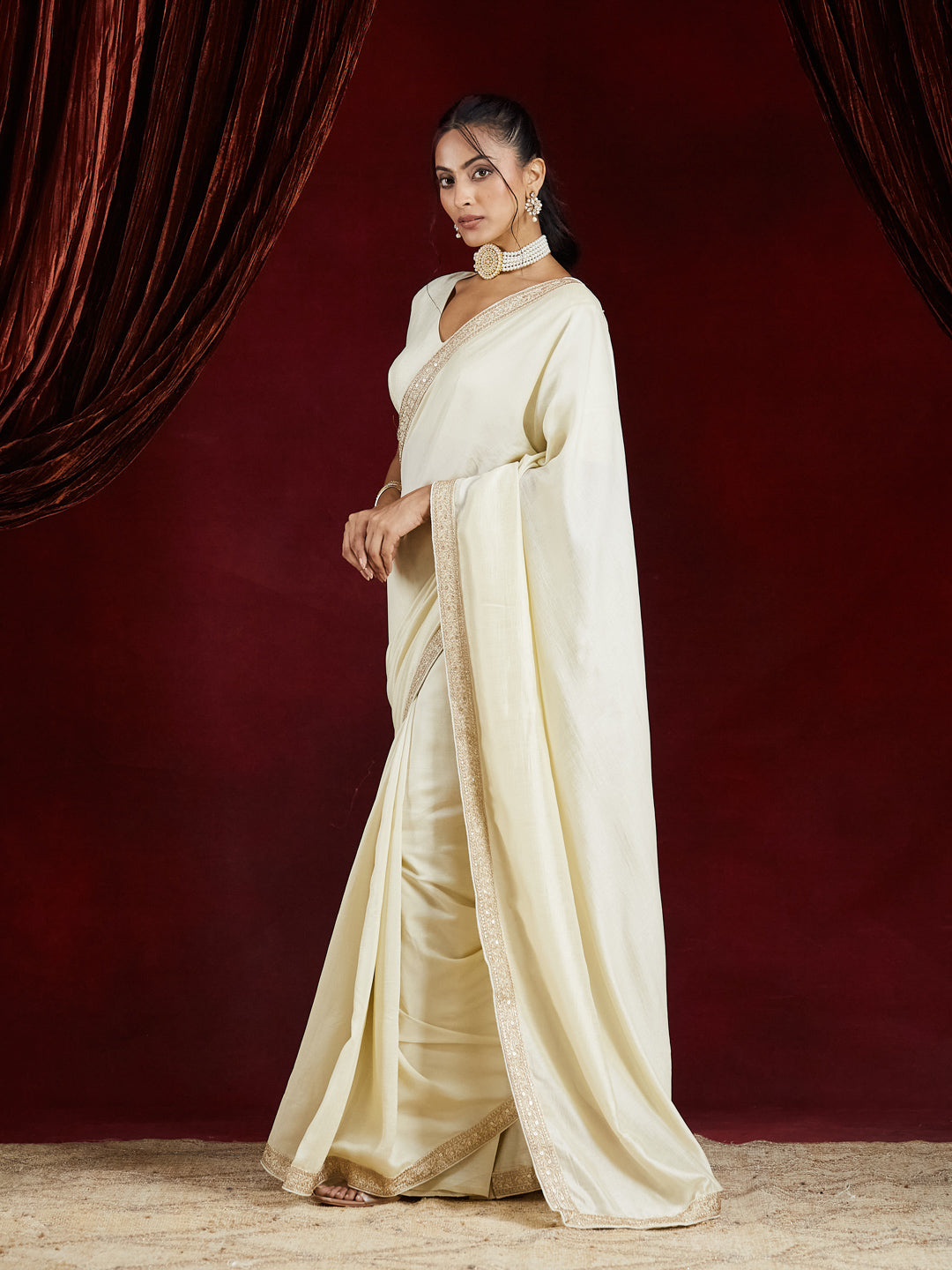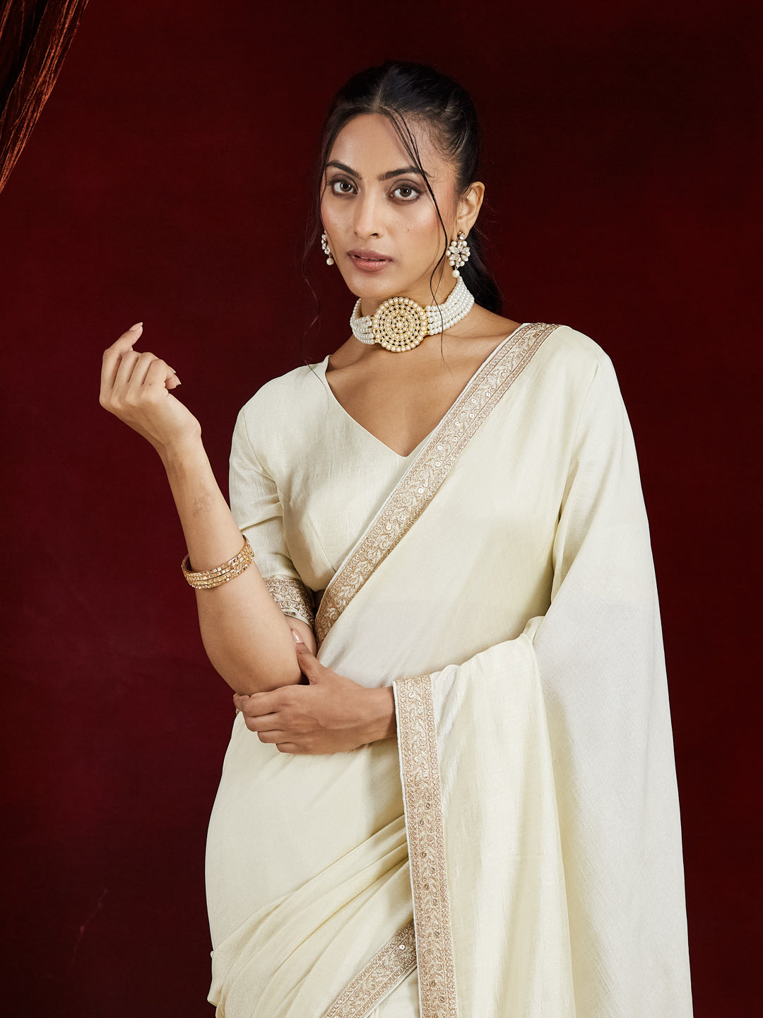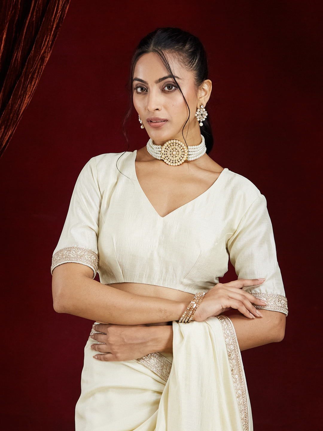 Pair this saree with bold pearl jewellery or oxidized silver accessories for a balanced fusion of grace and glamour. A bun