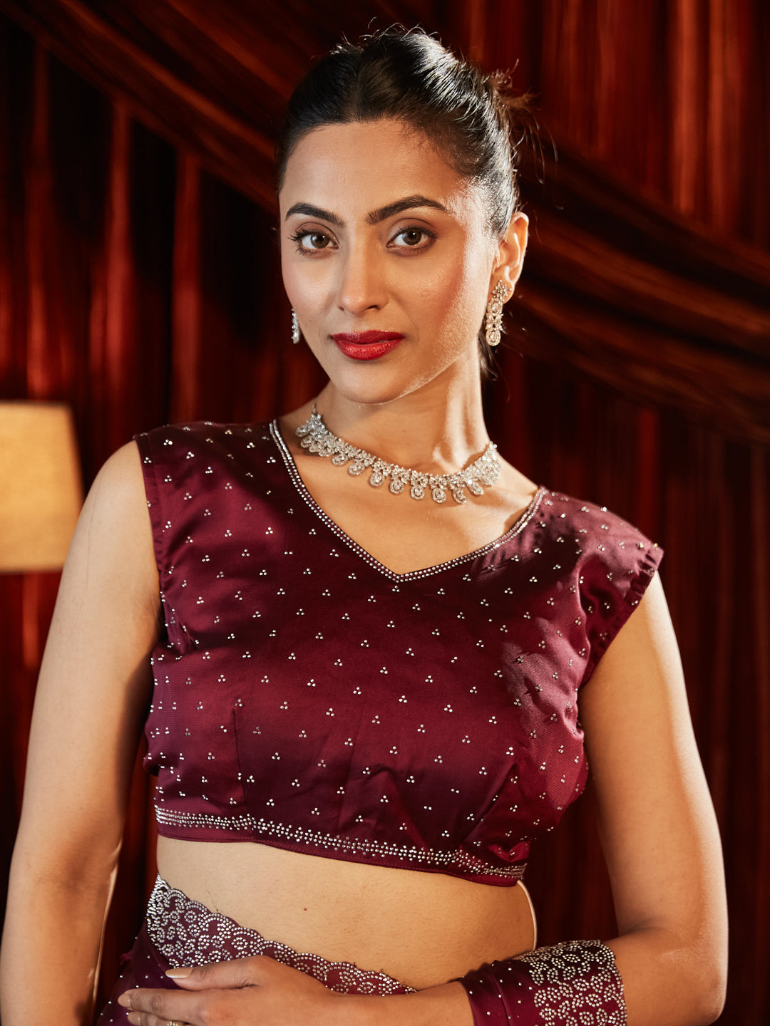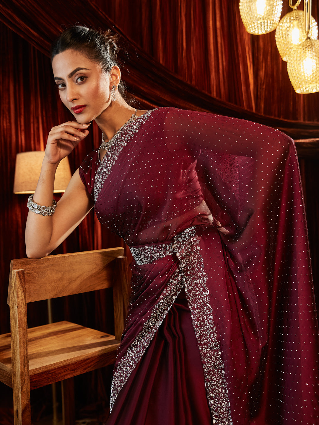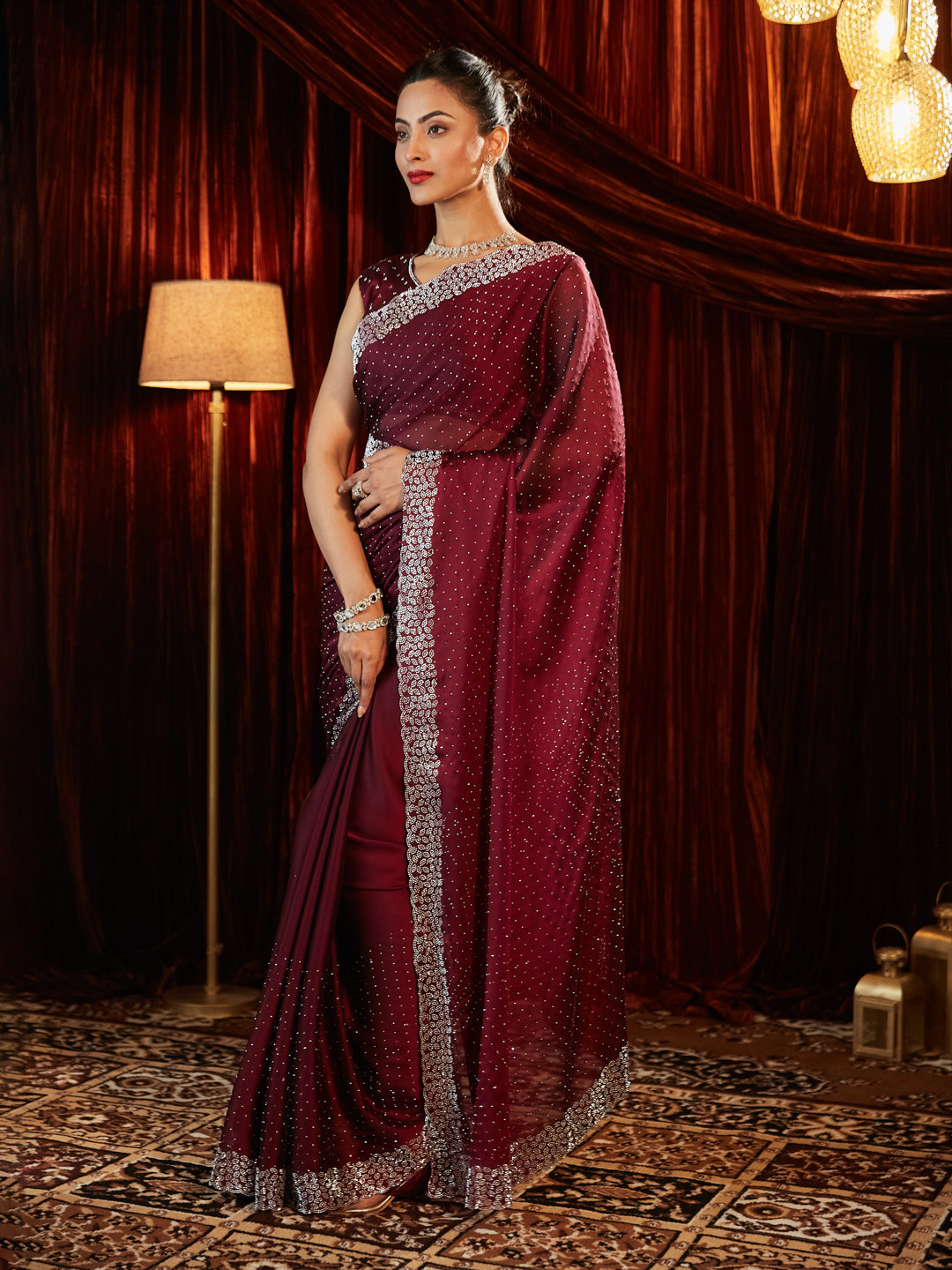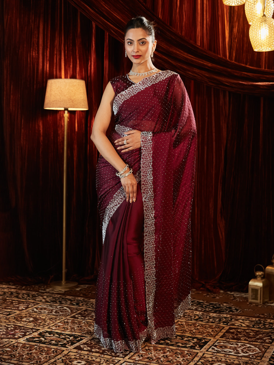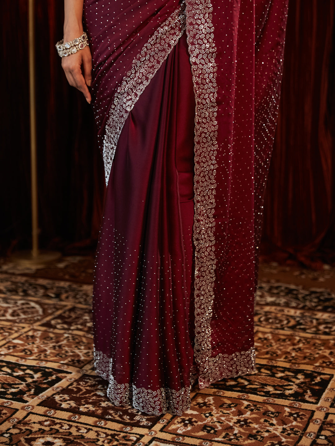Make a striking entrance in this rose silk blend saree, exquisitely embellished with sparkling sequins and finished with a statement floral sequin border. The all-over dotted sequin detailing creates a glamorous shimmer effect, while the floral embroidered edges elevate the overall richness. A perfect pick for receptions, cocktail nights, and festive celebrations.
