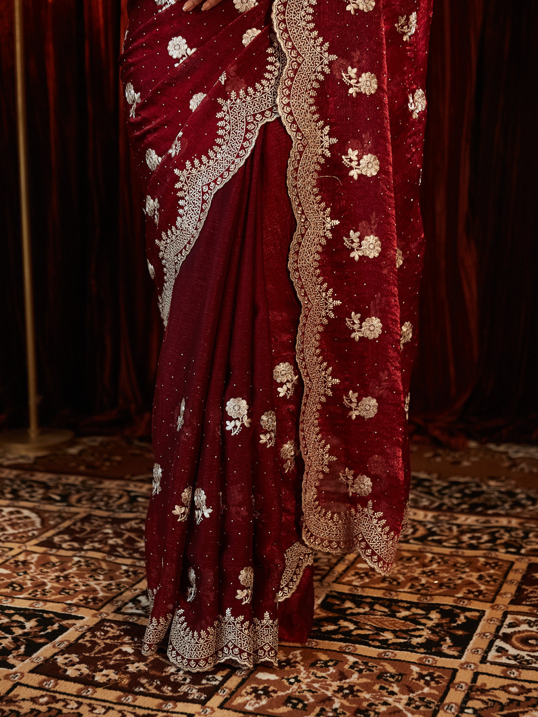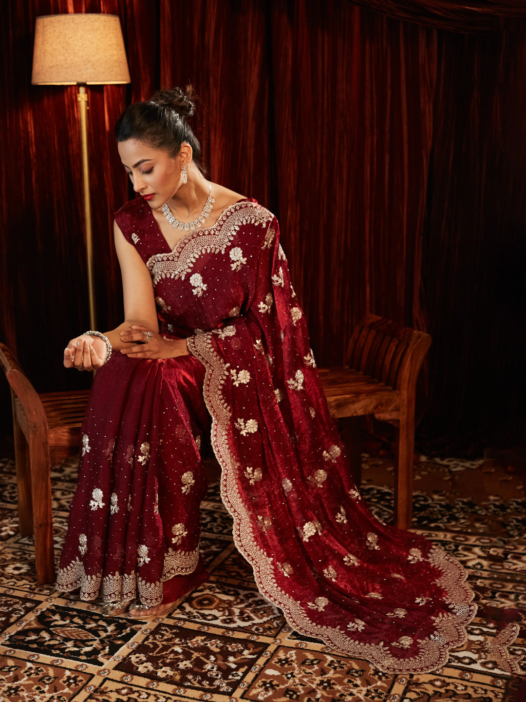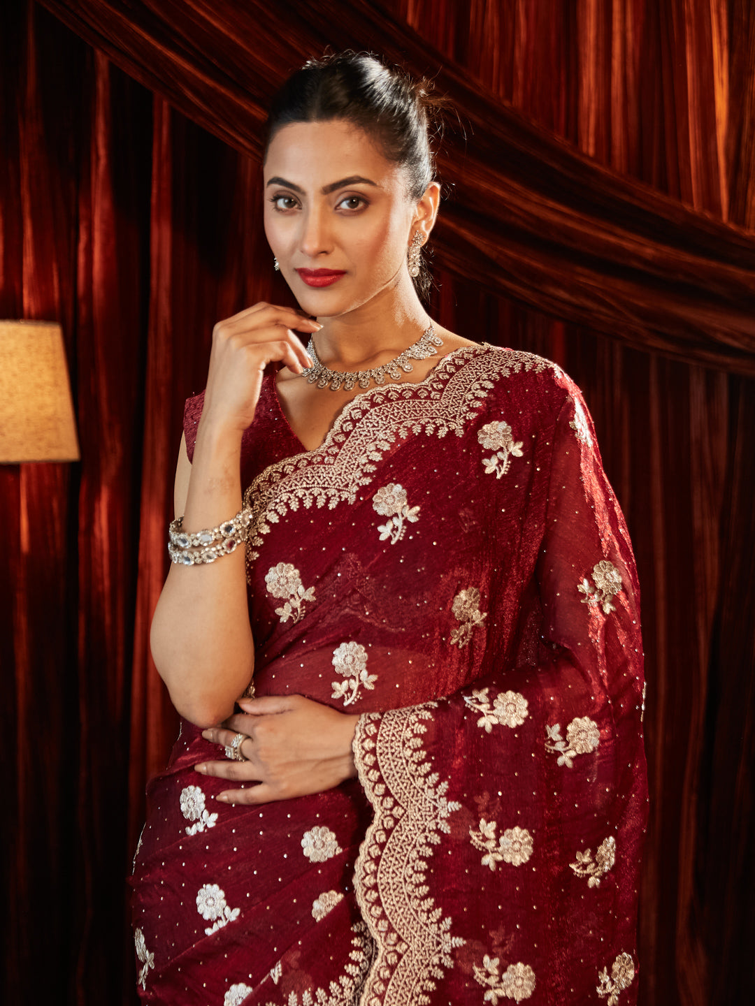 Add a bold and regal flair to your ethnic wardrobe with this maroon embellished chiffon saree, designed for statement occasions. With floral sequin and thread embroidery spread across the body and a rich scalloped lace border, this saree is perfect for weddings, bridal functions, and festive evenings. The unstitched blouse features coordinated embroidery to complete the glam look.