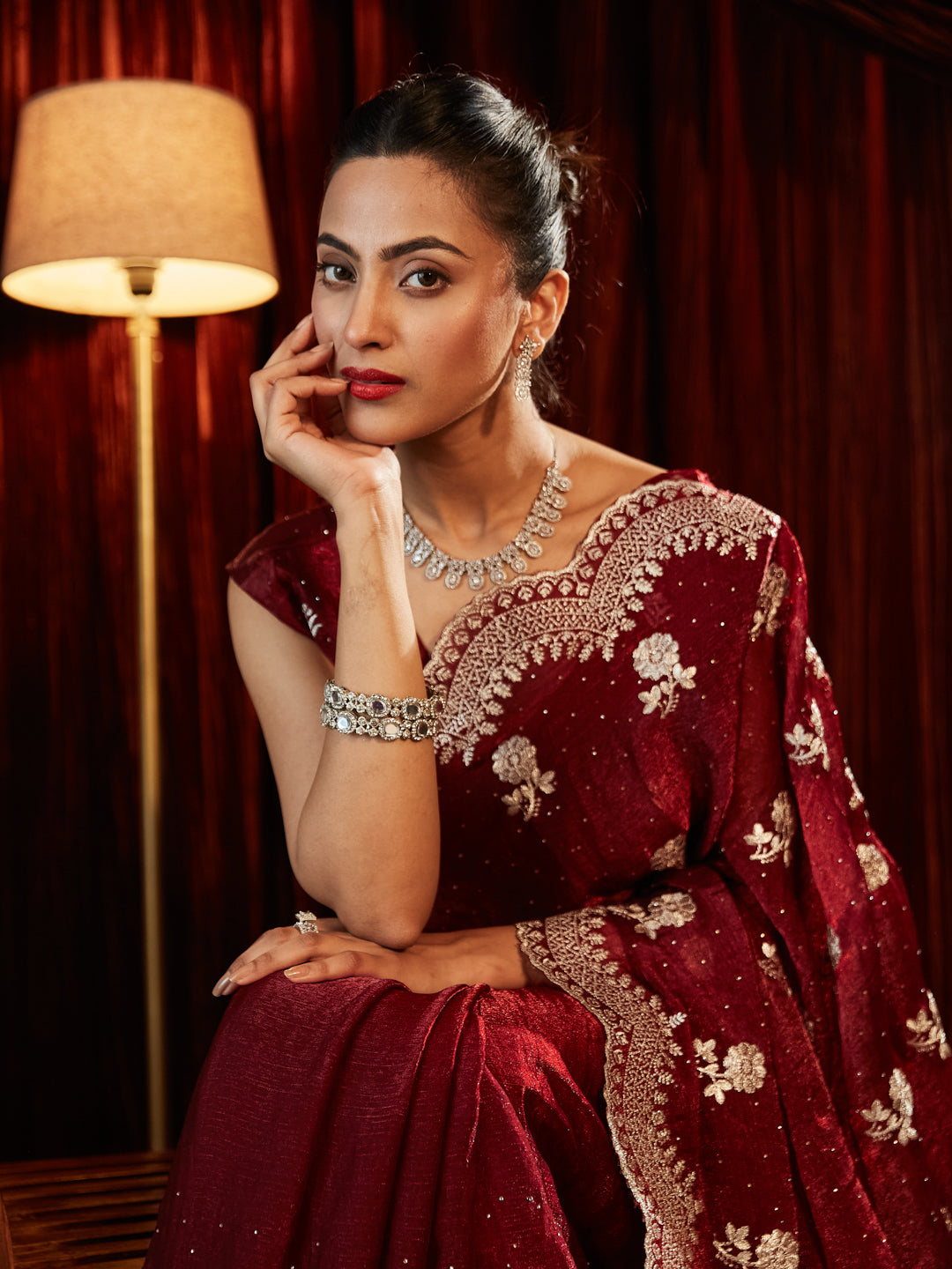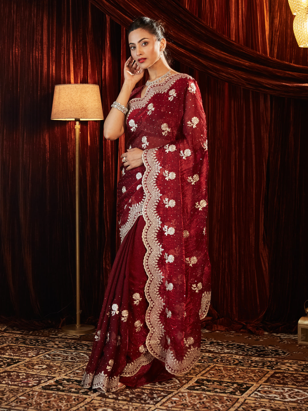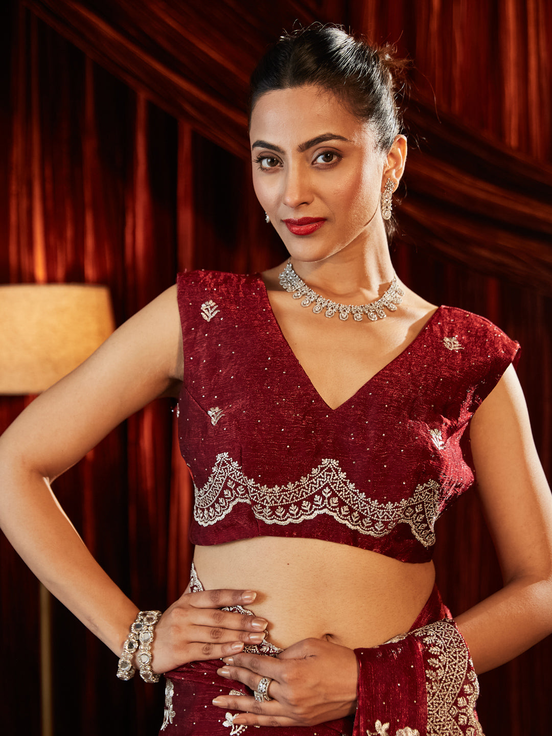 Add a bold and regal flair to your ethnic wardrobe with this maroon embellished chiffon saree, designed for statement occasions. With floral sequin and thread embroidery spread across the body and a rich scalloped lace border, this saree is perfect for weddings, bridal functions, and festive evenings. The unstitched blouse features coordinated embroidery to complete the glam look.