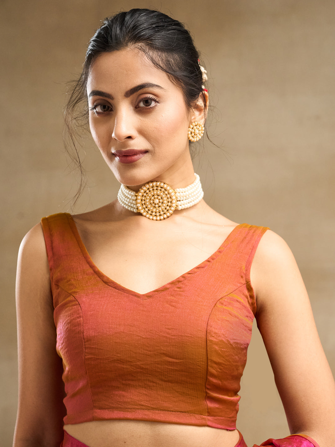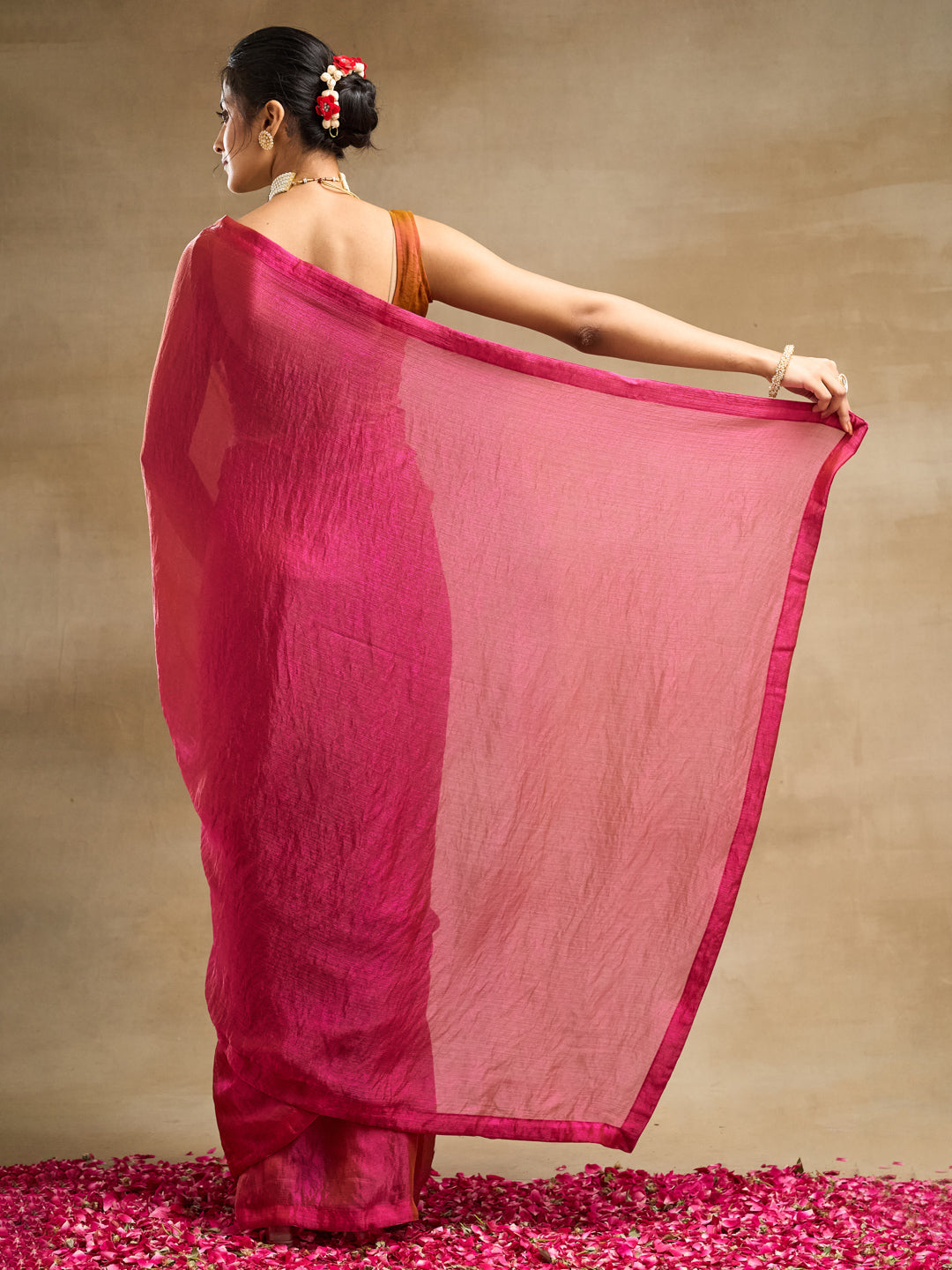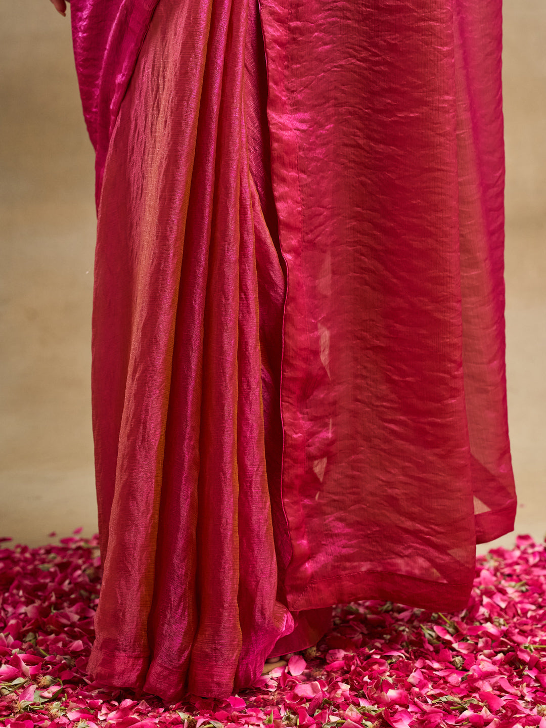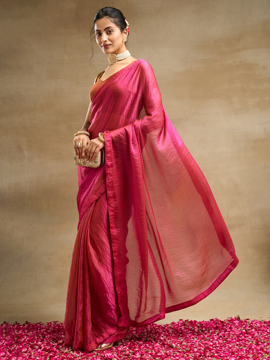 Capture the spotlight in this elegant pink saree crafted from soft organza and satin silk. With a sheer pallu and subtle shimmer detailing, this saree strikes the perfect balance between modern glam and timeless charm. The rich color and minimal embellishment make it ideal for cocktail evenings, festive occasions, or intimate celebrations.