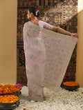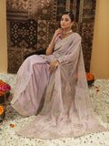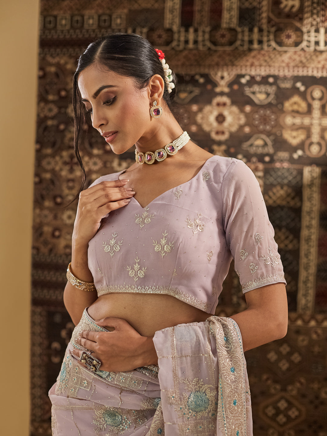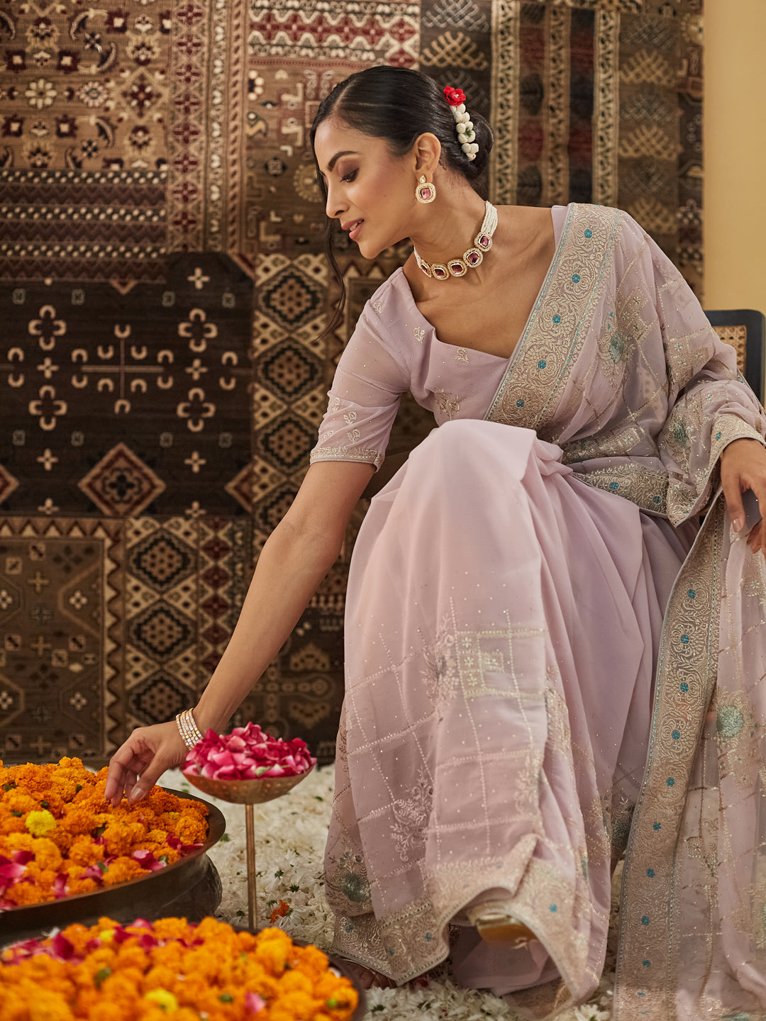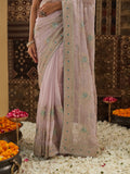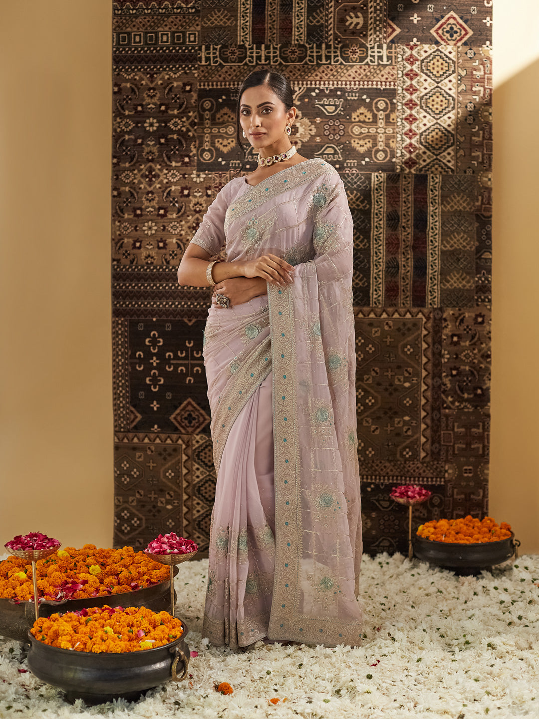 This beautifully crafted dusty mauve saree exudes regal elegance with its heavy golden zari embroidery and aqua blue sequin floral accents. The border features intricately detailed floral motifs, framed with a dual-tone zari and sequin edge that lends a rich texture. The fabric appears to be net or organza, providing a light, sheer base for the bold embroidery to stand out. Scattered tiny sequins throughout the body add a subtle sparkle.Pair this saree with a deep aqua or muted gold blouse for contrast. Go for a choker set with hints of turquoise or pearl, and keep the makeup warm with peach or coral undertones. A low sleek bun or side-parted waves will elevate the look. Choose metallic heels and a stone-encrusted clutch to complete this royal ensemble.