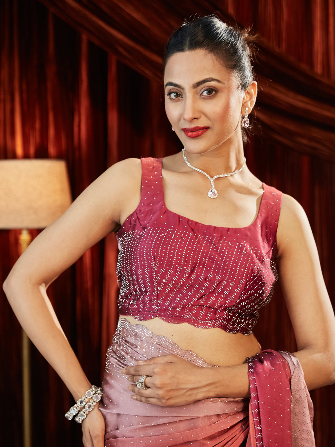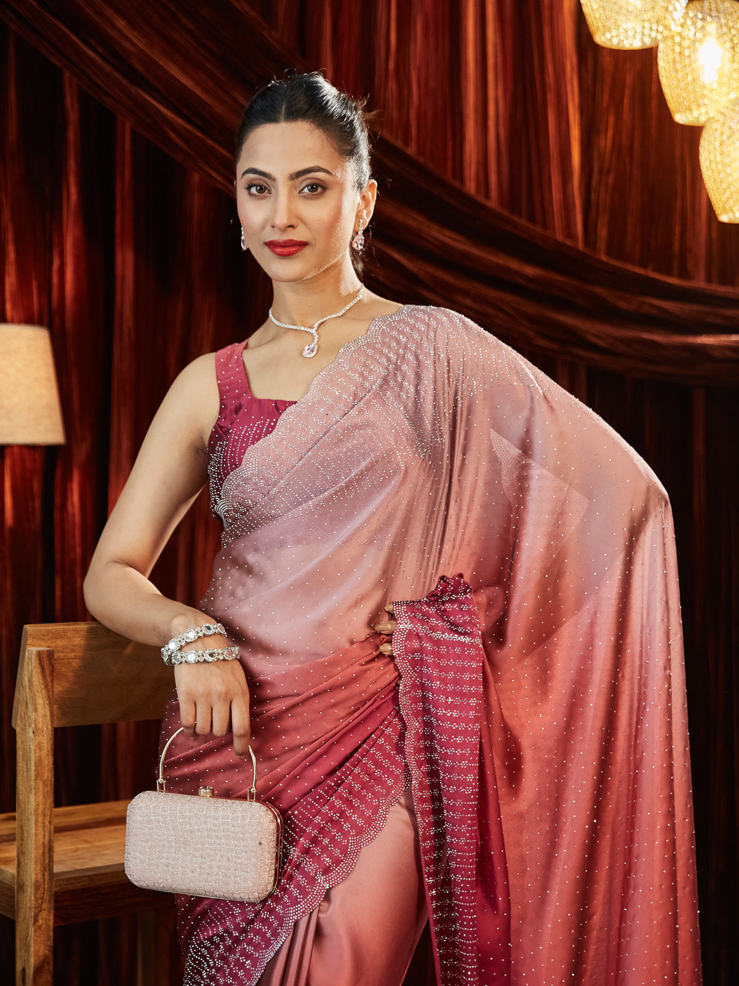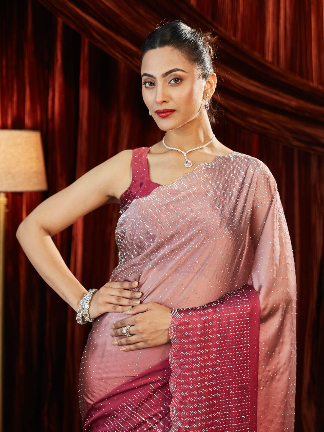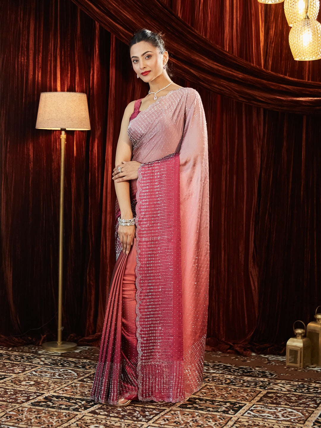 Graceful and dreamy, this Ombre silk blend saree flows from a soft blush tone into deep rose, adorned with shimmering dotted sequins throughout. The scalloped border is highlighted with delicate beads and stone work, offering a beautiful finish for festive wear, cocktail events, or bridal parties. Pair it with diamond jewelry for a refined, feminine look.