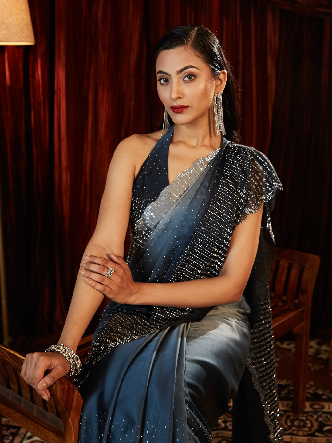 Graceful and dreamy, this Ombre silk blend saree flows from a soft blush tone into deep turquoise blue, adorned with shimmering dotted sequins throughout. The scalloped border is highlighted with delicate beads and stone work, offering a beautiful finish for festive wear, cocktail events, or bridal parties. Pair it with diamond jewelry for a refined, feminine look.