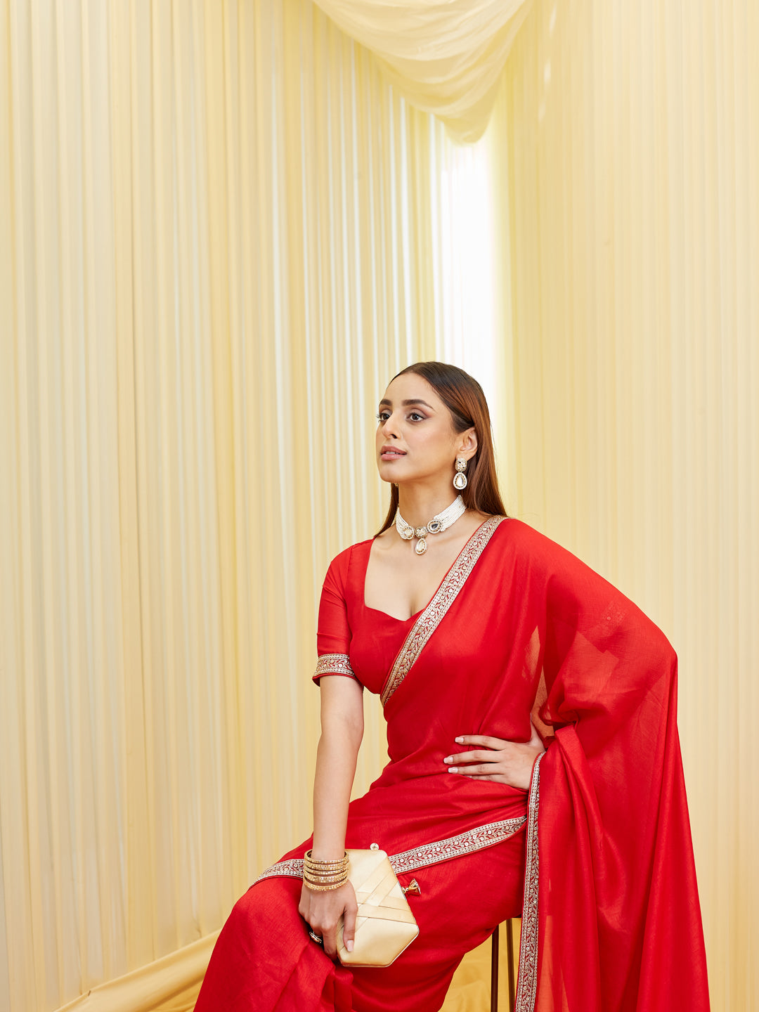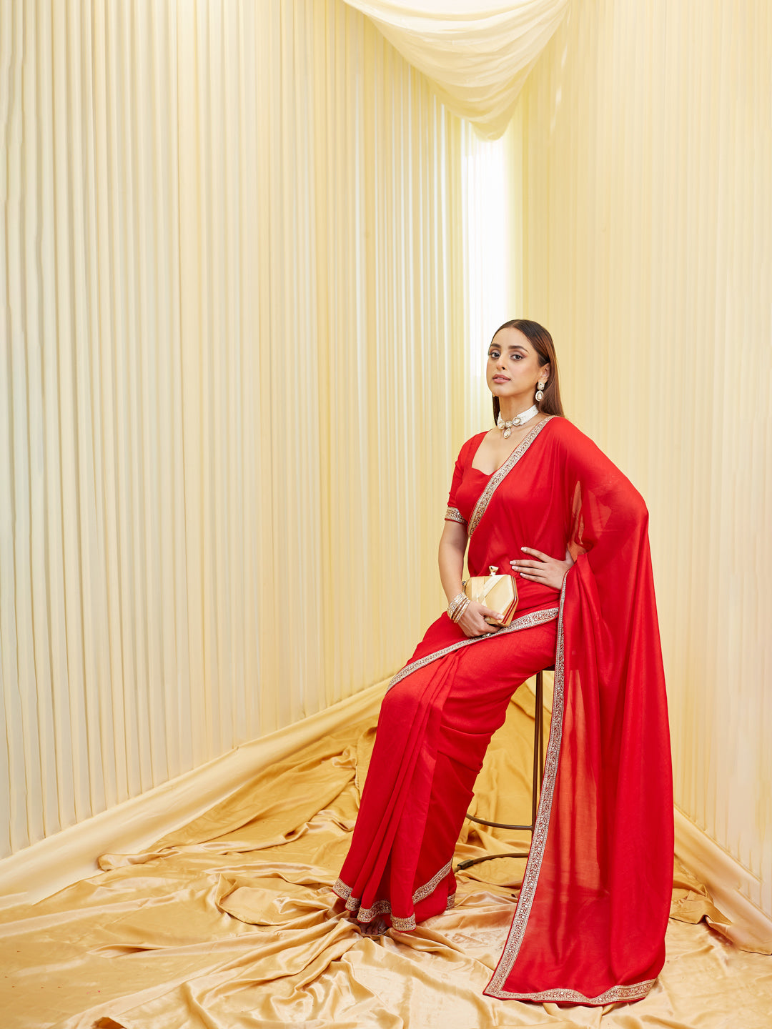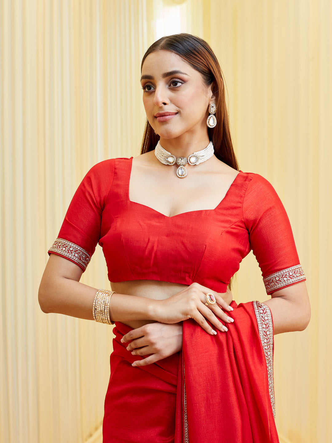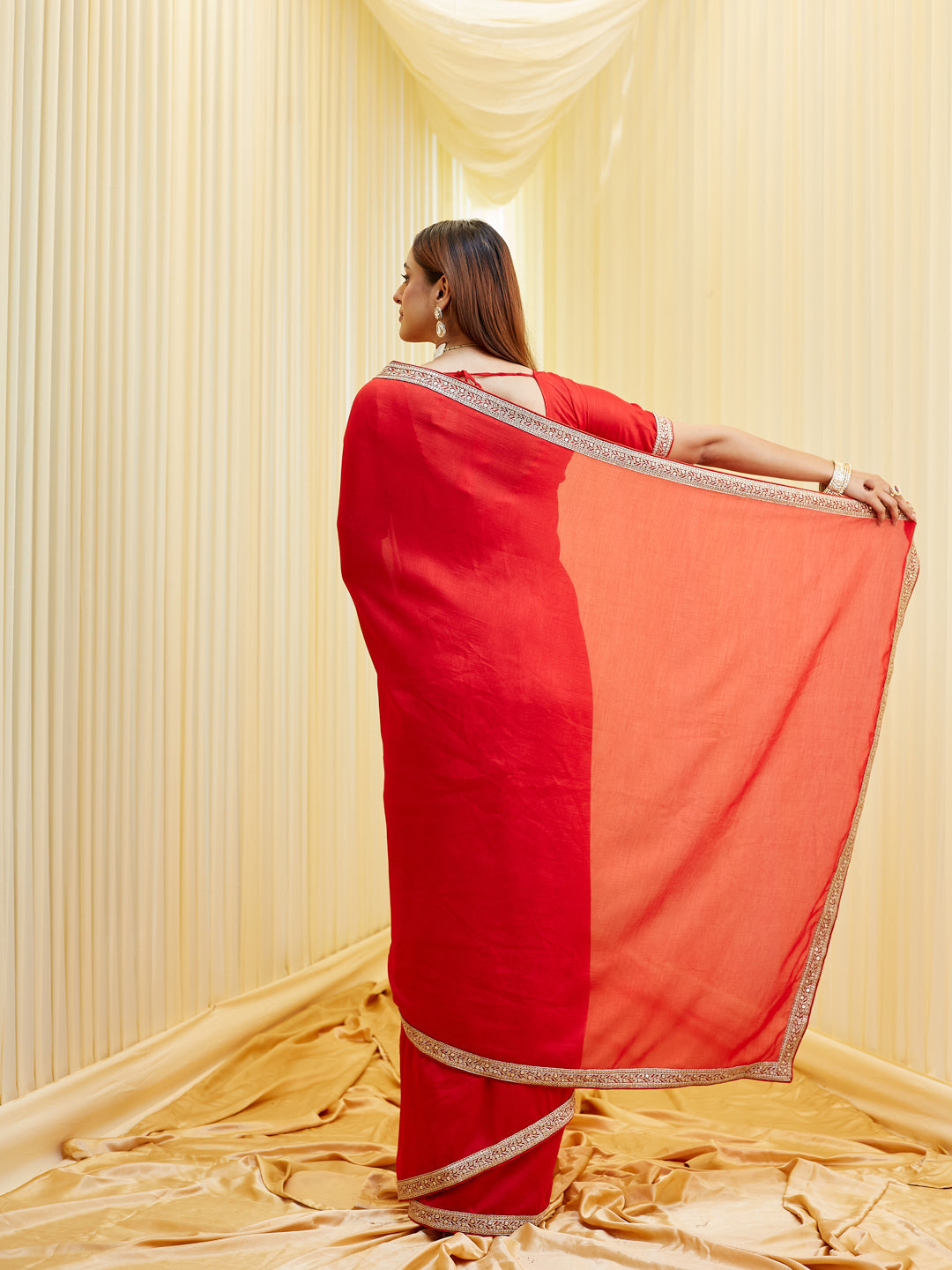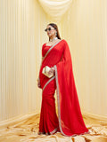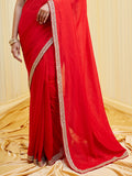 Exude effortless elegance with this serene red saree crafted in a silk cotton blend fabric, perfect for both day and evening occasions. The simplicity of the solid body is beautifully elevated by a narrow yet refined zari embroidered border, featuring intricate patterns in beige-gold tones that catch the light subtly.This saree is a timeless addition to your ethnic wardrobe — ideal for minimalistic festive looks, intimate weddings, or even formal celebrations. The unstitched blouse fabric complements the saree with matching border detailing, allowing you to customize your look effortlessly.
