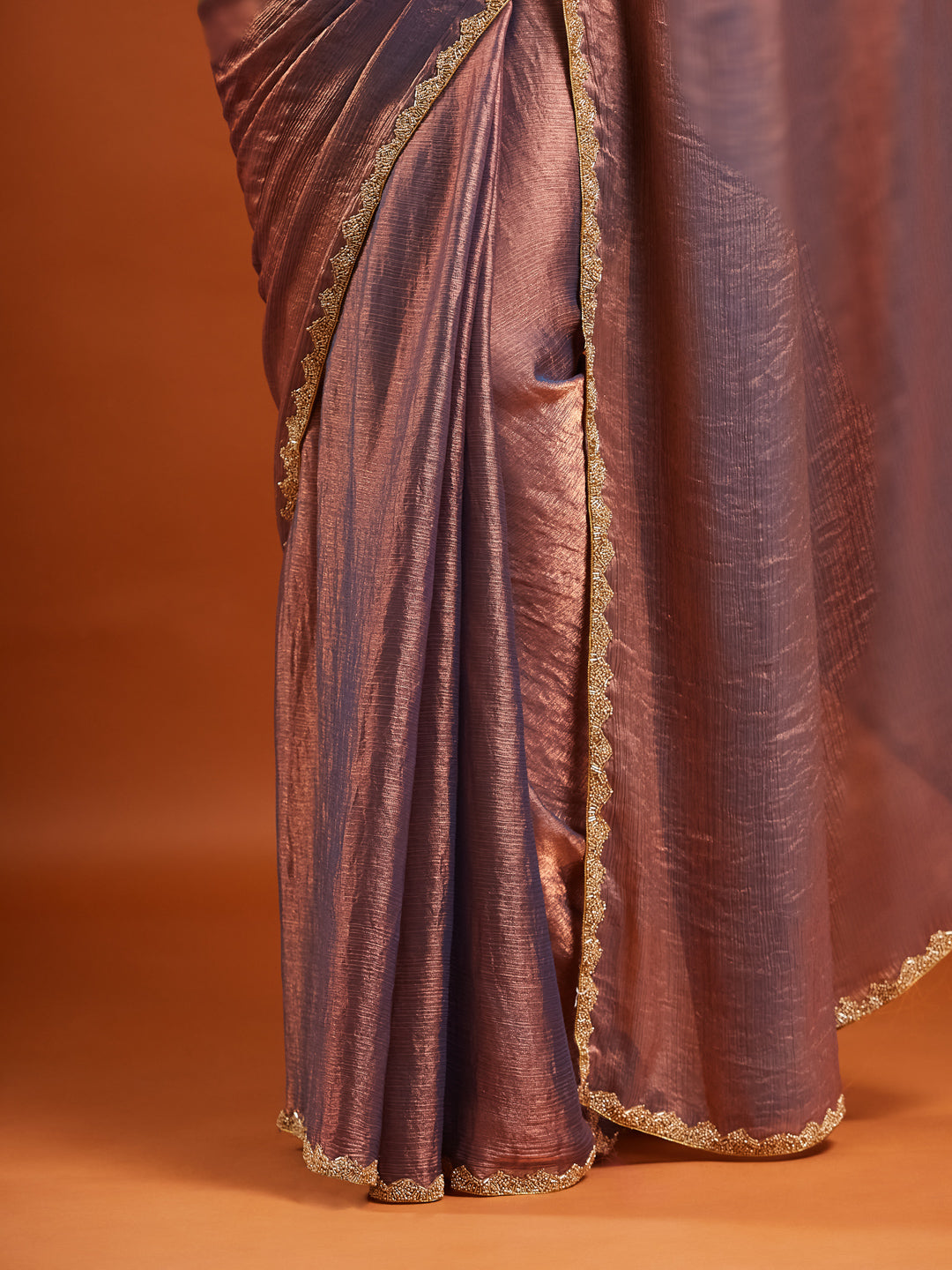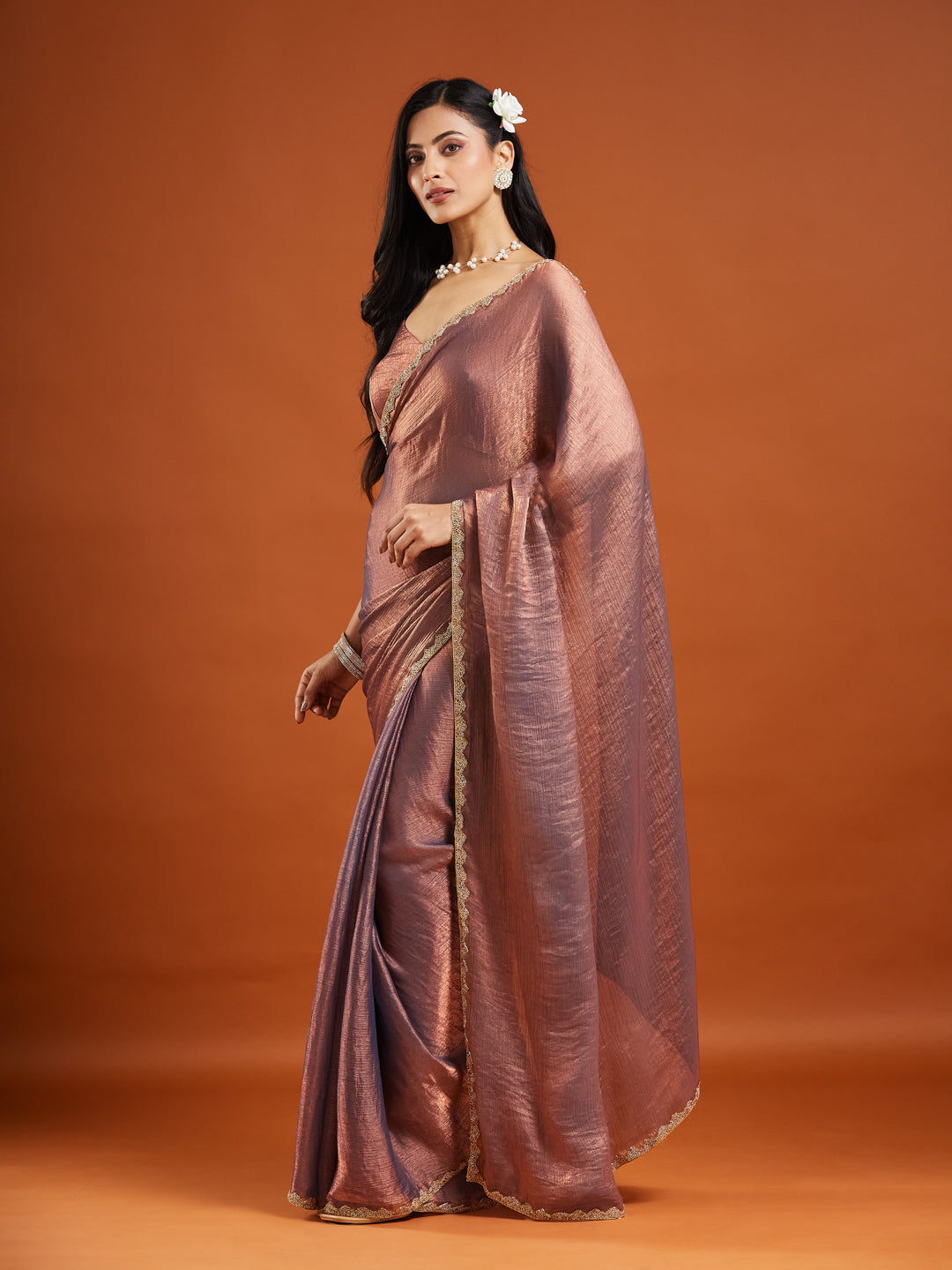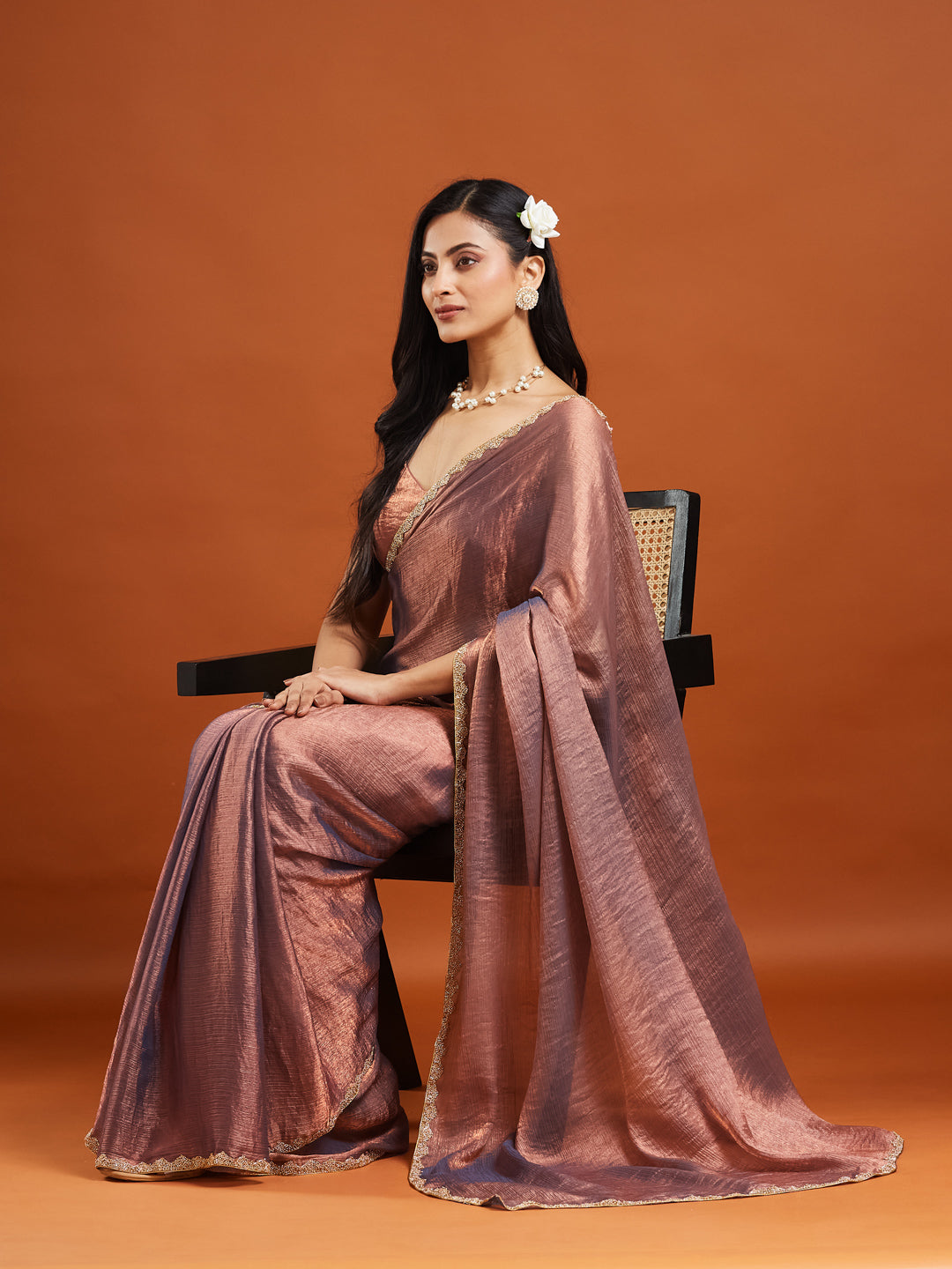Drape yourself in timeless elegance with this antique rust tissue silk saree that radiates warmth, grace, and tradition. The saree features a lustrous texture with a fine crushed finish and a delicate embroidered scalloped border that adds just the right hint of detail. Ideal for festive occasions, haldi ceremonies, or intimate gatherings.