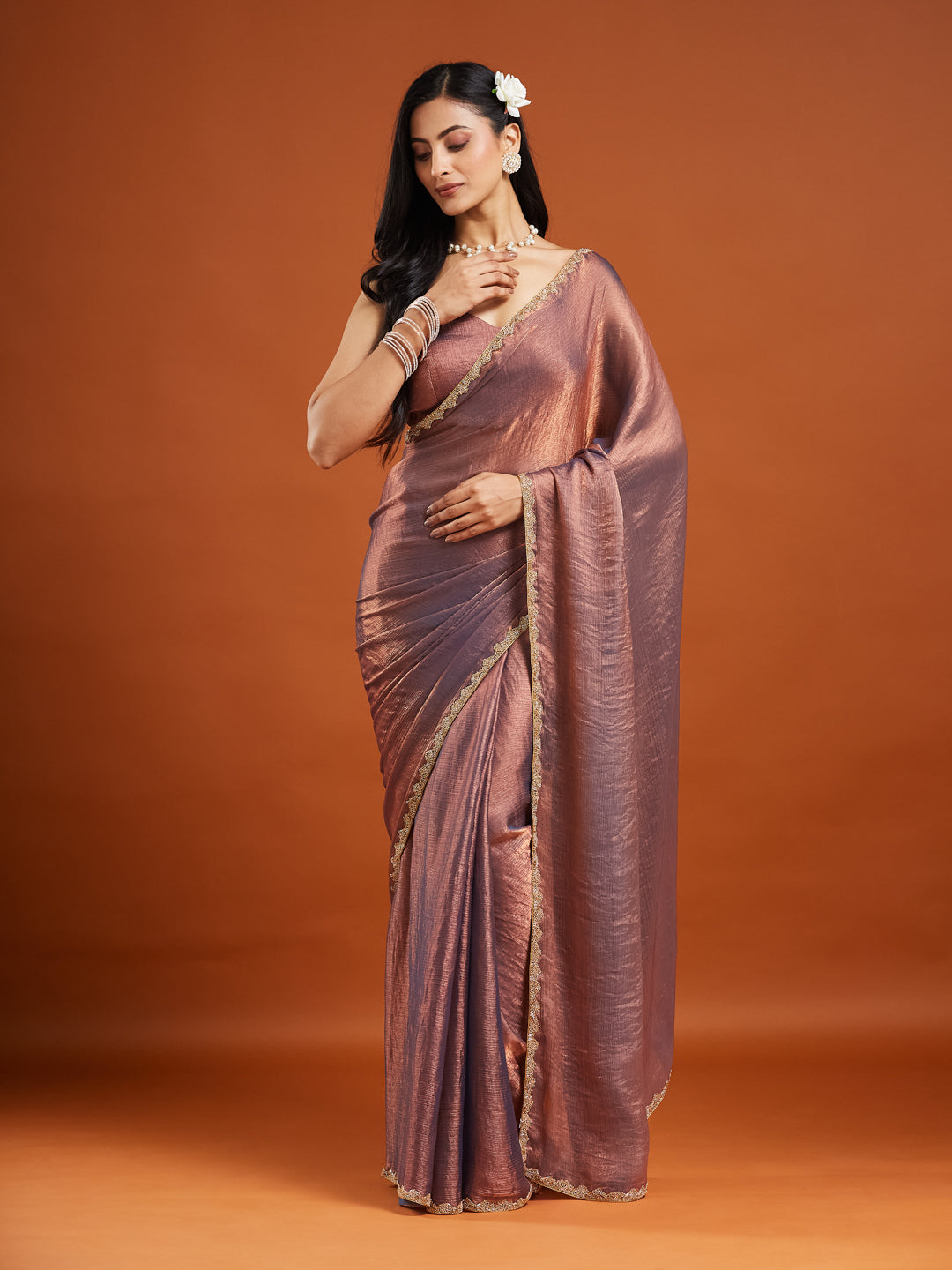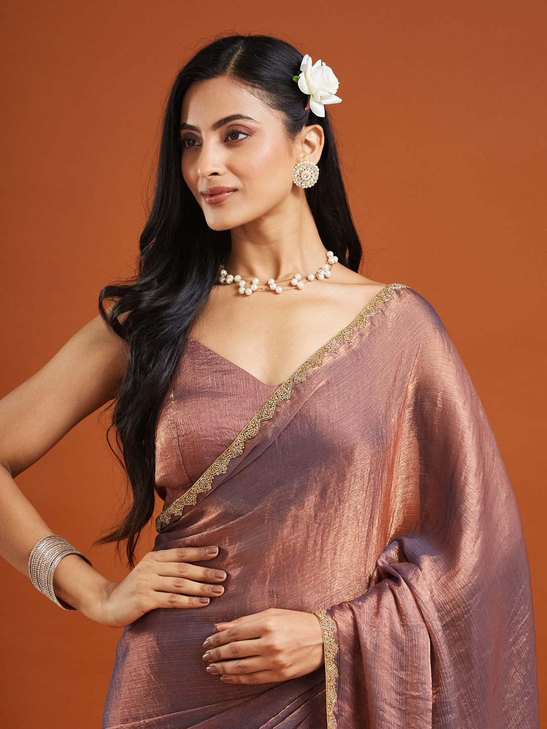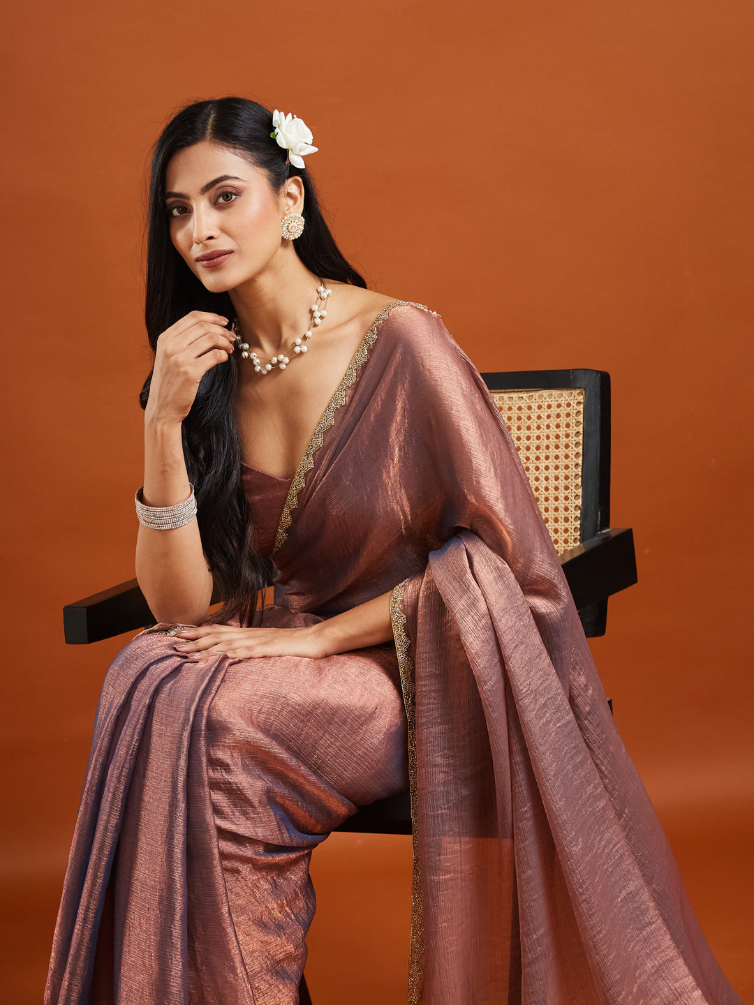 Drape yourself in timeless elegance with this antique rust tissue silk saree that radiates warmth, grace, and tradition. The saree features a lustrous texture with a fine crushed finish and a delicate embroidered scalloped border that adds just the right hint of detail. Ideal for festive occasions, haldi ceremonies, or intimate gatherings.