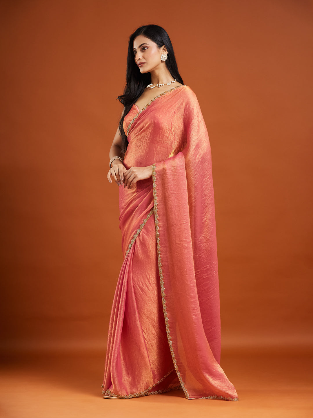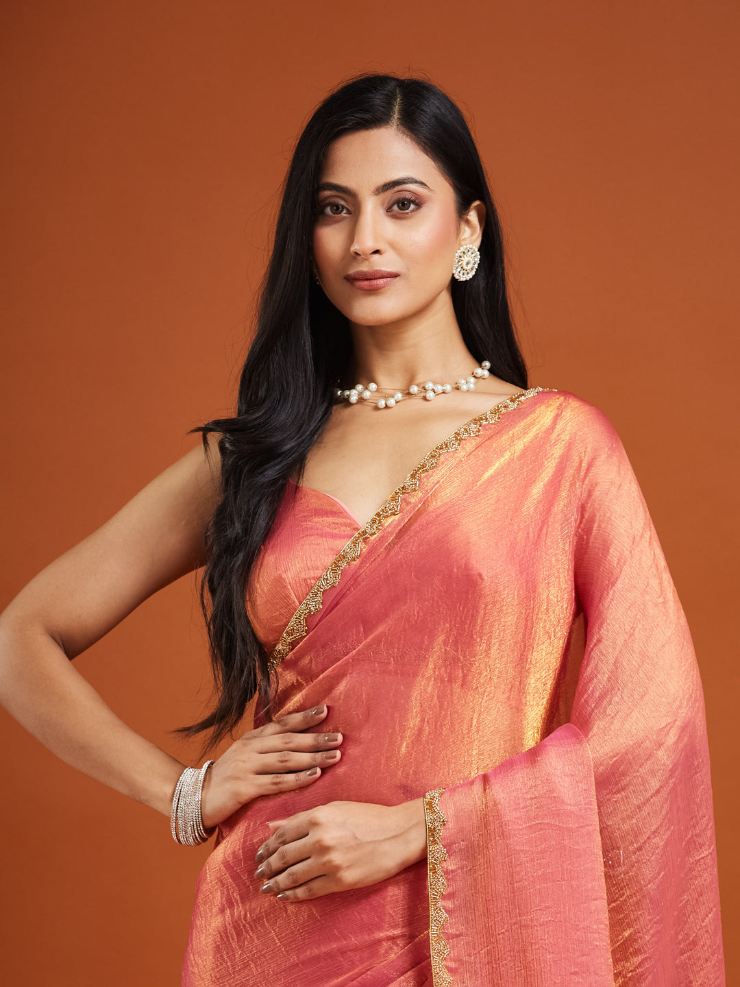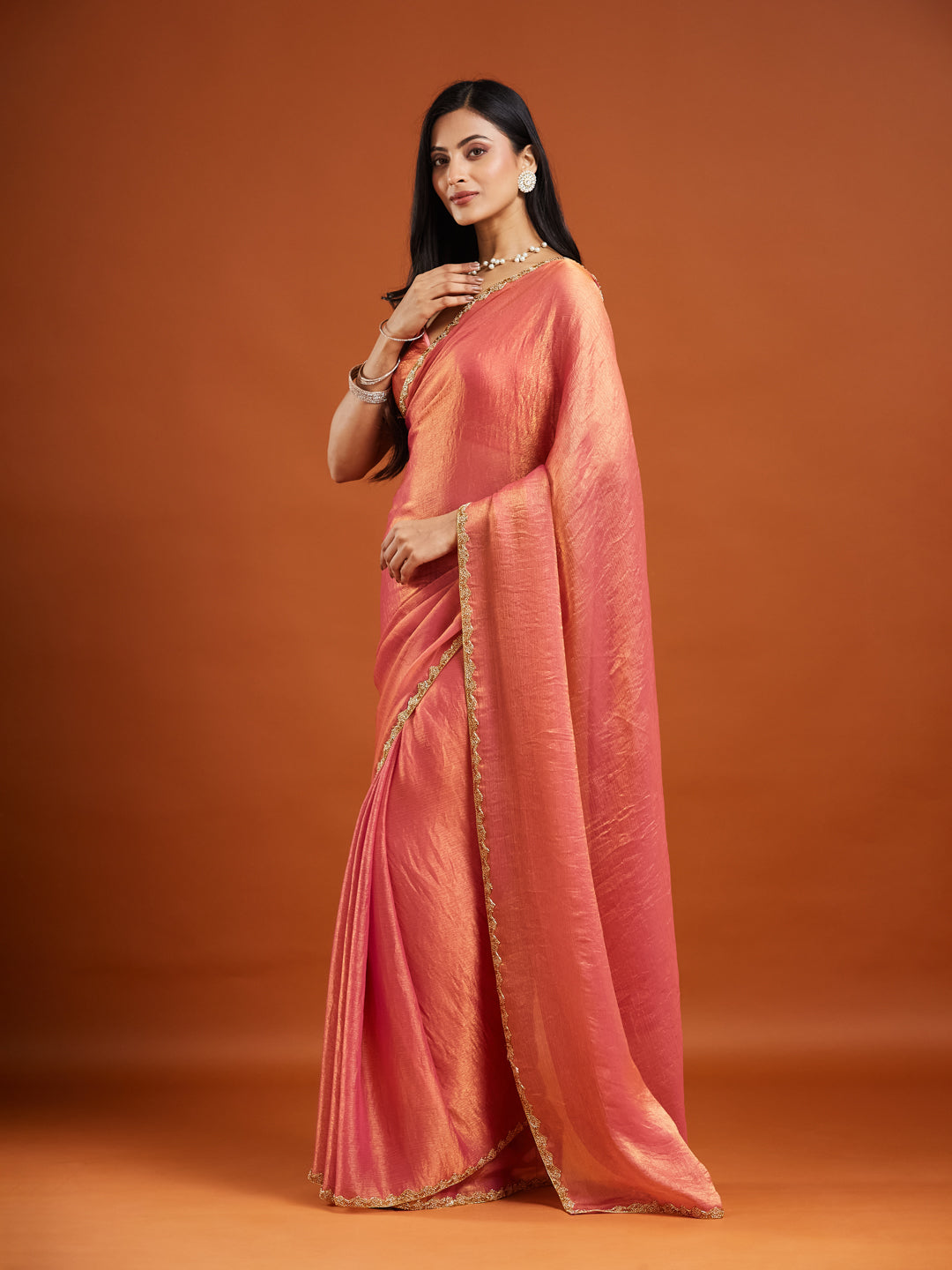 Drape yourself in timeless elegance with this antique pink tissue silk saree that radiates warmth, grace, and tradition. The saree features a lustrous texture with a fine crushed finish and a delicate embroidered scalloped border that adds just the right hint of detail. Ideal for festive occasions, haldi ceremonies, or intimate gatherings.