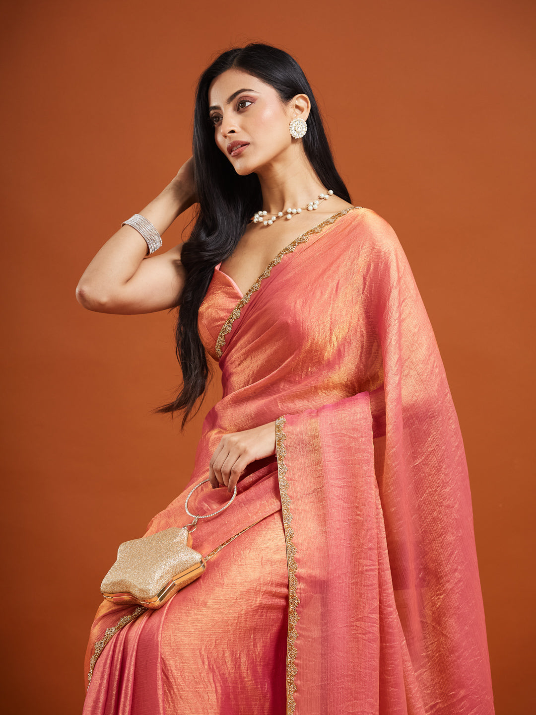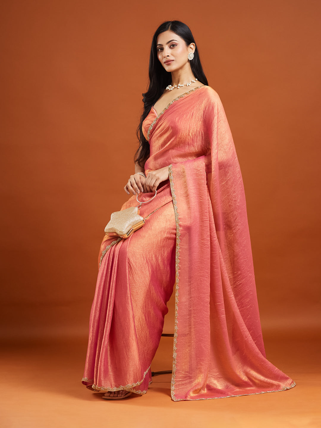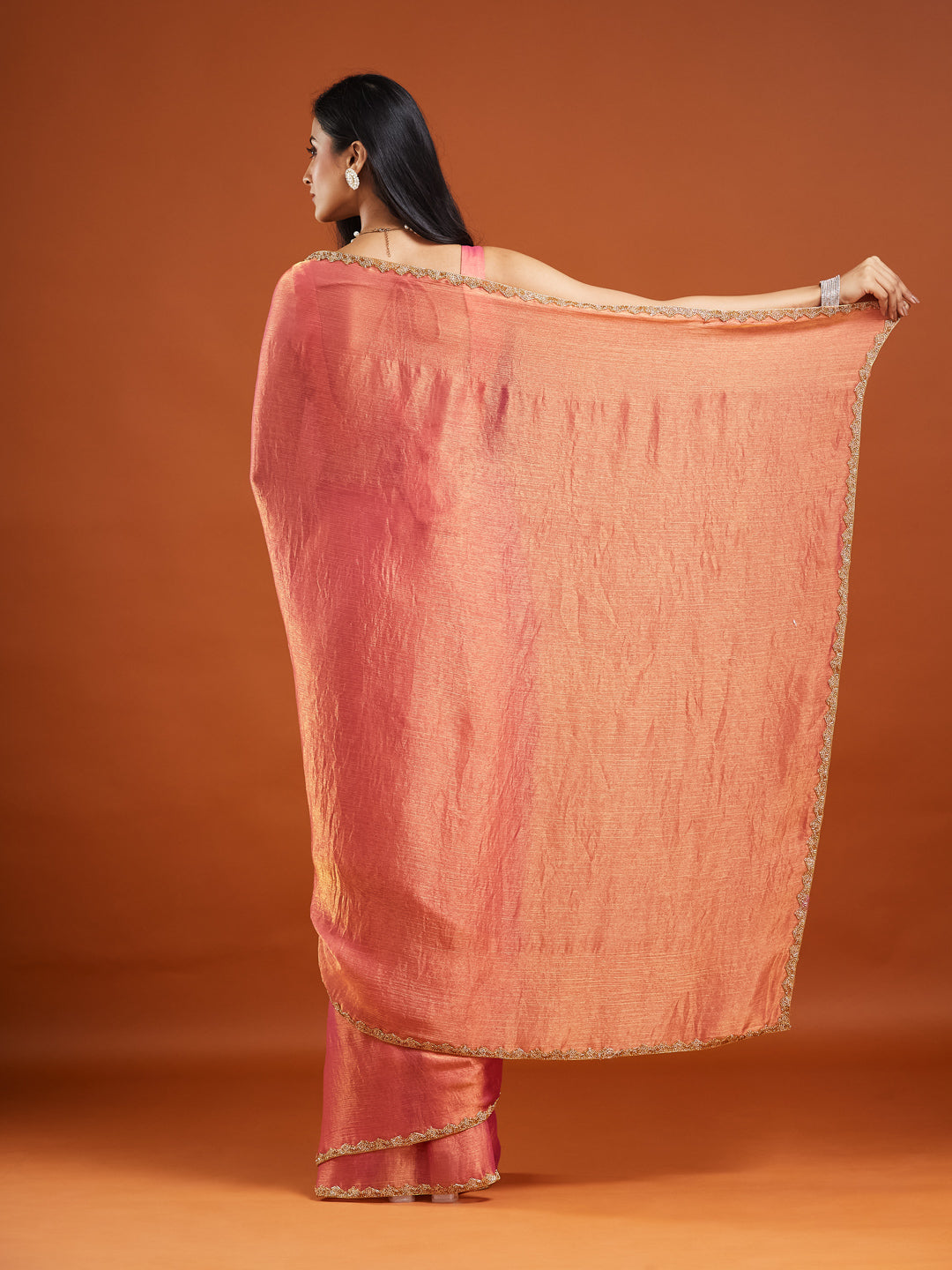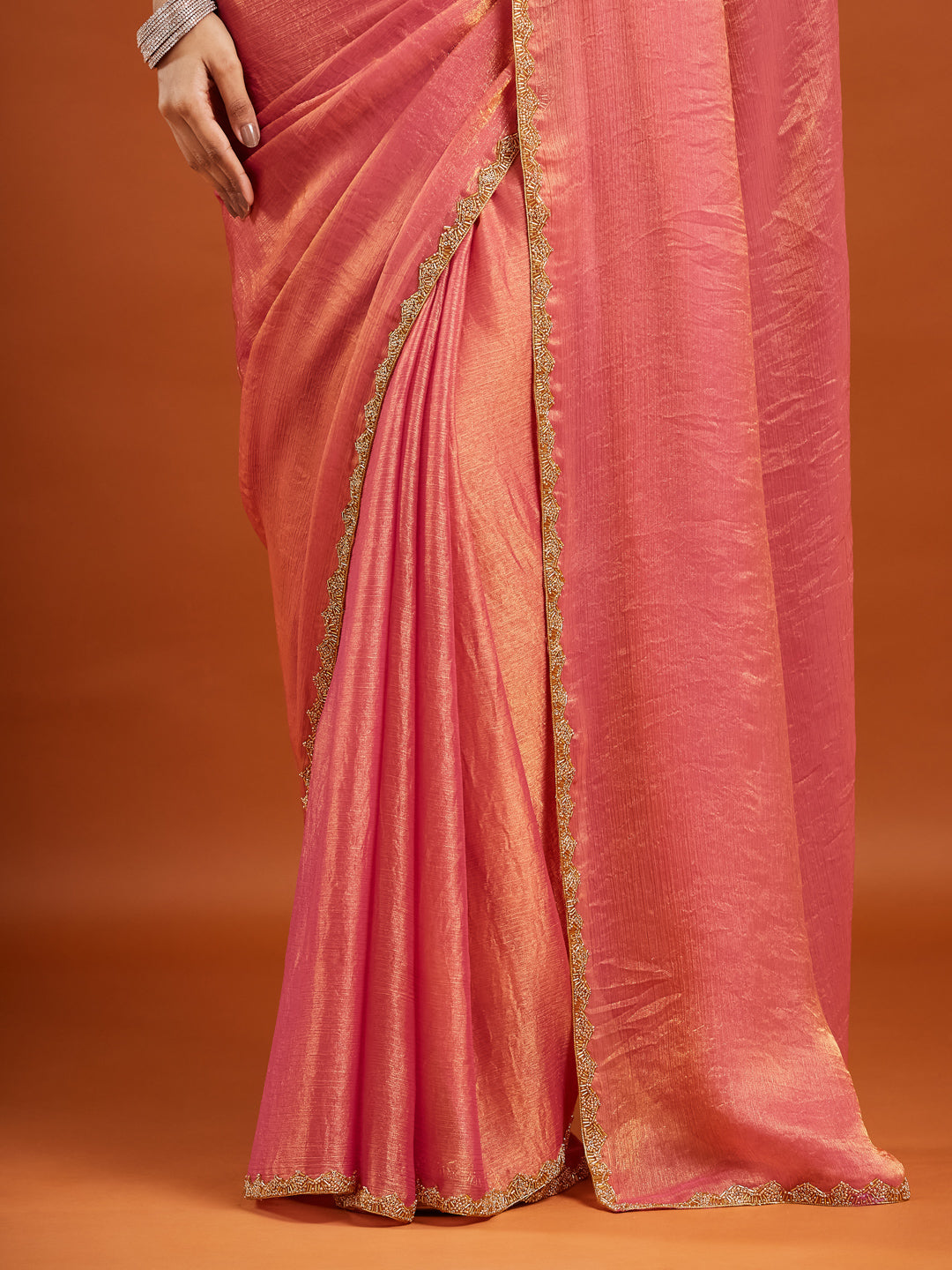 Drape yourself in timeless elegance with this antique pink tissue silk saree that radiates warmth, grace, and tradition. The saree features a lustrous texture with a fine crushed finish and a delicate embroidered scalloped border that adds just the right hint of detail. Ideal for festive occasions, haldi ceremonies, or intimate gatherings.