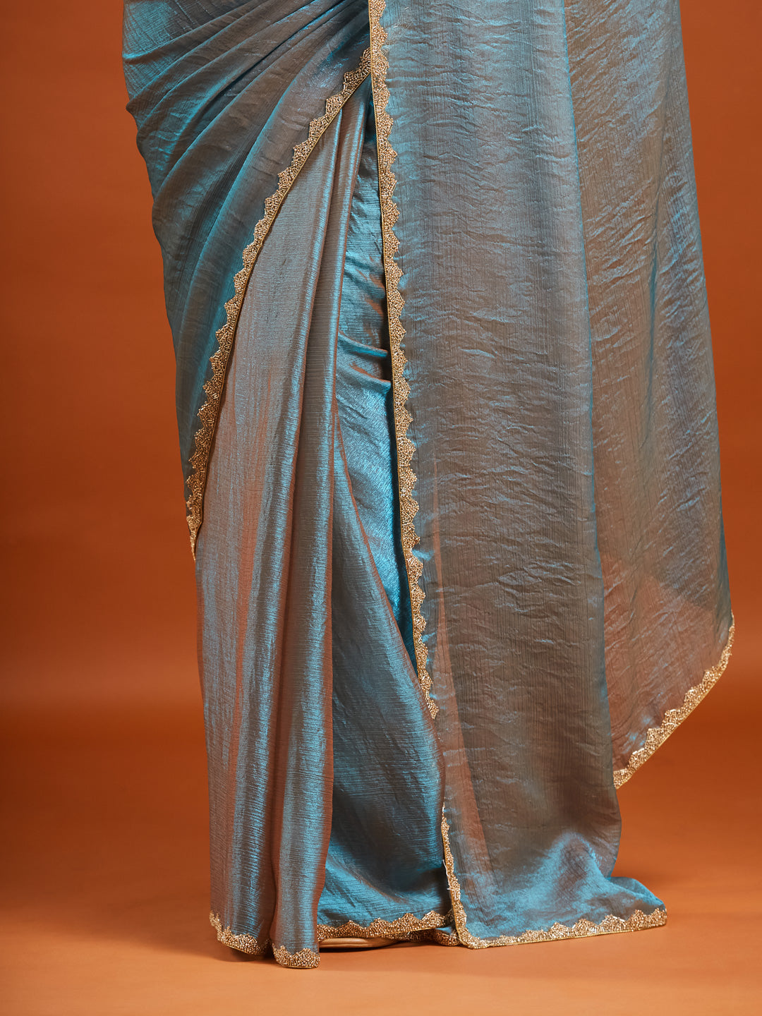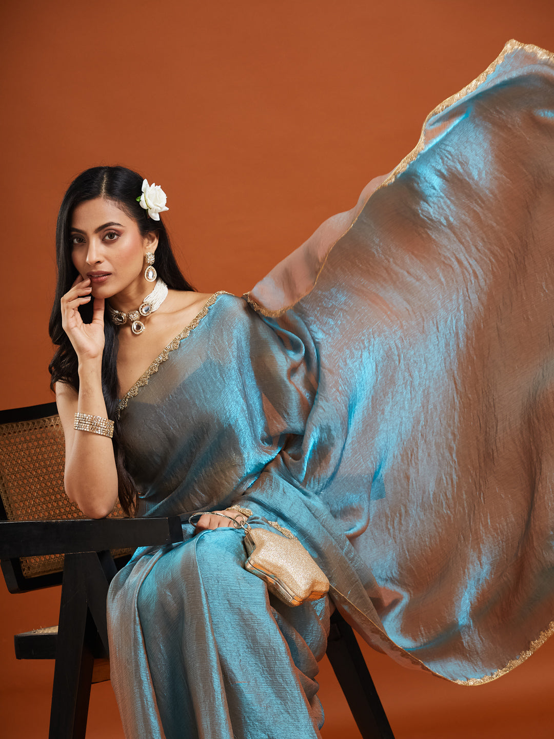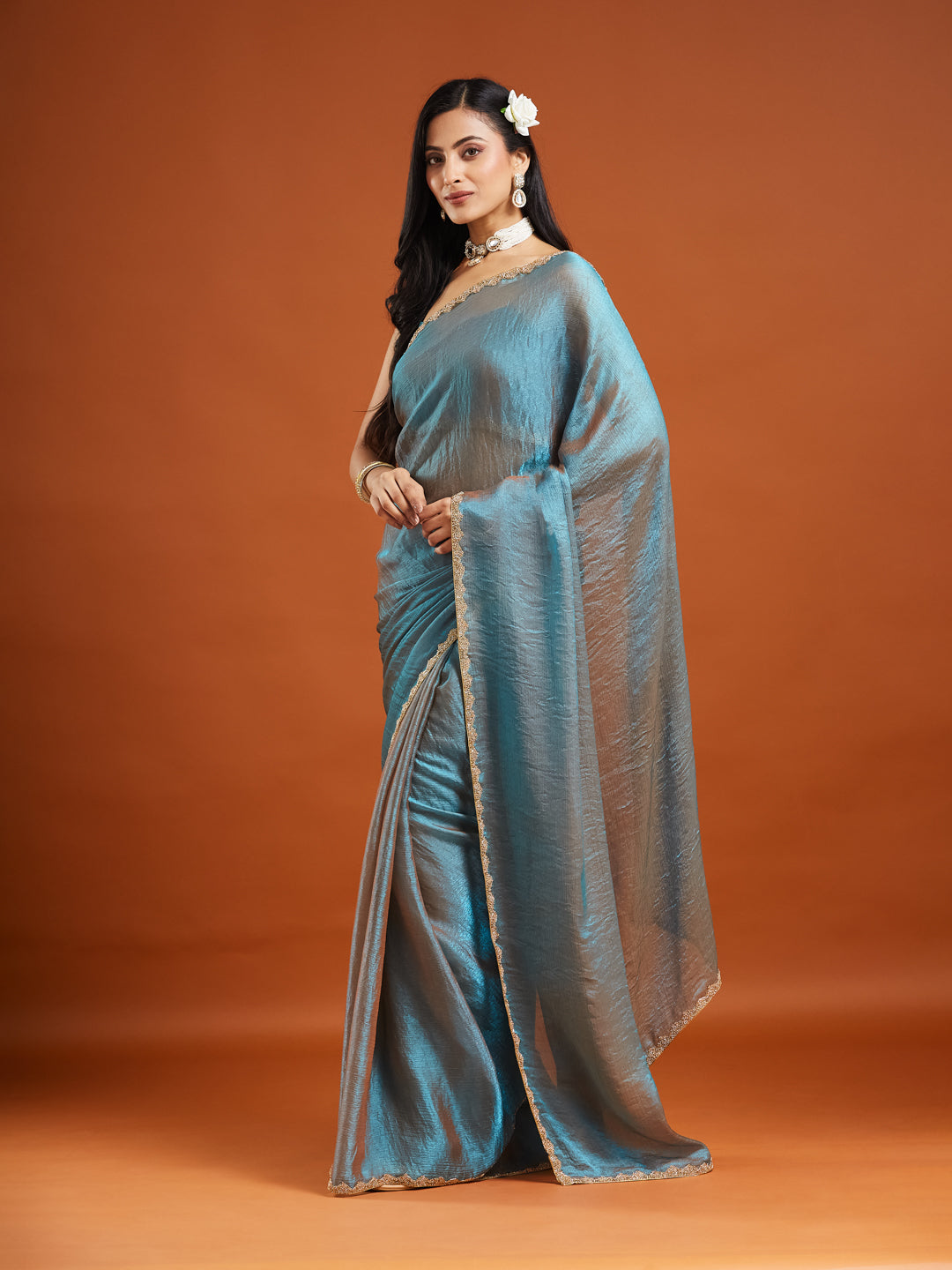 Drape yourself in timeless elegance with this antique teal tissue silk saree that radiates warmth, grace, and tradition. The saree features a lustrous texture with a fine crushed finish and a delicate embroidered scalloped border that adds just the right hint of detail. Ideal for festive occasions, haldi ceremonies, or intimate gatherings.