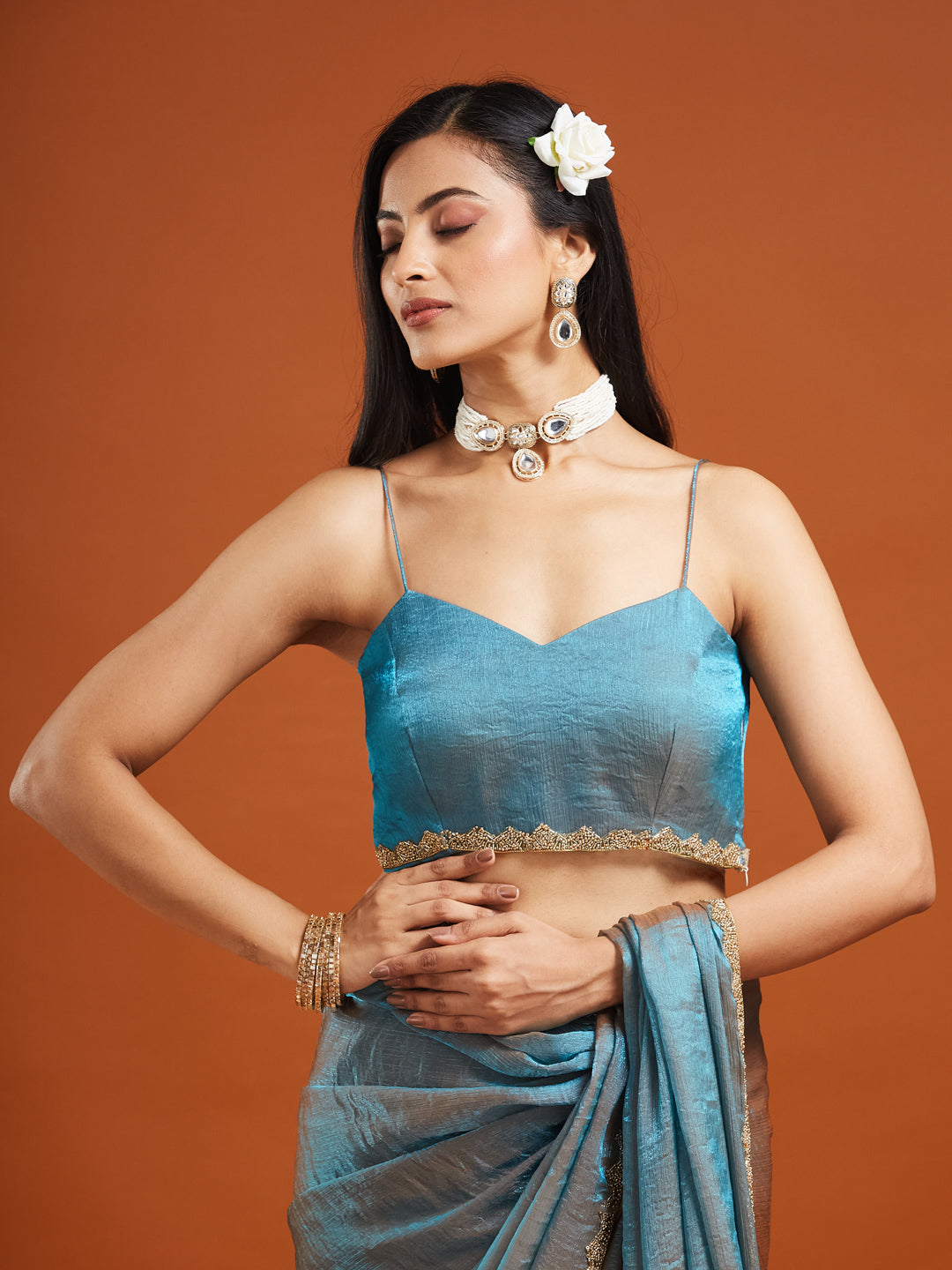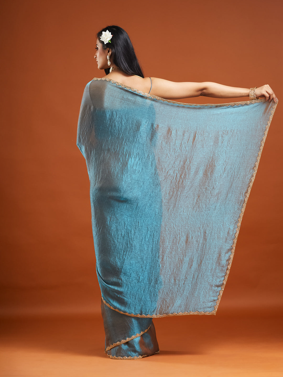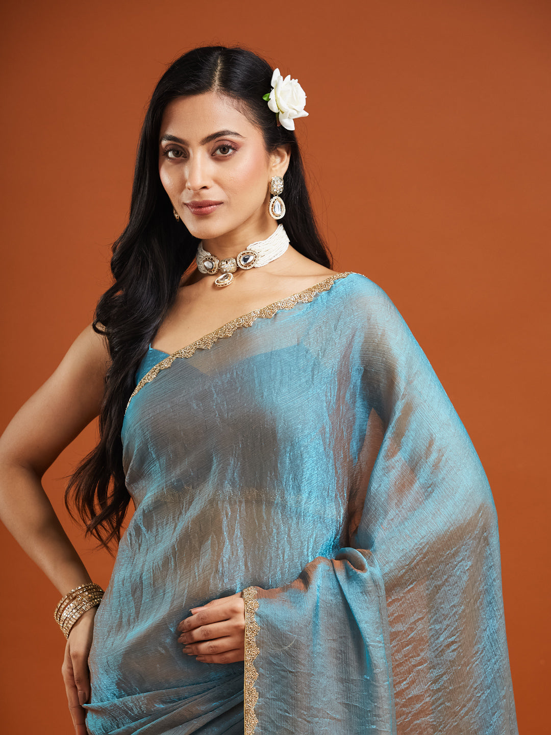 Drape yourself in timeless elegance with this antique teal tissue silk saree that radiates warmth, grace, and tradition. The saree features a lustrous texture with a fine crushed finish and a delicate embroidered scalloped border that adds just the right hint of detail. Ideal for festive occasions, haldi ceremonies, or intimate gatherings.