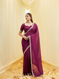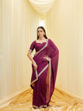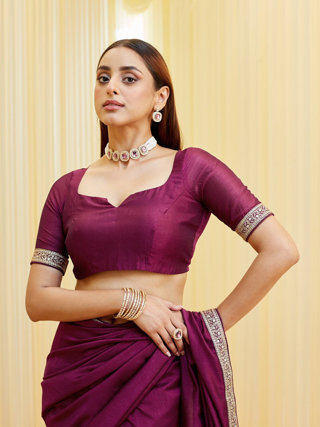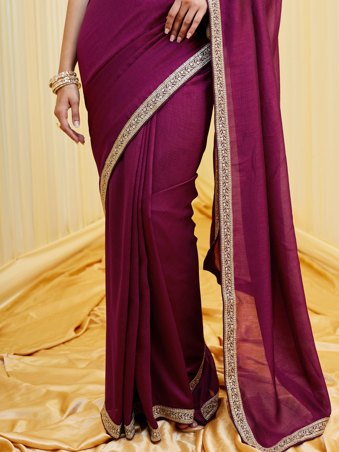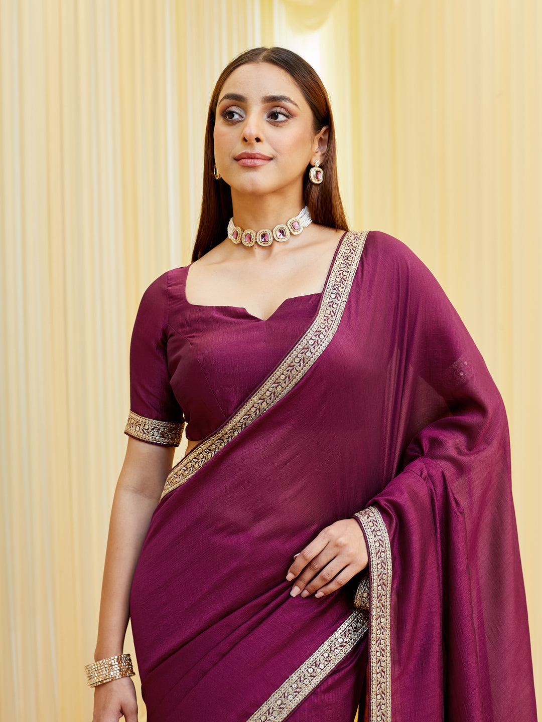 Exude effortless elegance with this serene wine saree crafted in a silk cotton blend fabric, perfect for both day and evening occasions. The simplicity of the solid body is beautifully elevated by a narrow yet refined zari embroidered border, featuring intricate patterns in beige-gold tones that catch the light subtly.This saree is a timeless addition to your ethnic wardrobe — ideal for minimalistic festive looks, intimate weddings, or even formal celebrations. The unstitched blouse fabric complements the saree with matching border detailing, allowing you to customize your look effortlessly.