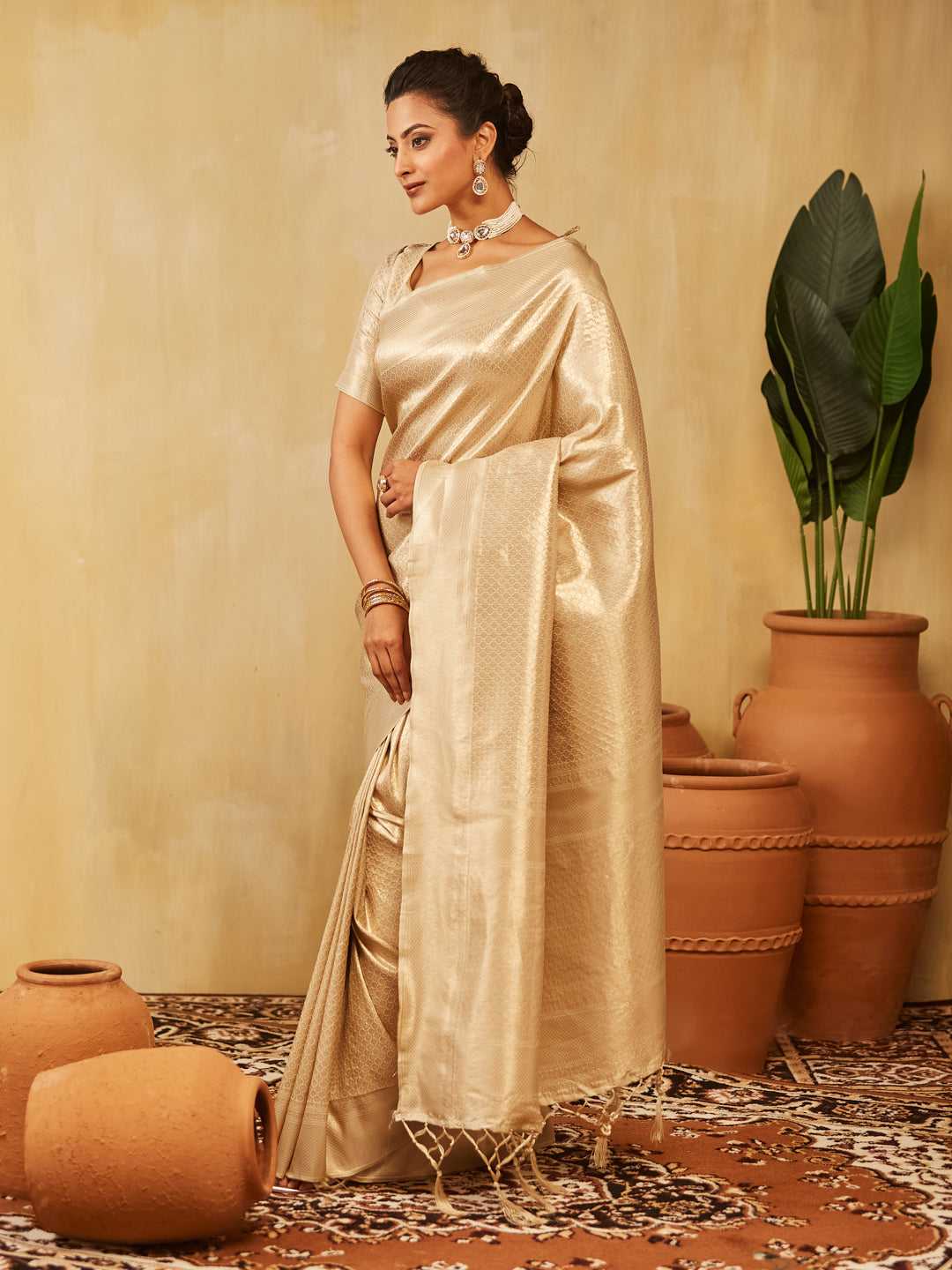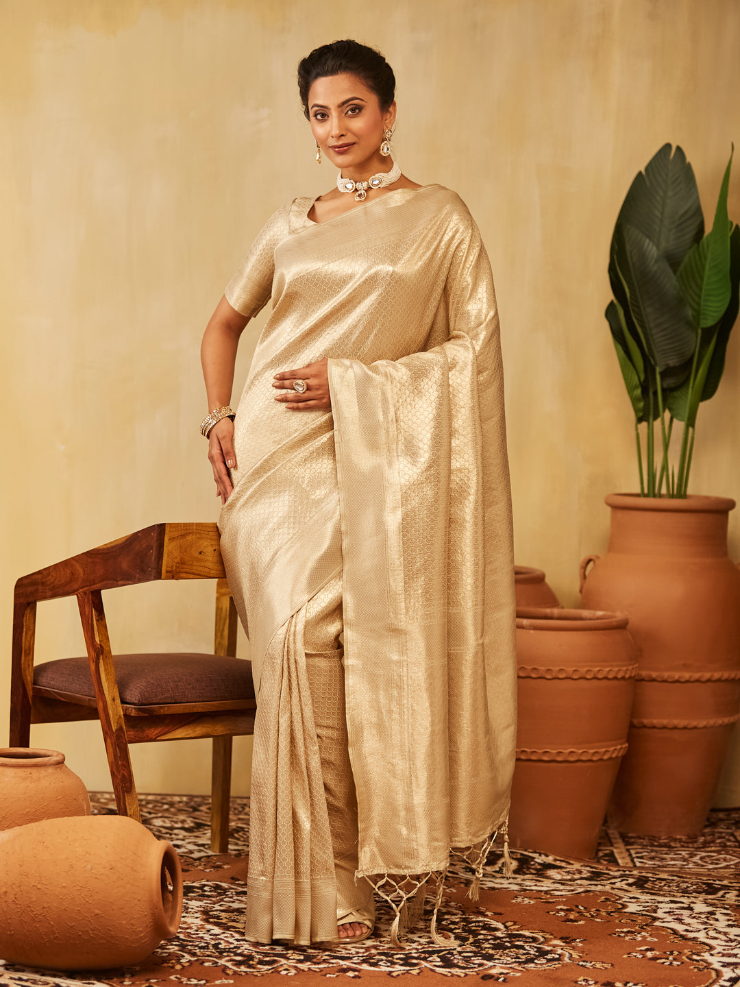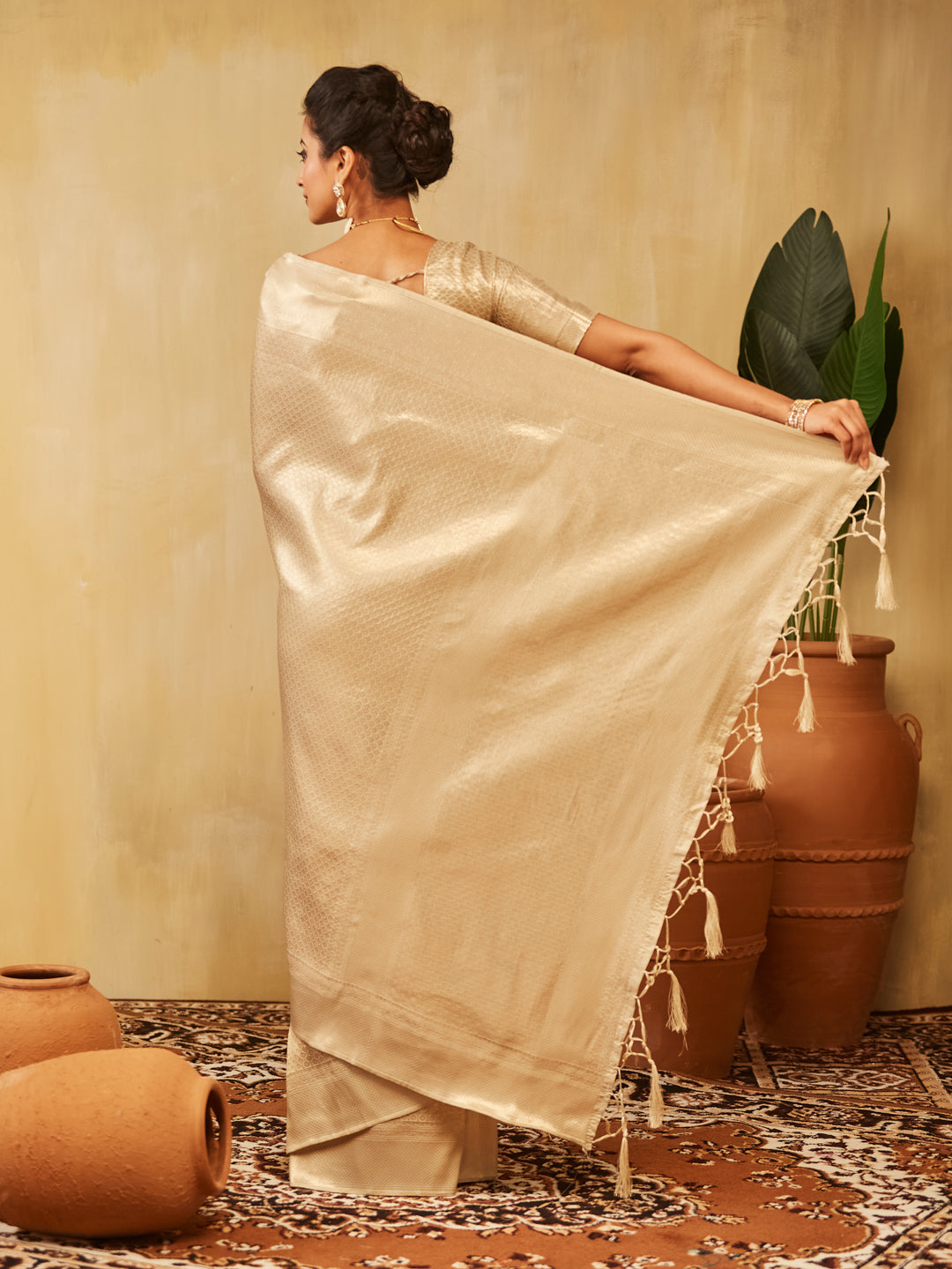 Classic, graceful, and endlessly versatile—this champagne cream Banarasi silk saree is the epitome of understated elegance. It features a soft woven geometric pattern all over the body, exuding a luxurious yet minimal vibe. The smooth, gleaming pallu with delicate tassels adds a timeless touch, making it ideal for regal occasions and heritage looks.