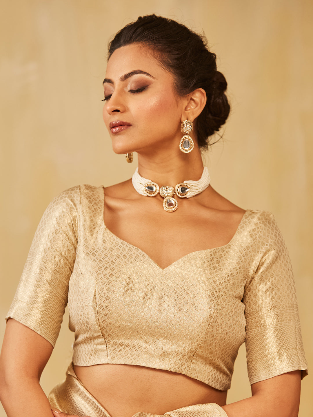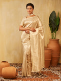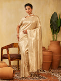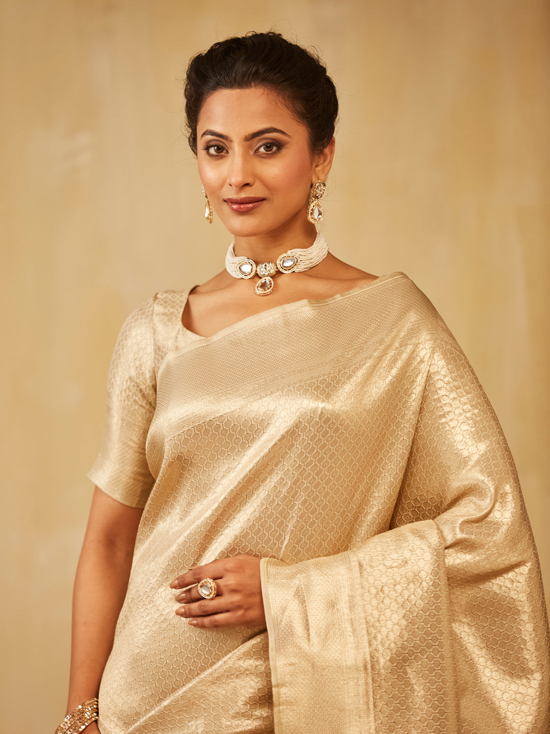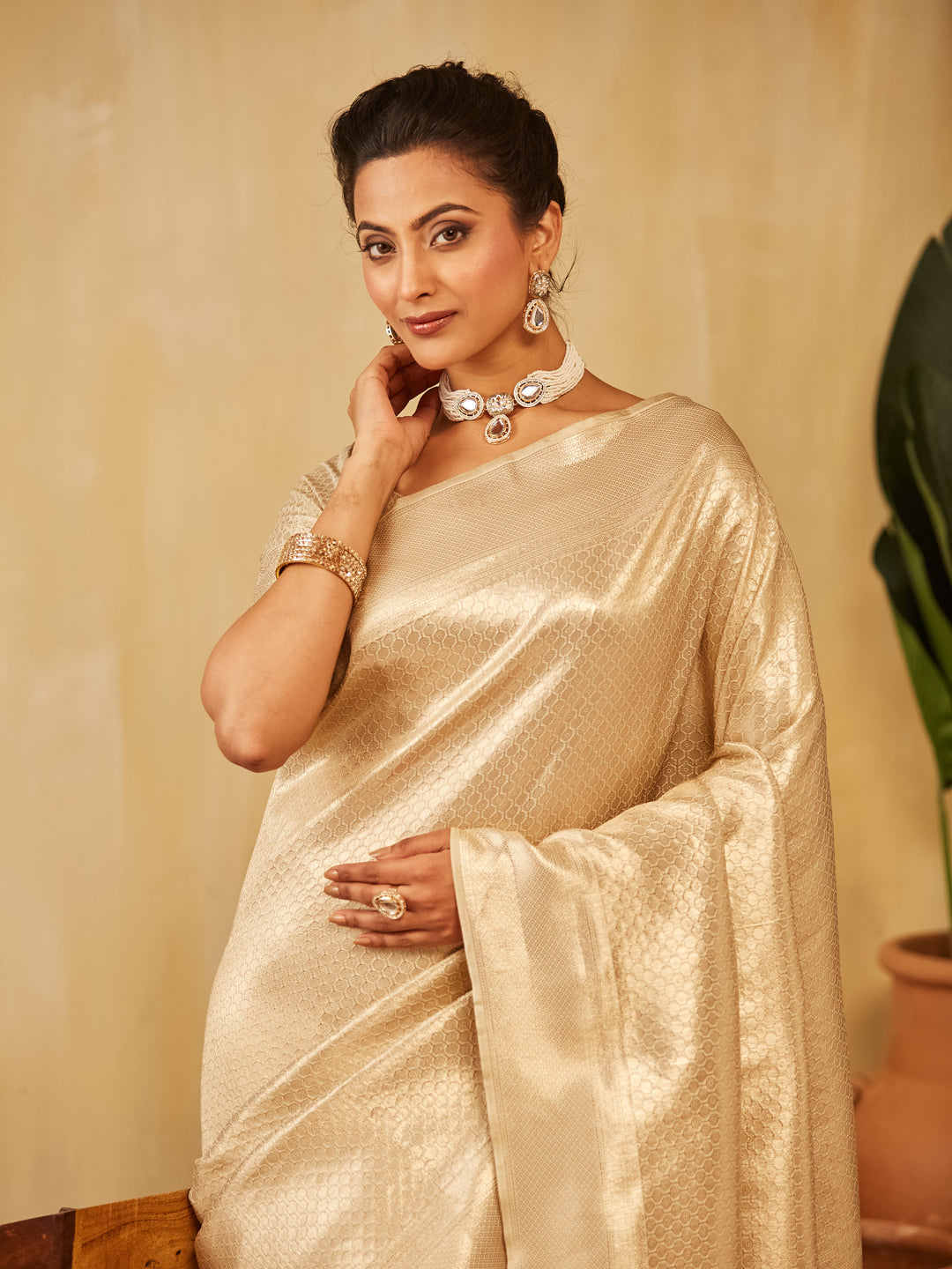 Classic, graceful, and endlessly versatile—this champagne cream Banarasi silk saree is the epitome of understated elegance. It features a soft woven geometric pattern all over the body, exuding a luxurious yet minimal vibe. The smooth, gleaming pallu with delicate tassels adds a timeless touch, making it ideal for regal occasions and heritage looks.