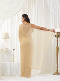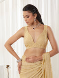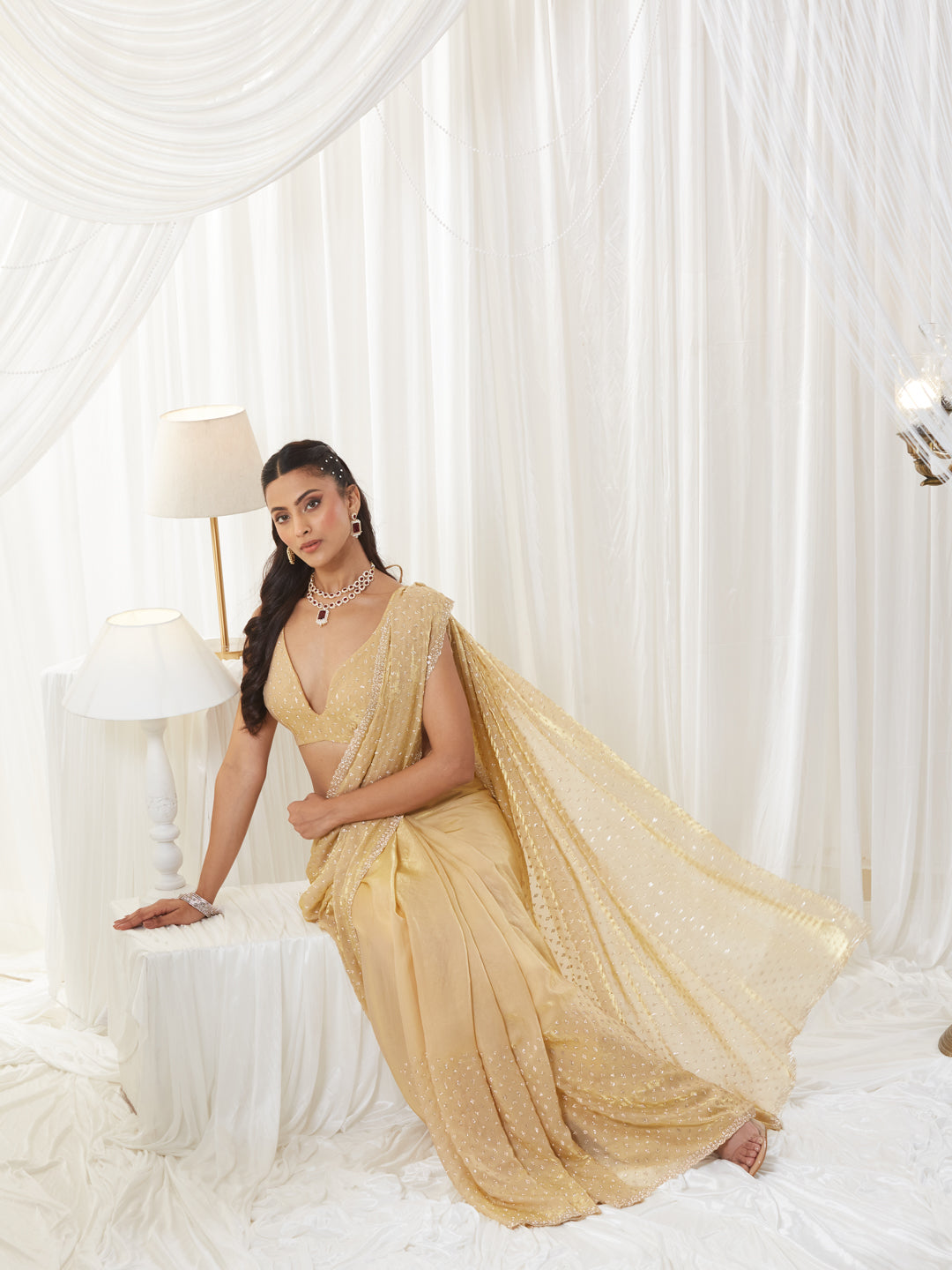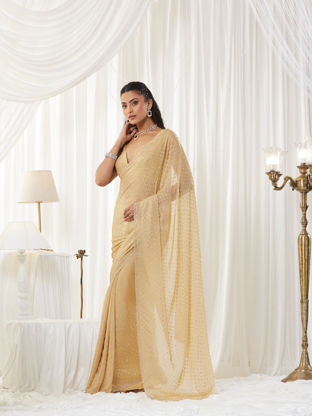 Step into effortless glamour with this Beige Embellished Silk Blend Saree, a perfect statement piece for cocktail nights, festive parties, and reception celebrations. The saree features dense, all-over stone highlighting, giving it a radiant sparkle that stands out beautifully under lights.The rich beige shade blends warmth and luxury, making the saree ideal for both day and evening events. Crafted in lightweight silk blend, the saree drapes smoothly with a graceful flow, while the pallu carries a mesmerizing shimmer that enhances every movement.Complementing the saree is a designer high-neck blouse, adding structure and a contemporary edge to the classic drape. This combination of modern blouse styling and traditional sparkle makes the outfit truly captivating