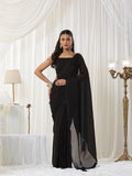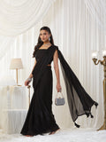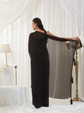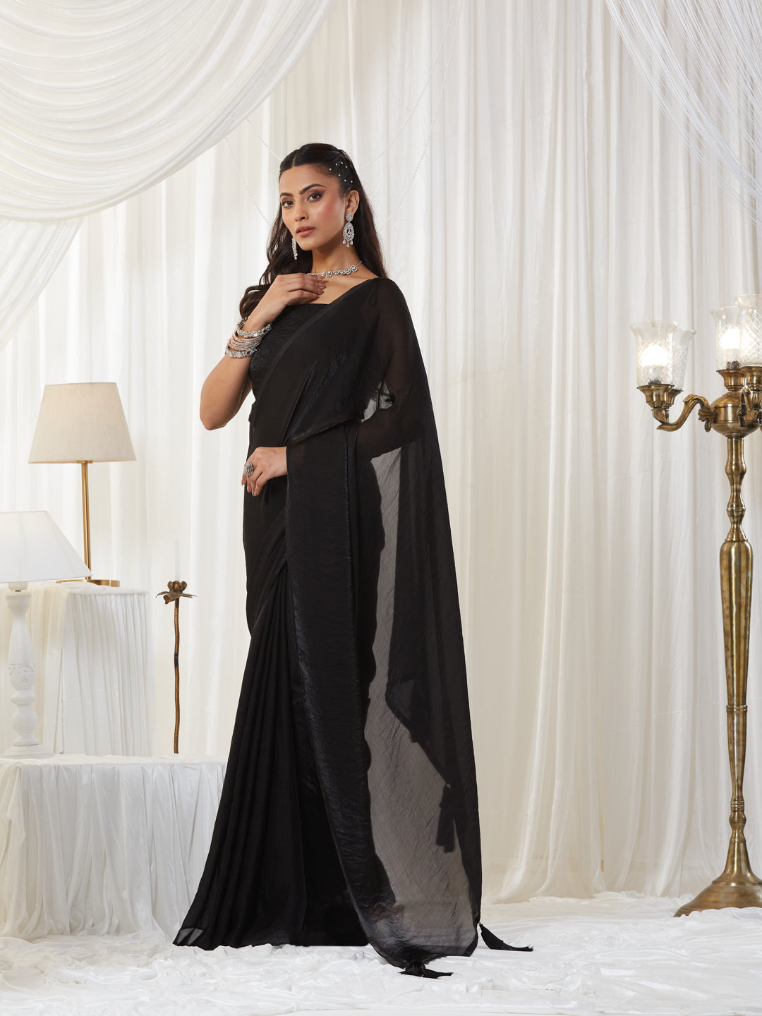 Step into timeless elegance with this Black Luxe Shimmer Silk Blend Saree, crafted to make every occasion feel special. The saree features a lightweight sheer pallu with a soft, fluid drape that glides effortlessly as you move. The body of the saree carries a subtle satin-finish texture, giving it a luxurious sheen without overpowering the look. The ensemble comes paired with a coordinated solid black blouse featuring a clean, modern square neckline that adds structure and sophistication. The blouse design enhances the overall silhouette, making it perfect for evening events, cocktail gatherings, festive occasions, and upscale celebrations.The saree maintains a balance between contemporary minimalism and classic charm, allowing you to style it both subtly and glamorously. Whether you accessorize lightly or go full sparkle, this saree adapts beautifully to your mood and the moment.