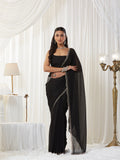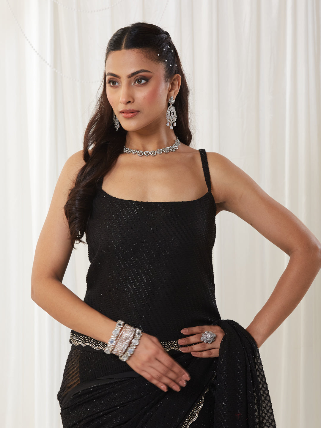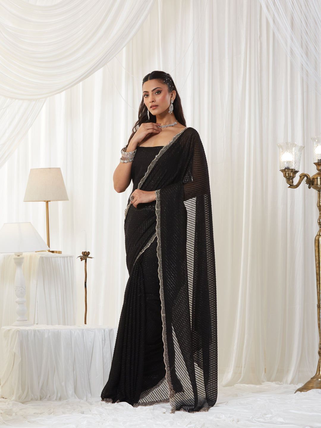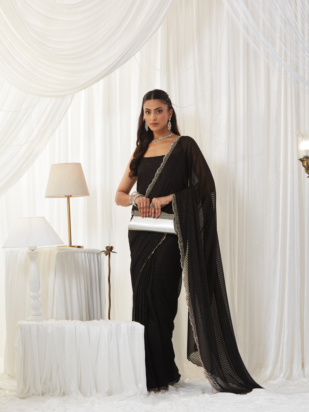 Elegant, timeless, and effortlessly glamorous ?his Black Metallic Mesh Pattern Saree is crafted for women who love subtle shimmer wrapped in sophisticated styling. Designed in a luxurious lightweight fabric with a fine mesh-textured pattern, this saree delivers a sleek and contemporary appeal, perfect for evening soir?s, cocktail nights, and festive celebrations.The saree features a beautifully crafted scalloped border that adds the perfect amount of sparkle without overpowering the overall look. The metallic shine within the fabric creates a captivating sheen, making the saree glow softly under warm lights.The pleats fall in structured, graceful folds, while the pallu flows effortlessly, giving a refined silhouette. Paired with a coordinated solid blouse featuring a modern straight neckline, the ensemble strikes the perfect balance between traditional draping and contemporary lines.Stylish, versatile, and truly elegant ?his saree is designed to stand out with refined charm.