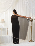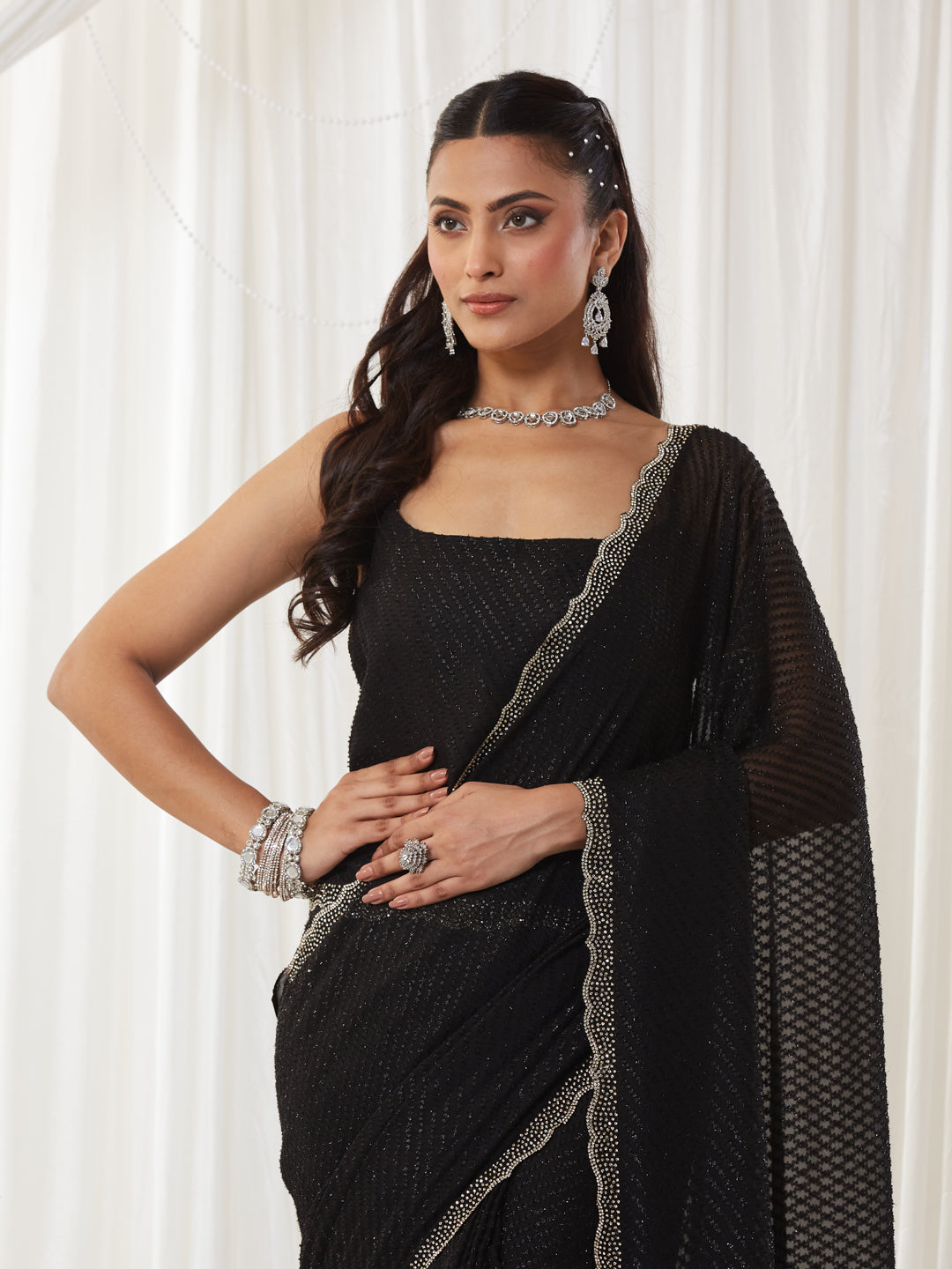 KASEE Women's Black Metallic Mesh Pattern Saree with Scalloped Border