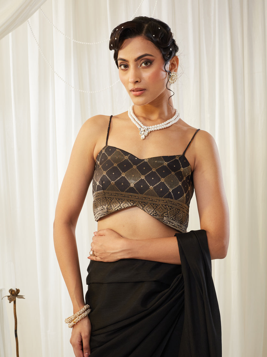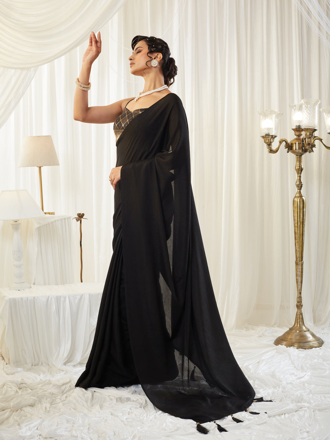 Give your ethnic wardrobe a chic upgrade with this elegant black silk saree. Crafted from ultra-smooth silk, the saree features a glossy, fluid drape that enhances its premium look. The rich mustard hue adds a contemporary yet festive touch, making it perfect for wedding functions, parties, and special celebrations.The solid body and shimmering texture allow effortless styling, while the tasselled pallu adds a playful and stylish edge. Paired with a matching embroidered blouse, this saree blends simplicity and luxury for a refined ethnic statement.