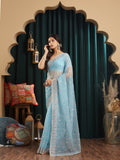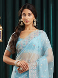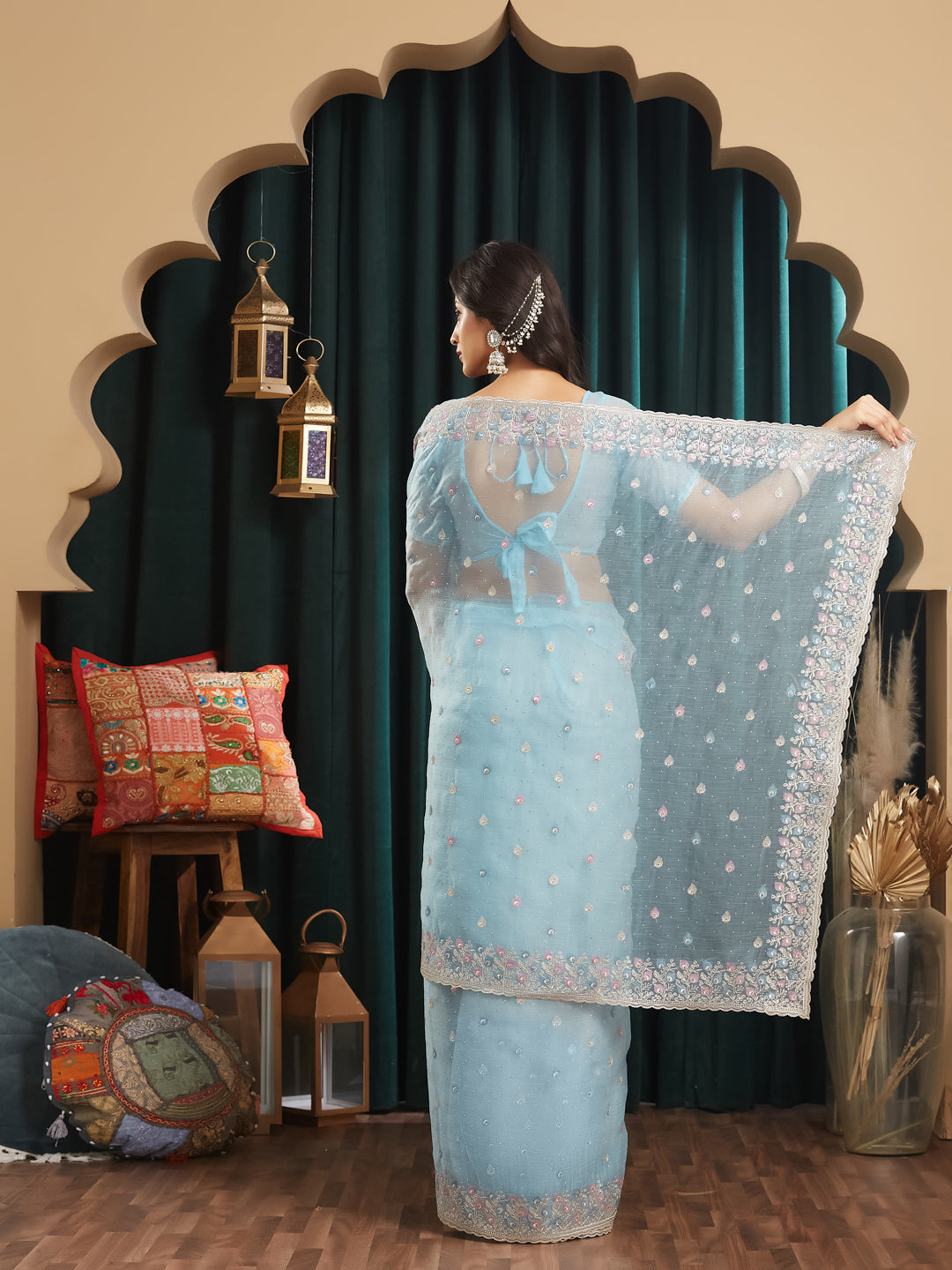 This dreamy blue poly chiffon saree brings a soft, ethereal charm with its delicate multicolor butis scattered across the drape. The highlight of the saree is its beautifully crafted floral embroidered border, embellished with subtle threadwork and fine detailing that adds richness without overpowering the pastel hue. Lightweight, sheer, and gracefully flowy, this saree is perfect for festive celebrations, intimate weddings, and elegant evening events. Its understated sparkle and refined craftsmanship create a timeless look that blends tradition with contemporary elegance.