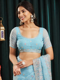 KASEE Women's Blue Poly Chiffon Saree with Multicolor Butis & Intricate Embroidered Floral Border