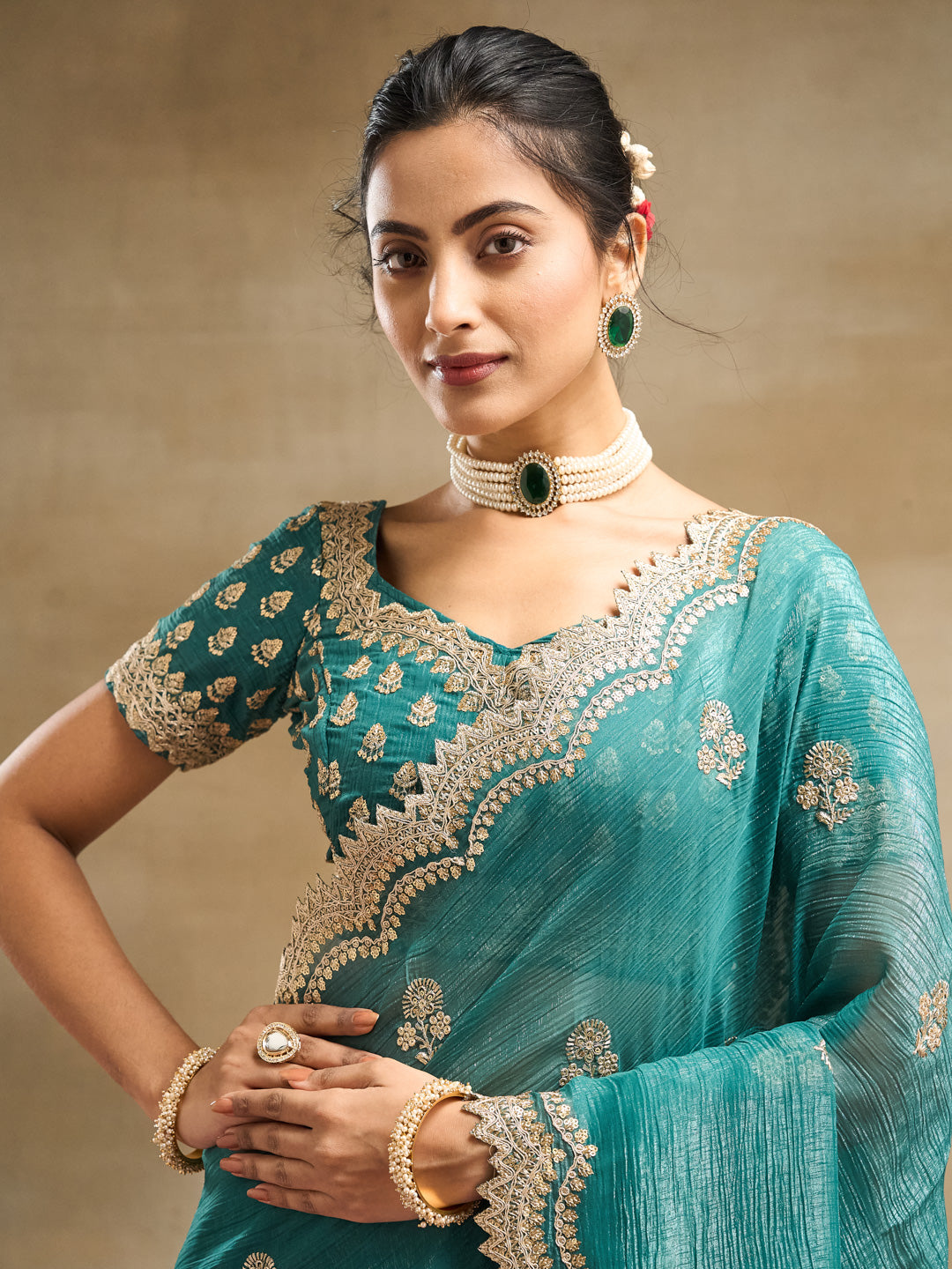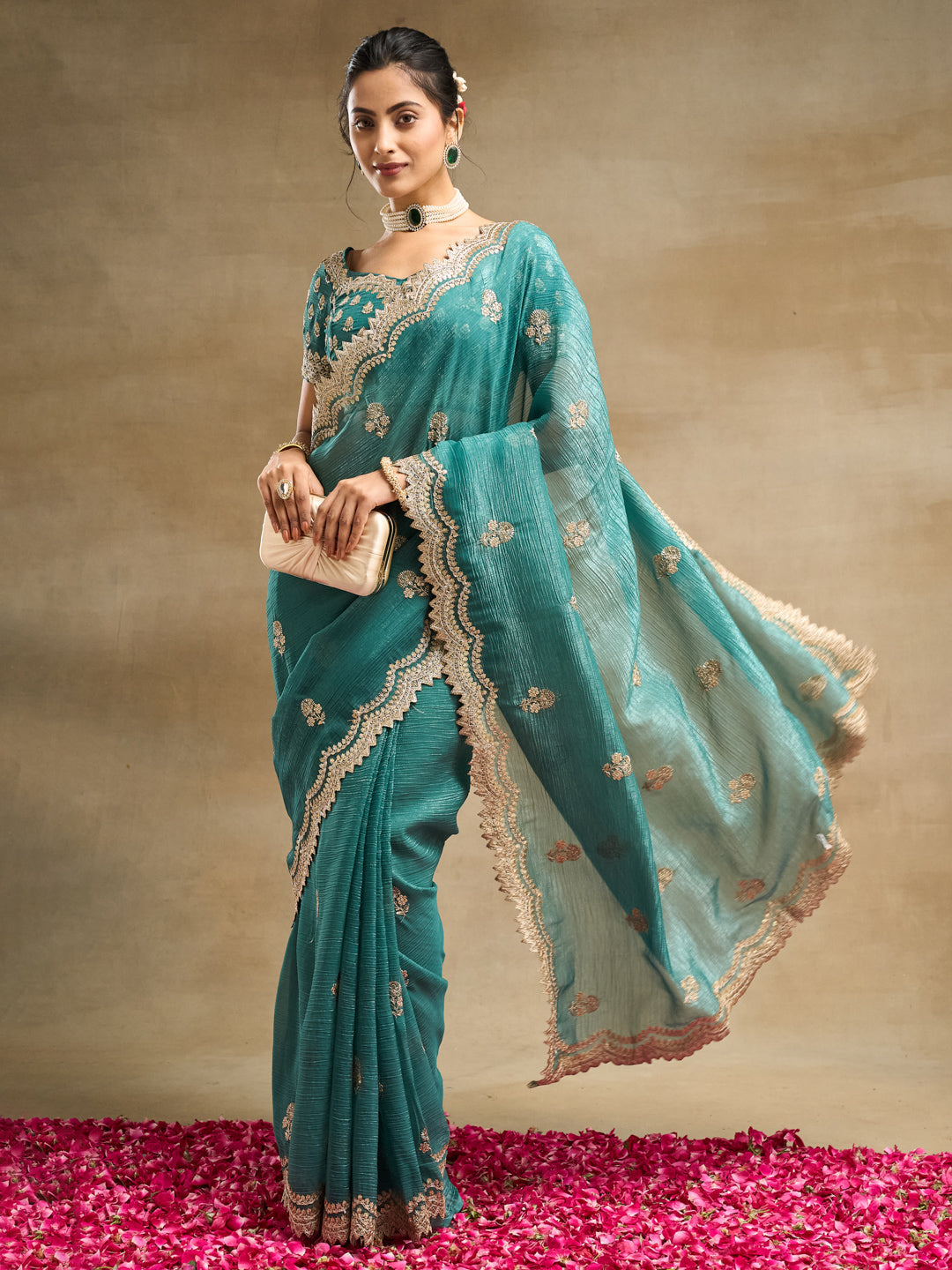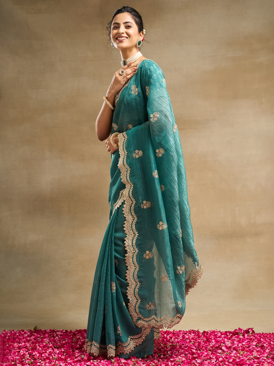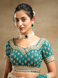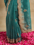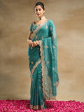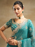Add a touch of regal elegance to your festive wardrobe with this petrol blue silk blend saree featuring exquisite golden embroidery. Designed with delicate floral motifs and a beautifully scalloped zari border, this saree blends tradition with luxury. The lightweight silk blend fabric gives it a graceful fall and a sheer finish, perfect for weddings, receptions, and grand celebrations. The detailed embroidery on the pallu and borders lends a rich, handcrafted charm, making this saree a statement piece for any festive occasion. Comes with a matching embroidered blouse piece to complete the ensemble.