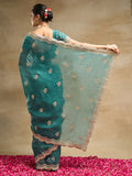 KASEE Women's Petrol Blue Silk Blend Saree with Golden Embroidered Floral Motifs