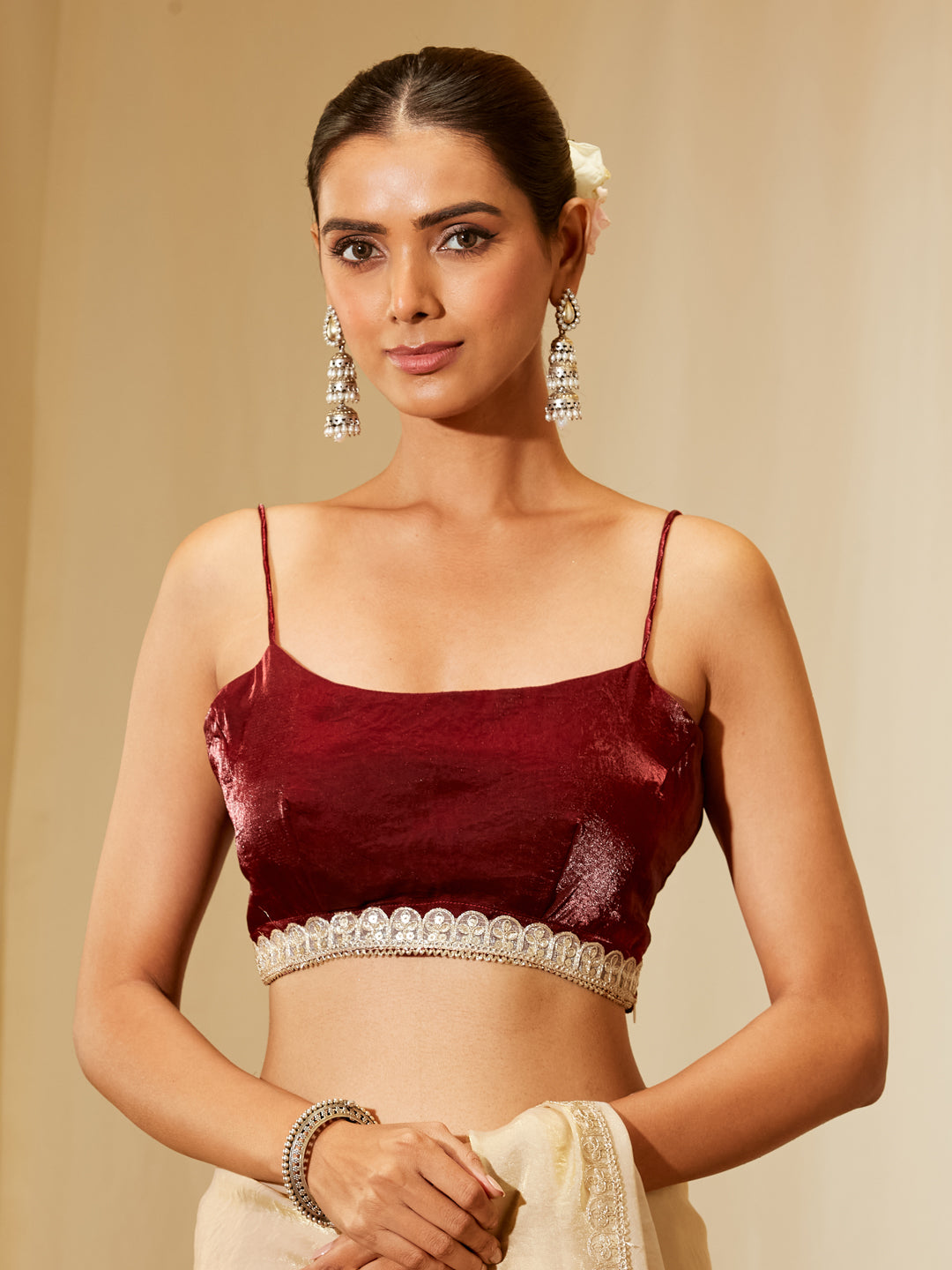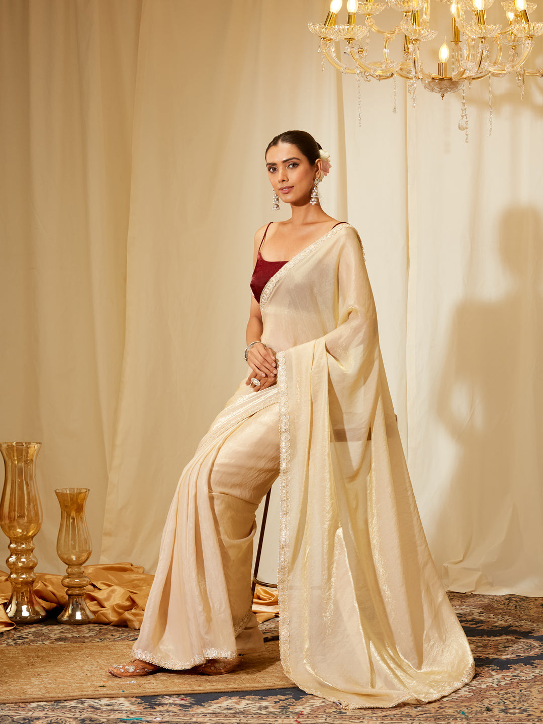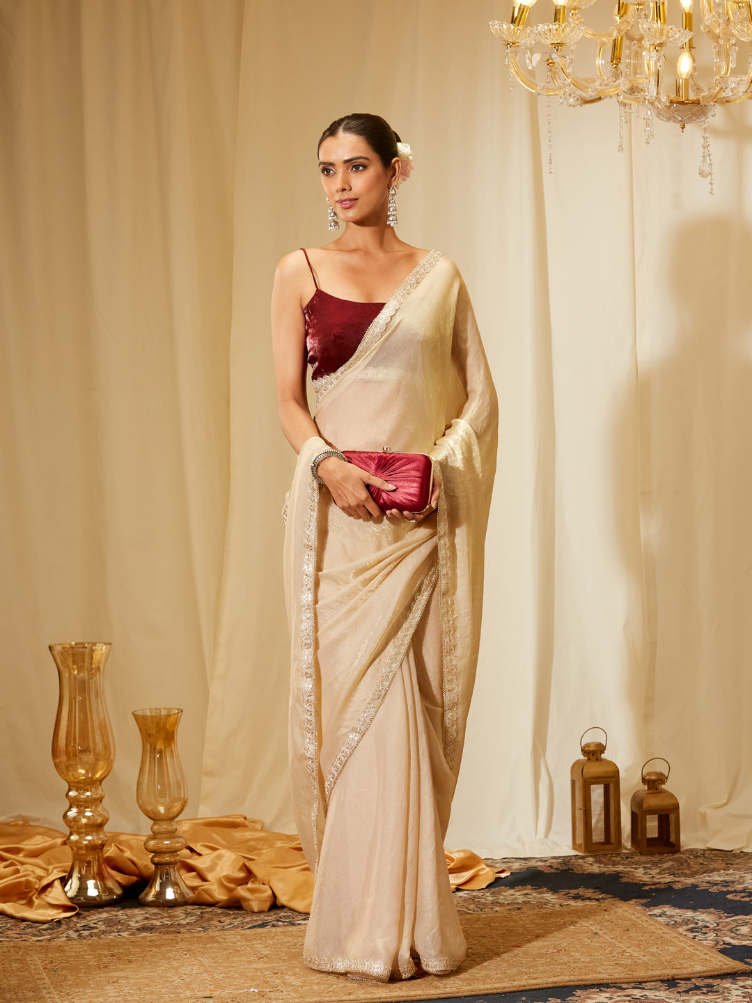 Drape yourself in timeless sophistication with this champagne beige silk blend saree, crafted with a subtle shimmer finish and highlighted by a delicate scalloped border embellished with sequins and thread embroidery. Its understated elegance makes it versatile for both day and evening celebrations, radiating grace in every fold.It is paired with an unstitched blouse piece, allowing customization for your perfect fit and style. Pair this saree with diamond jewelry and soft curls for an effortlessly glamorous look.