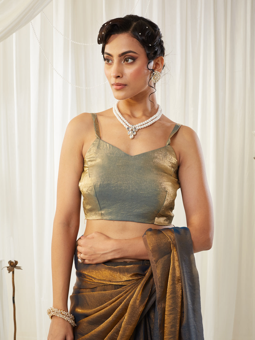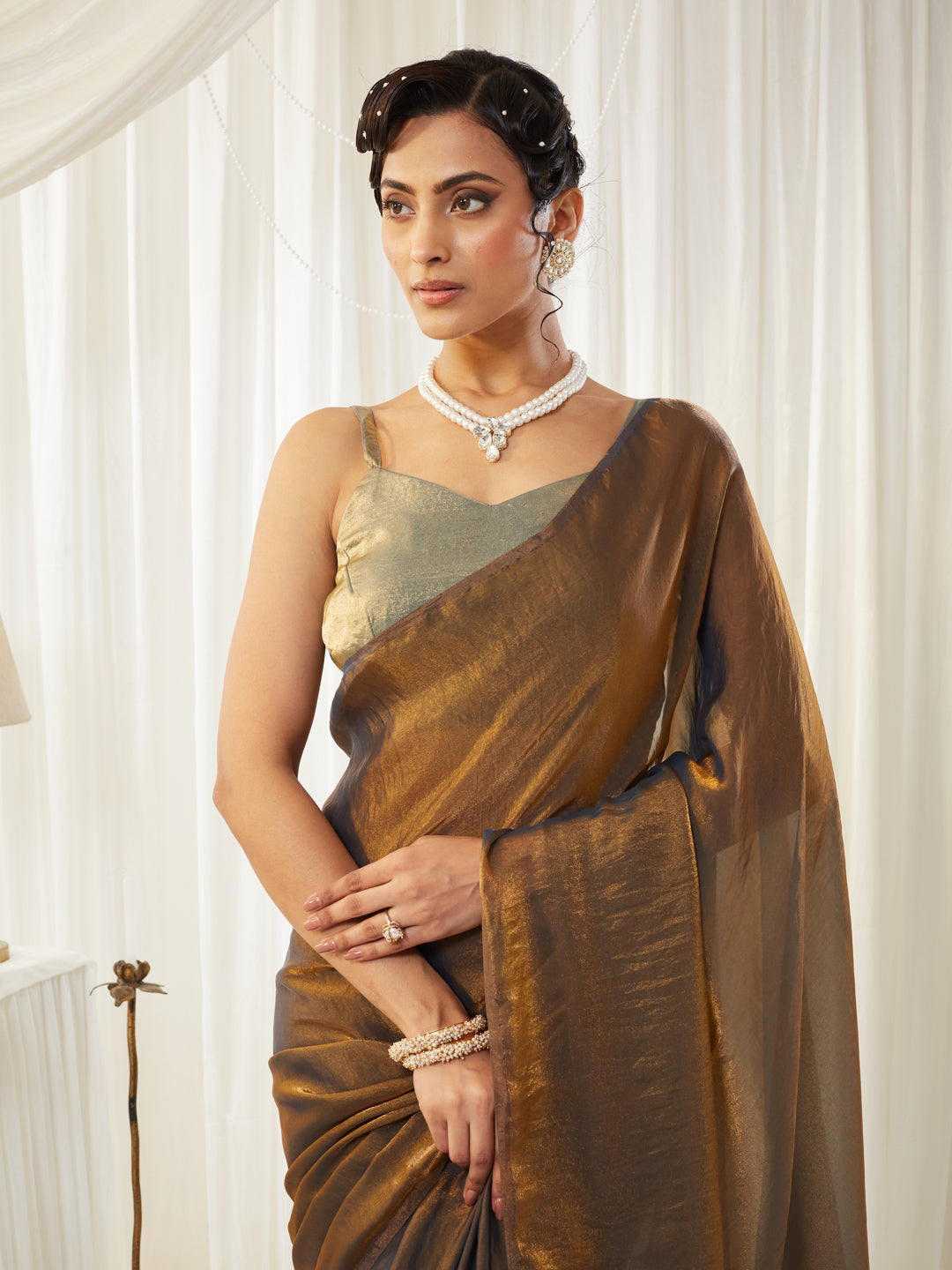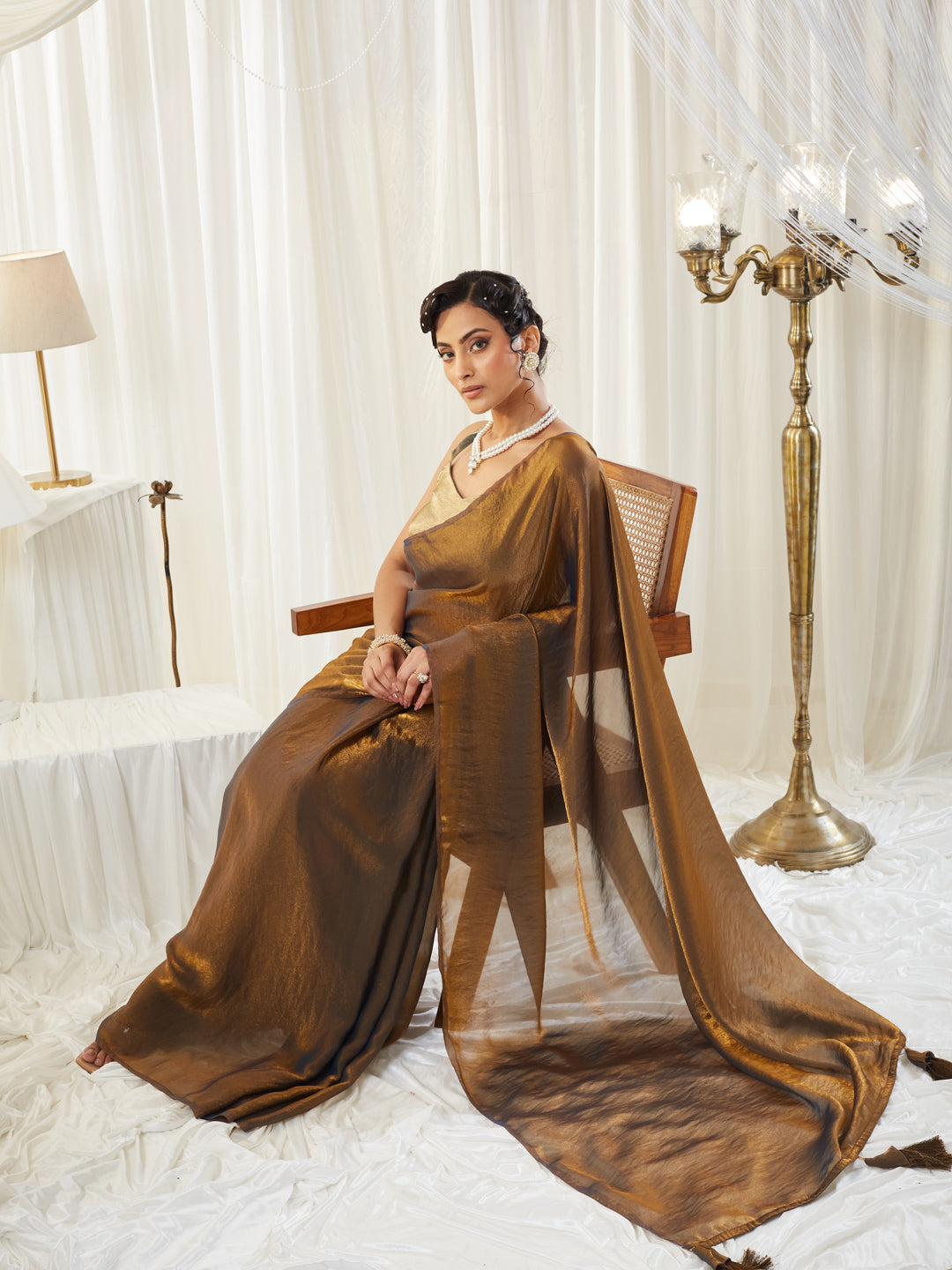 Step into timeless elegance with this Coffee Luxe Shimmer Silk Blend Saree, crafted to make every occasion feel special. The saree features a lightweight sheer pallu with a soft, fluid drape that glides effortlessly as you move. The body of the saree carries a subtle satin-finish texture, giving it a luxurious sheen without overpowering the look. The ensemble comes paired with a coordinated solid black blouse featuring a clean, modern square neckline that adds structure and sophistication. The blouse design enhances the overall silhouette, making it perfect for evening events, cocktail gatherings, festive occasions, and upscale celebrations.The saree maintains a balance between contemporary minimalism and classic charm, allowing you to style it both subtly and glamorously. Whether you accessorize lightly or go full sparkle, this saree adapts beautifully to your mood and the moment.