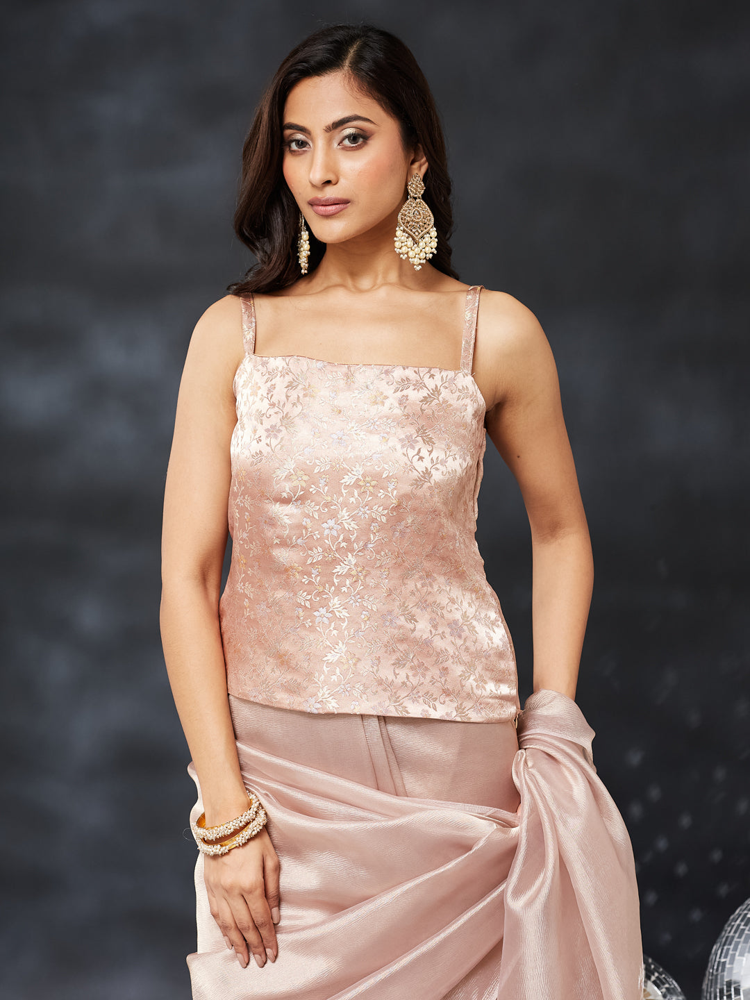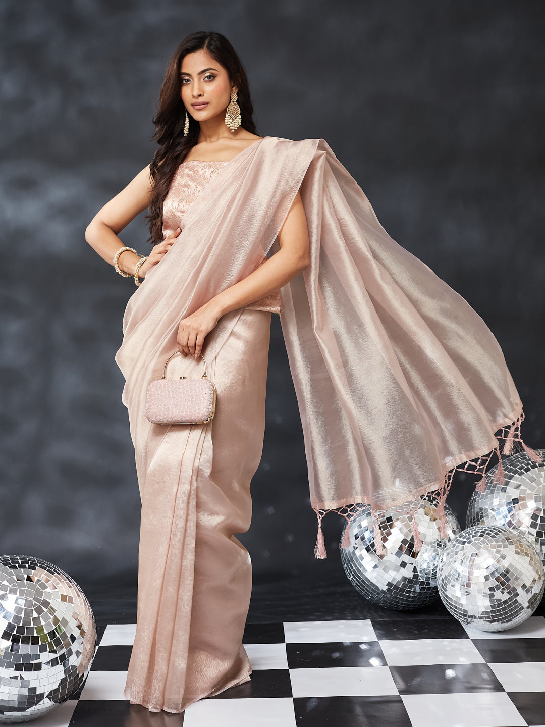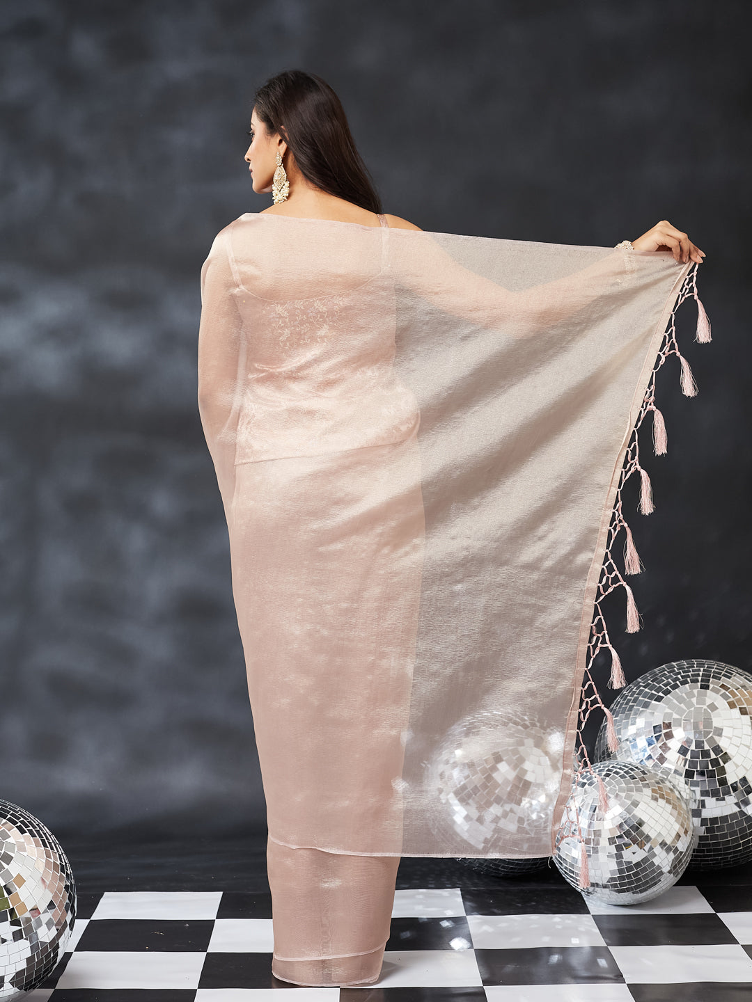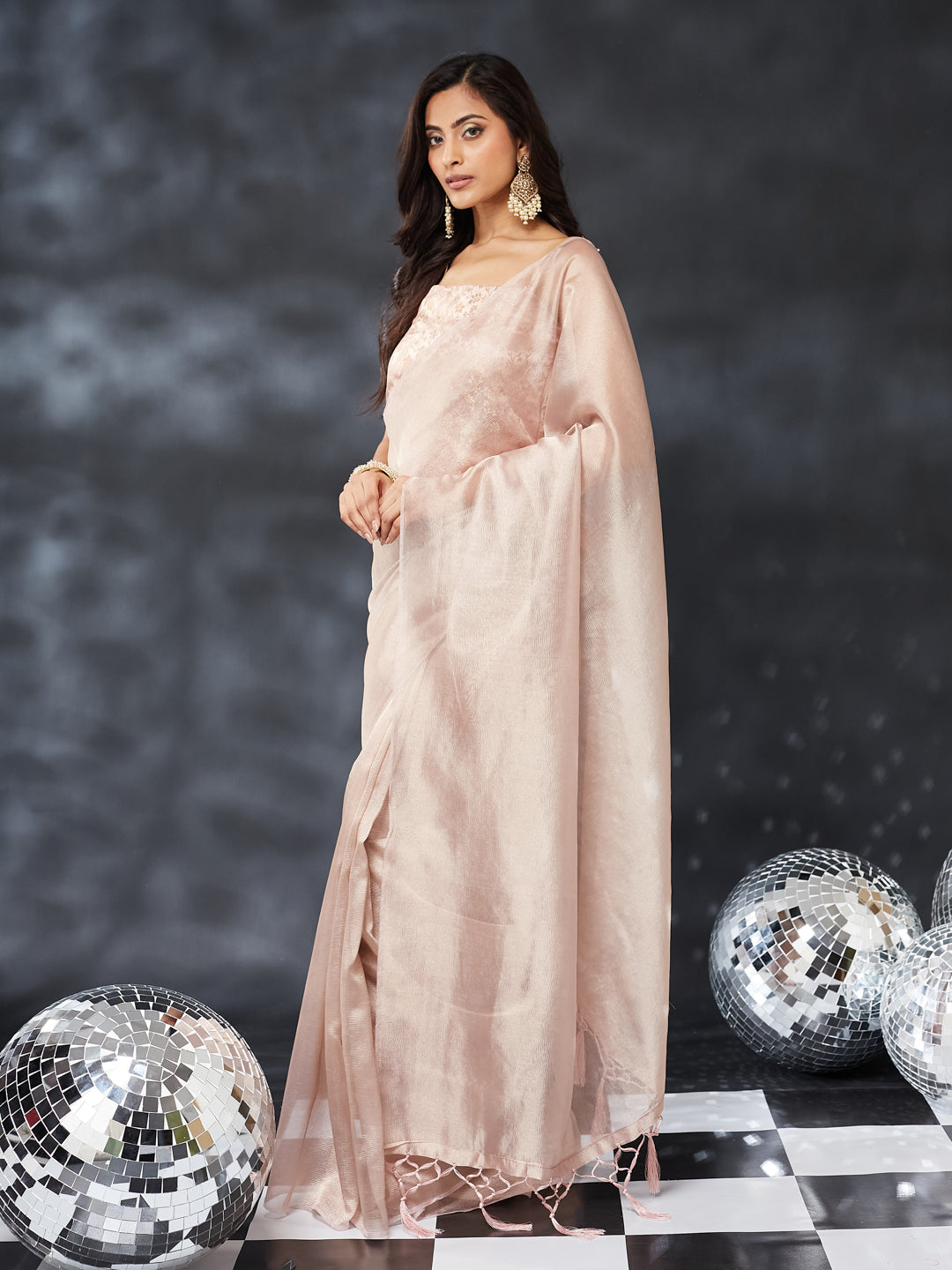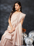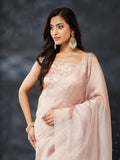 This pink silk saree brings together sophistication and minimal luxury in one timeless piece. Designed with a soft, sheer drape and a subtle all-over shimmer finish, the saree exudes understated elegance perfect for festive wear and special occasions. The lightweight fabric flows beautifully, offering graceful movement and a polished silhouette.Paired with a matching blouse, this saree creates a clean and refined look suitable for daytime celebrations, evening parties, and contemporary ethnic styling. The glossy texture and soft neutral tone make it versatile, classy, and effortlessly chic.