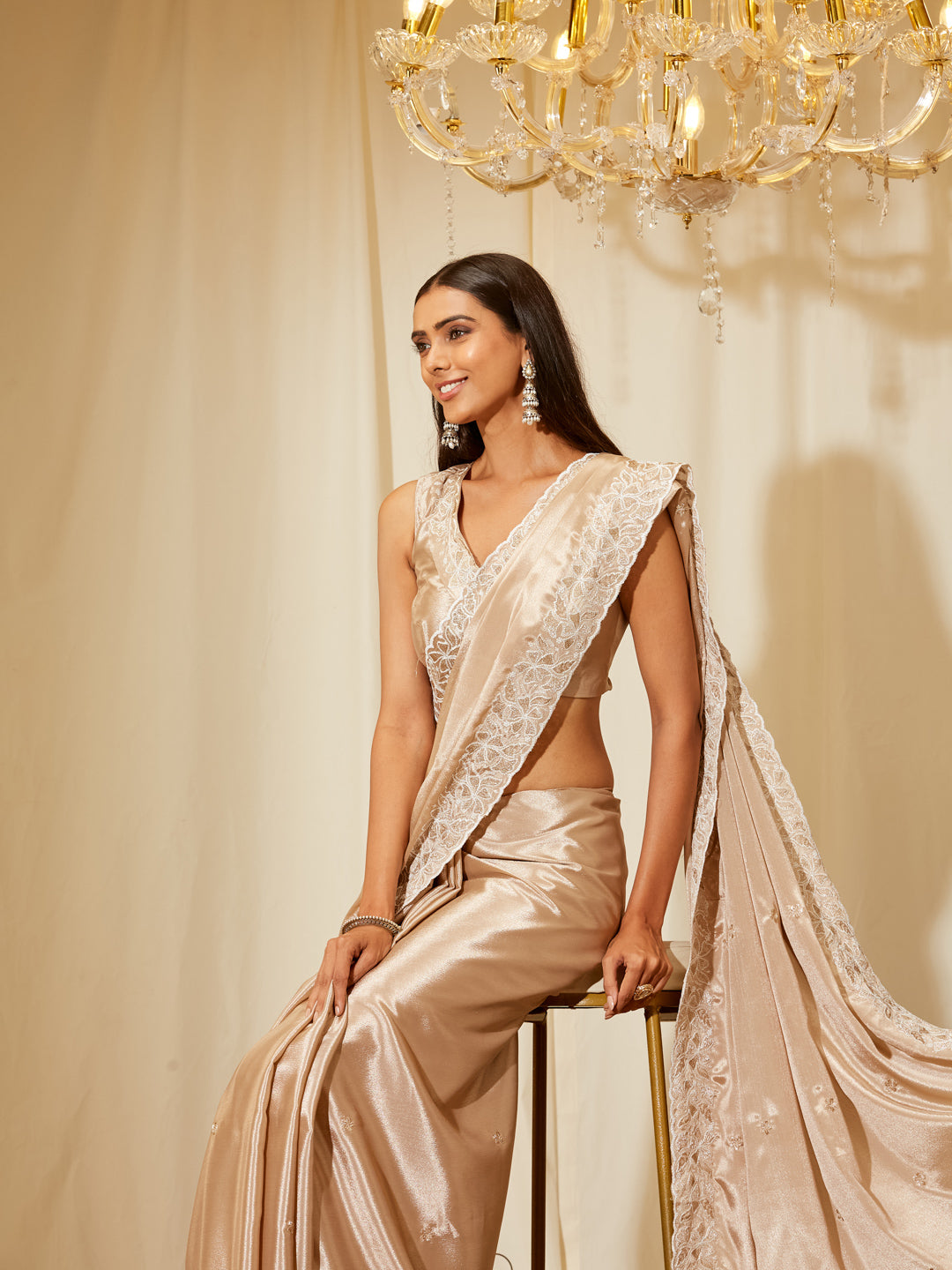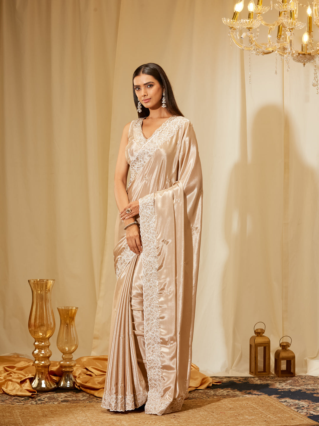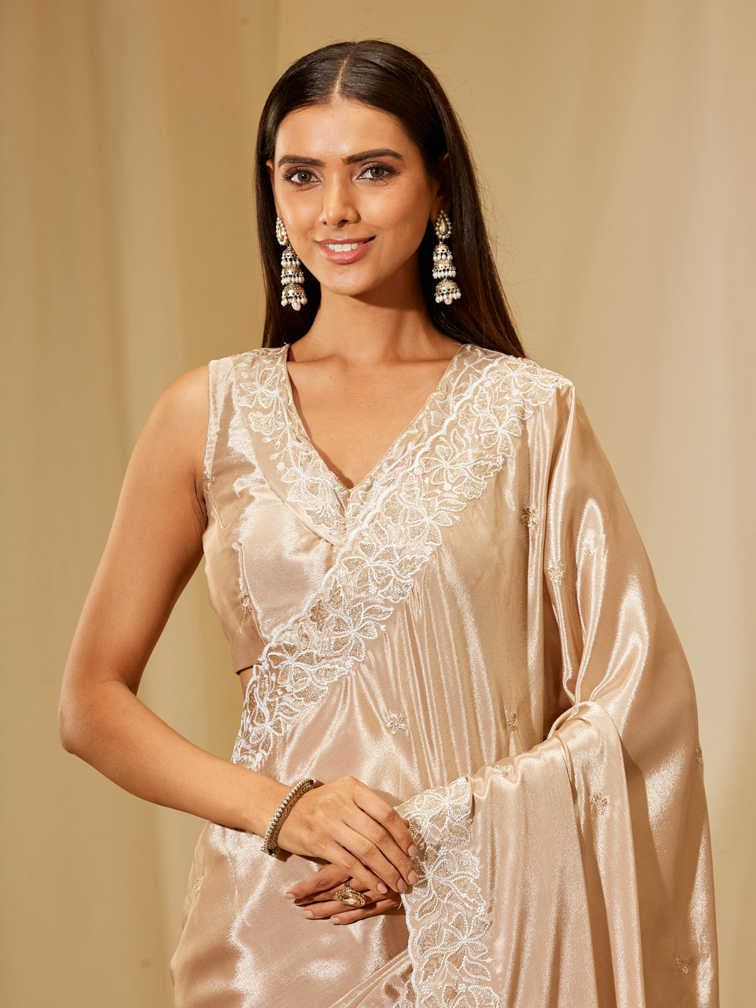 Exude understated elegance in this golden silk blend saree, adorned with delicate floral thread embroidery along the border. The soft sheen of the fabric enhances its sophisticated appeal, making it an ideal choice for both daytime celebrations and evening gatherings. Designed for versatility, this saree comes with an unstitched blouse piece, allowing you to tailor it to your personal style. Whether styled with traditional jewelry for a festive look or kept minimal for a modern touch, this saree is a timeless addition to your ethnic wardrobe. Pair with statement silver or pearl jhumkas for a refined traditional look. Add a choker necklace or keep it minimal with just bangles for effortless grace.Opt for soft curls or a sleek bun to highlight the embroidered border.For a modern twist, style the blouse with deep V-neck or boat-neck tailoring from the unstitched piece.A bold red or nude lip can elevate the minimalistic ivory tone beautifully.