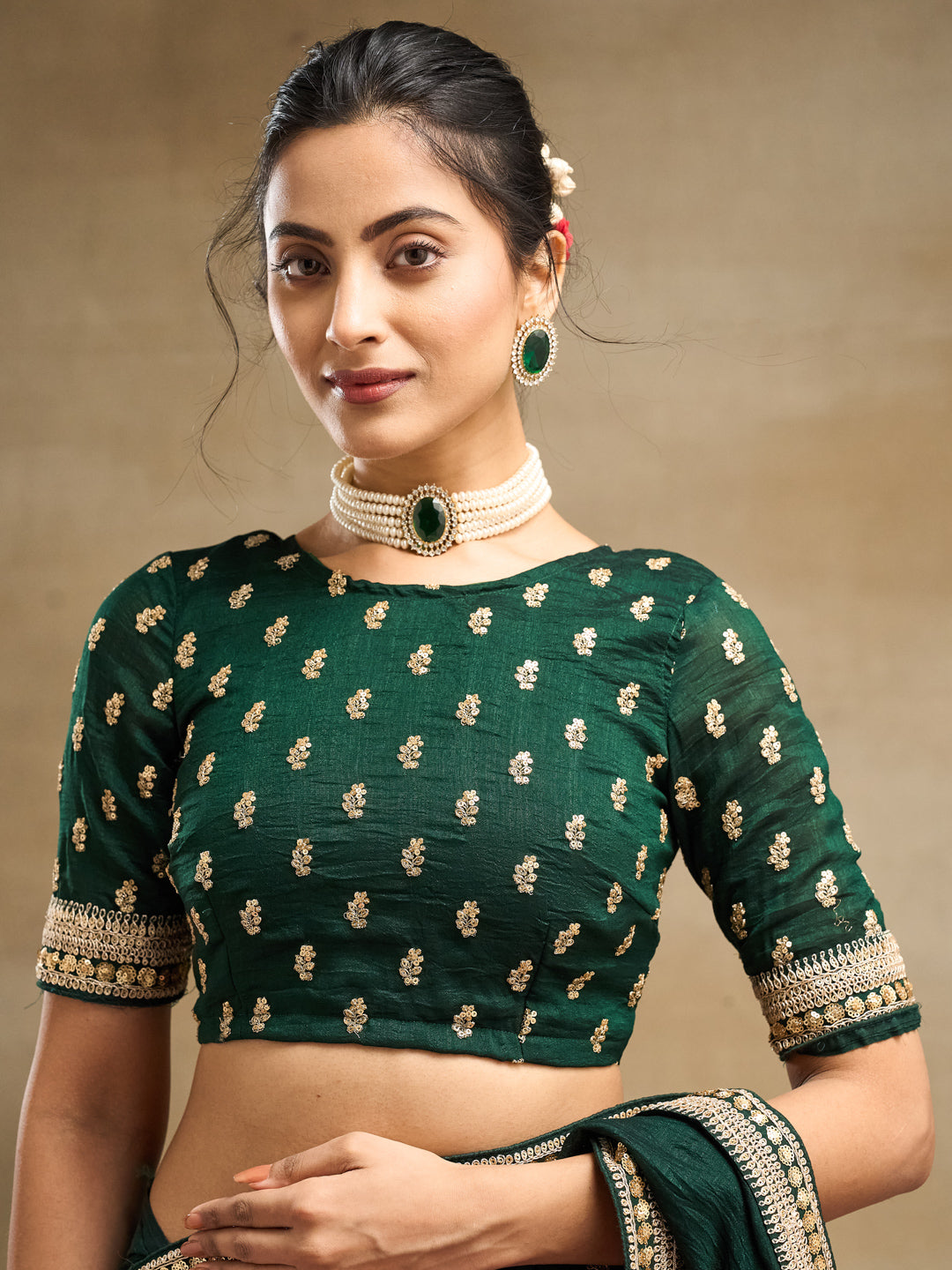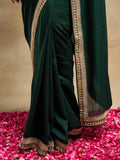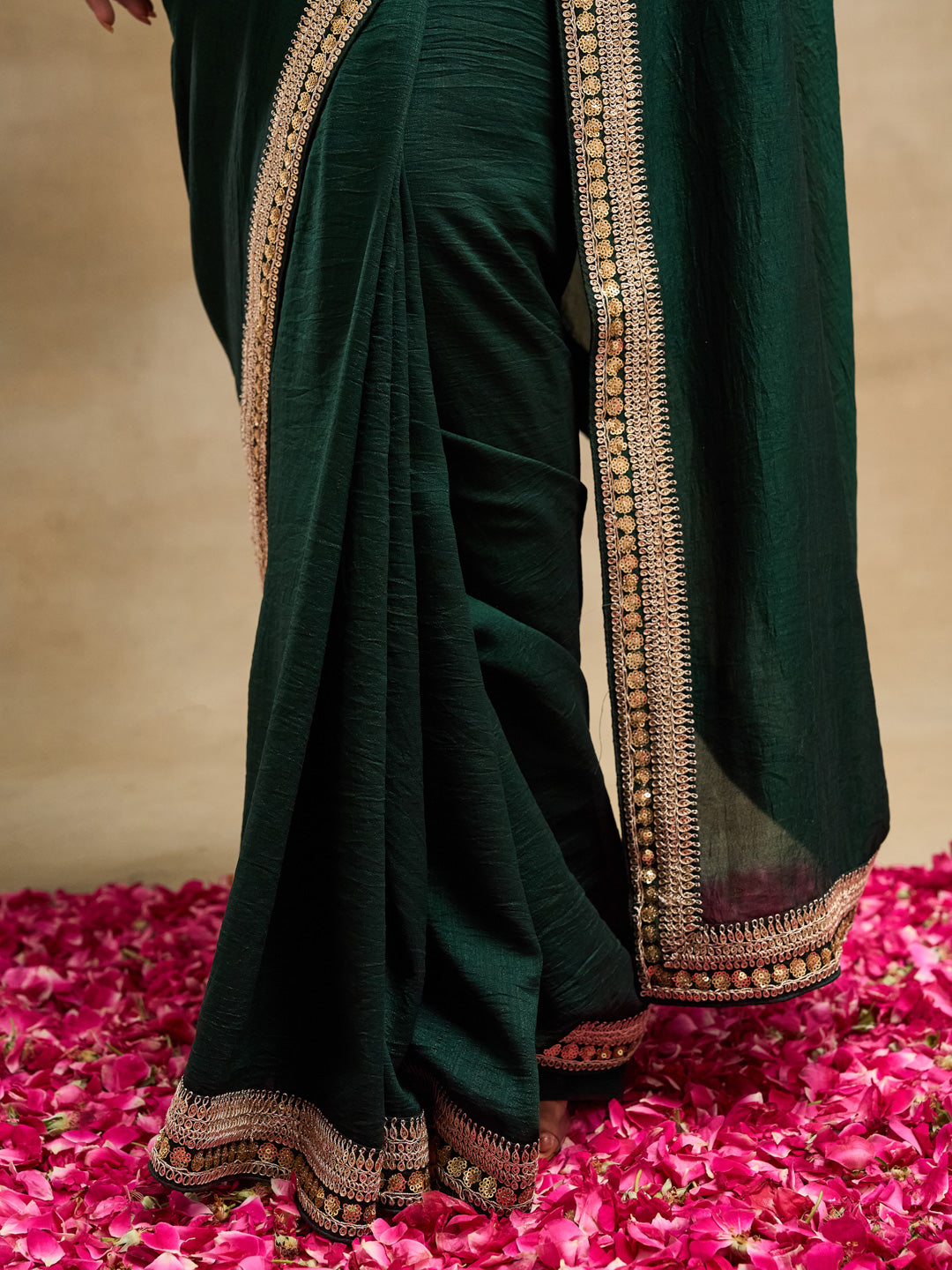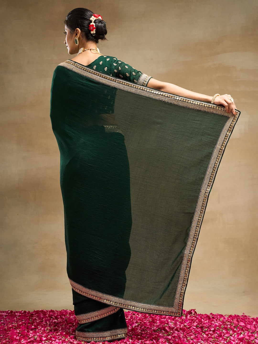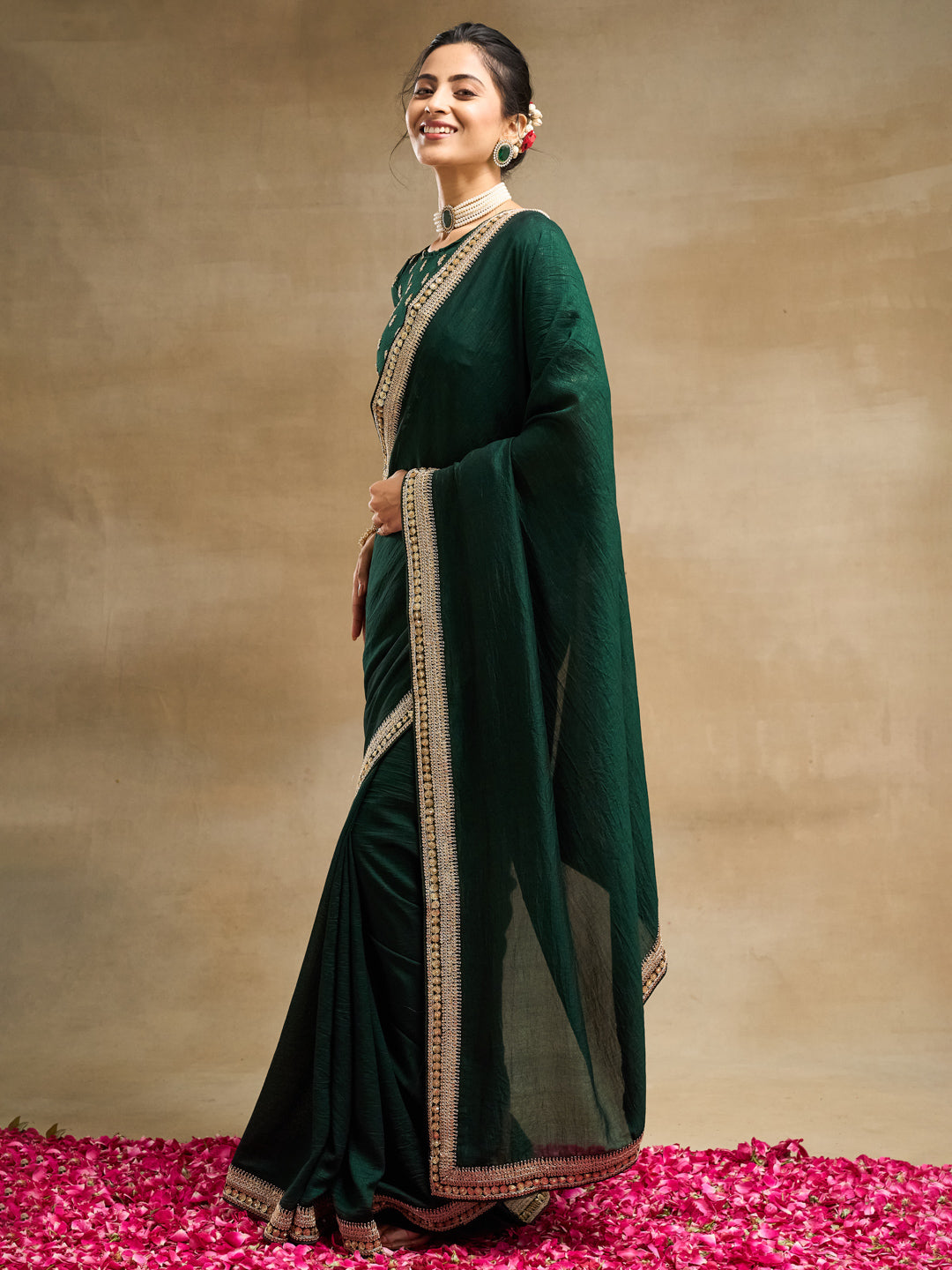 Elevate your festive wardrobe with this timeless bottle green silk blend saree, designed to exude classic grace and sophistication. The saree features a lustrous drape enhanced by a beautifully woven golden zari border that adds richness and dimension to its look. Perfect for weddings, festive gatherings, and cultural events, this saree embodies traditional elegance with a modern edge. The subtle sheen of the silk blend fabric enhances its luxurious appeal, while the intricately detailed border makes it a statement piece for every grand occasion.