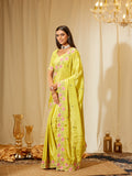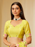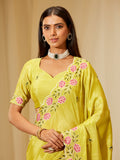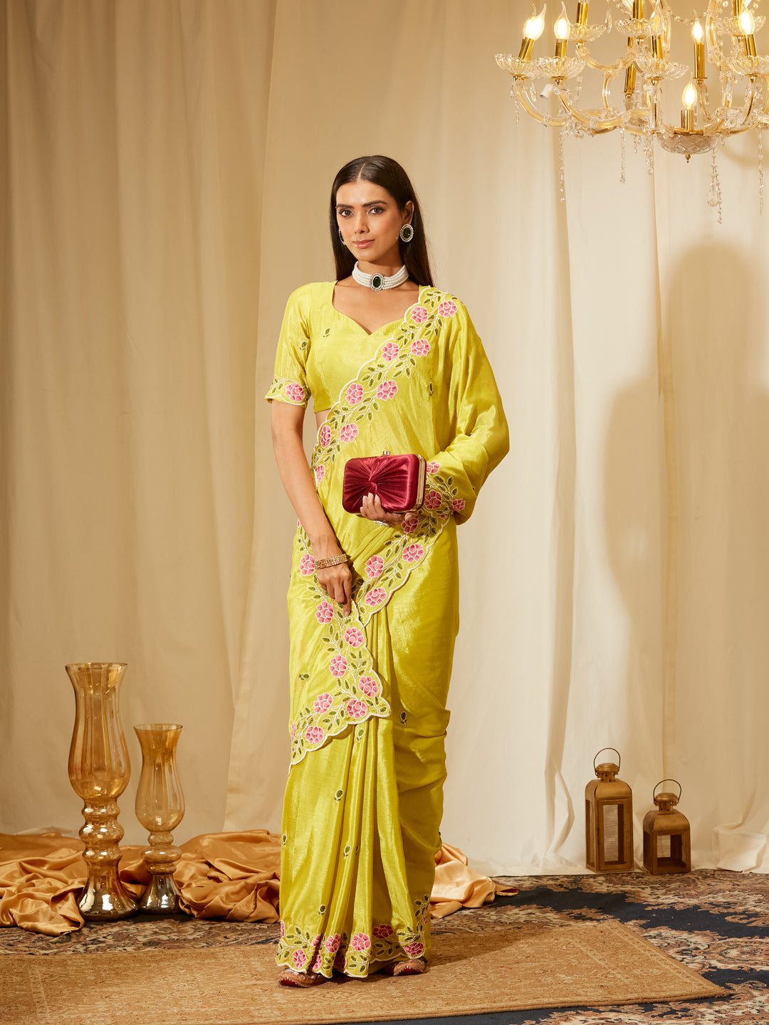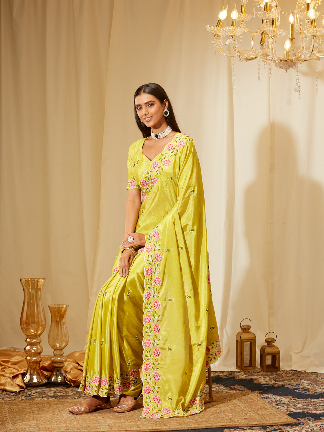 Brighten up your ethnic collection with this lime green poly chiffon saree, detailed with a charming pink floral embroidered border and scattered leaf motifs. The vibrant color adds freshness, while the lustrous silk finish makes it an eye-catching choice for festive occasions and daytime celebrations.The saree is paired with an unstitched blouse piece, allowing you to design it your way – be it a classic elbow-sleeve blouse for traditional appeal or a sleeveless cut for modern sophistication.
