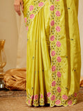 Kasee Women's Lime Green Poly Chiffon Saree with Pink Floral Embroidered Border