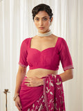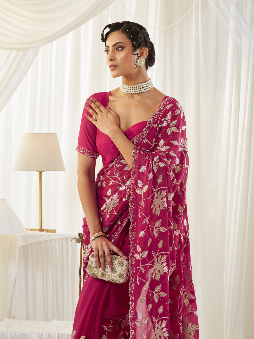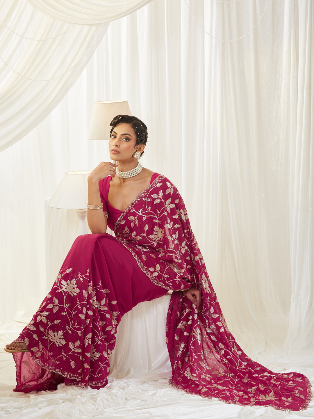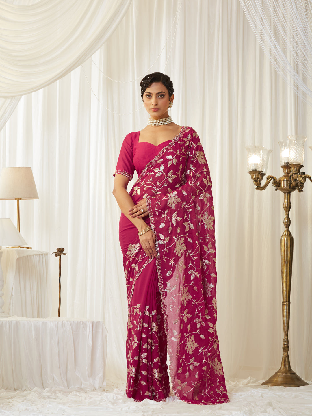 This elegant maroon poly silk saree showcases a beautifully feminine charm with its intricate all-over metallic floral embroidery crafted in subtle silver threadwork. The delicate scalloped border, adorned with fine stone embellishments, adds just the right amount of shimmer, making the saree perfect for festive occasions, weddings, and evening celebrations. Its lightweight, airy texture drapes effortlessly, offering a refined blend of sophistication and comfort. The soft pastel hue paired with the ornate detailing creates a graceful statement look. Style it with pearl chandbalis, a sleek hairdo, and minimal glam makeup to complete the ensemble with timeless elegance.