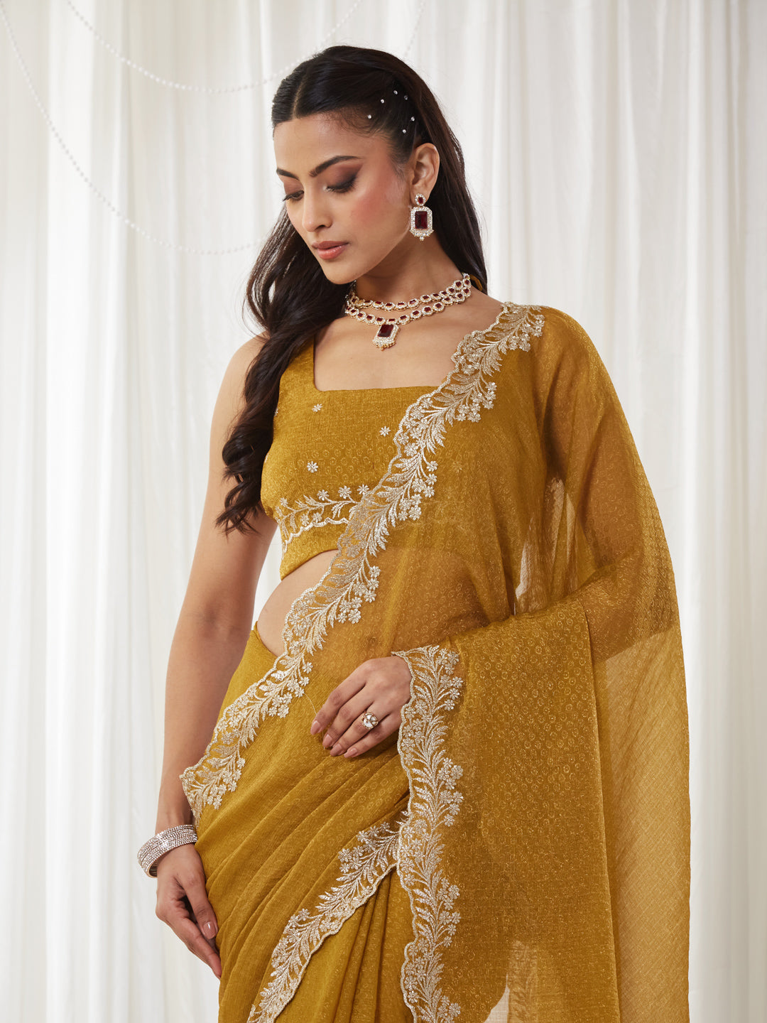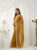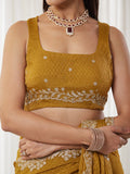 Elevate your festive wardrobe with this elegant mustard yellow saree, designed to bring effortless sophistication to every occasion. Crafted from lightweight silk blend, the saree features a subtle self-textured pattern across the body that adds depth and richness to the drape.A beautifully detailed embroidered border with intricate floral thread work enhances the saree, offering a refined and luxurious finish. The semi-sheer pallu adds a graceful touch, while the matching blouse piece completes the look. Perfect for weddings, festive gatherings, and evening celebrations, this saree blends traditional elegance with modern charm.