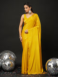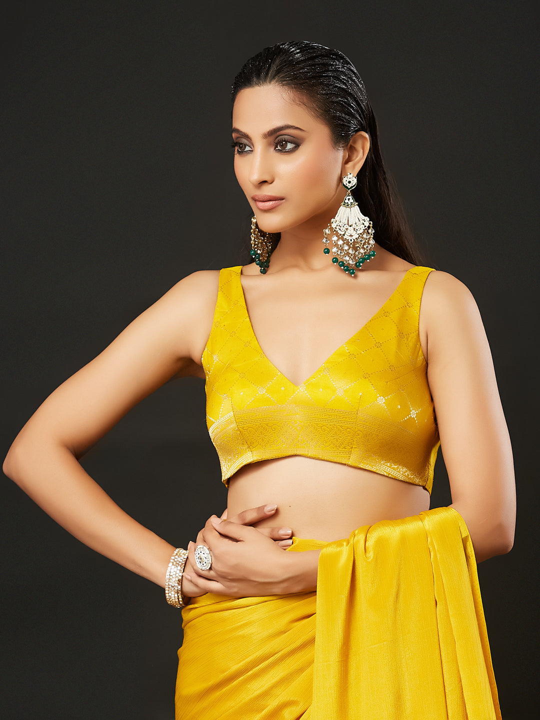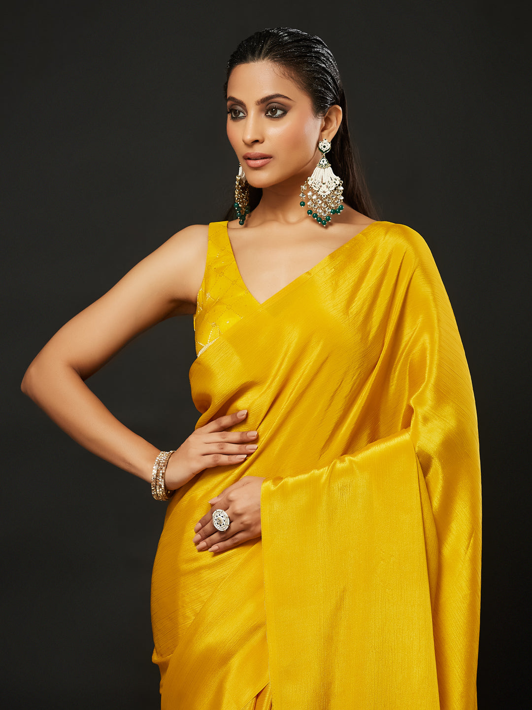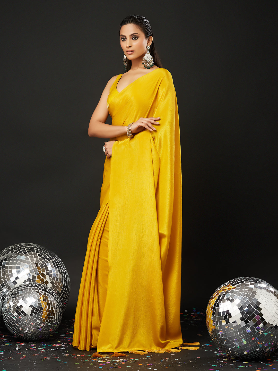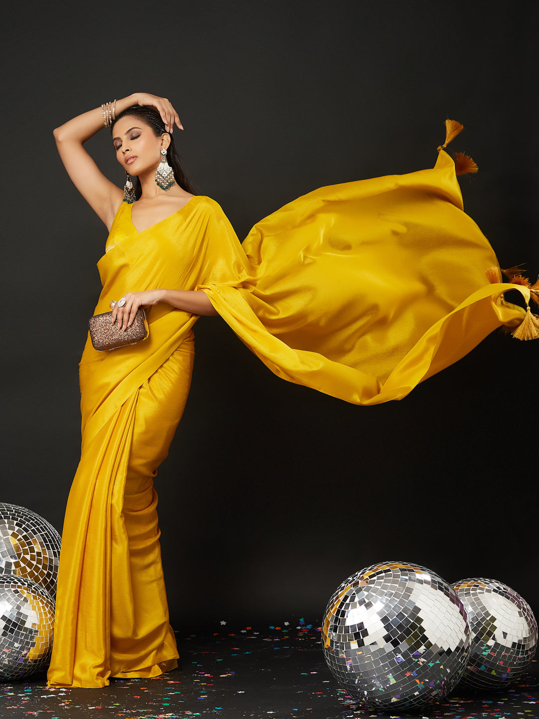 Give your ethnic wardrobe a chic upgrade with this elegant mustard silk saree. Crafted from ultra-smooth silk, the saree features a glossy, fluid drape that enhances its premium look. The rich mustard hue adds a contemporary yet festive touch, making it perfect for wedding functions, parties, and special celebrations.The solid body and shimmering texture allow effortless styling, while the tasselled pallu adds a playful and stylish edge. Paired with a matching embroidered blouse, this saree blends simplicity and luxury for a refined ethnic statement.