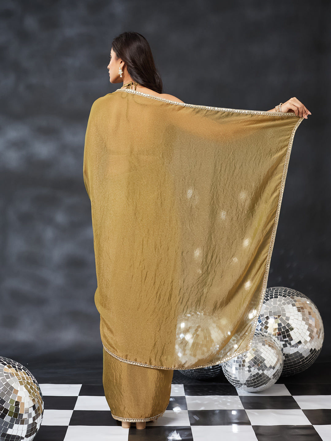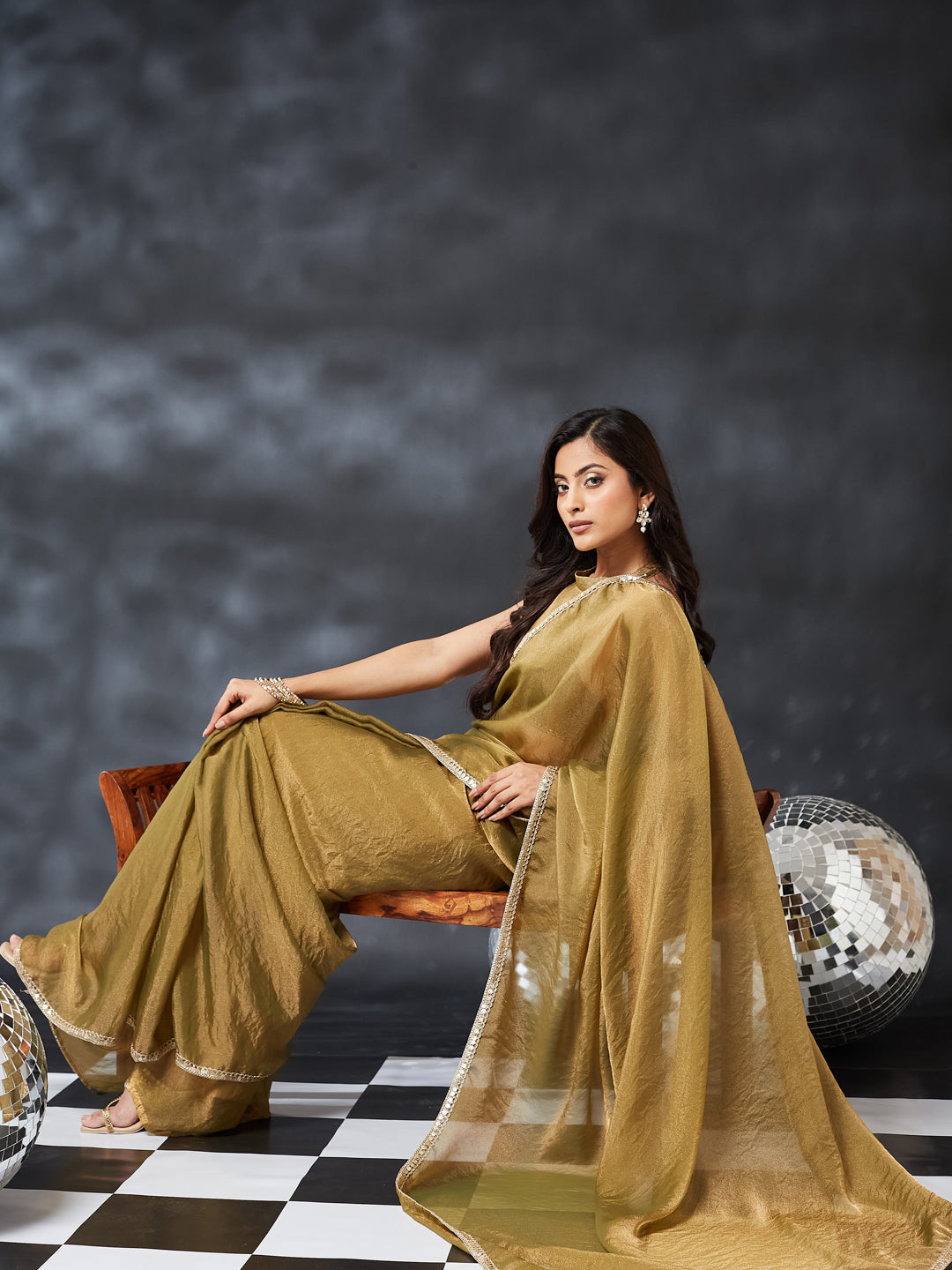 Step into effortless glamour with this olive Green Embroidered Silk Blend Saree, a perfect statement piece for cocktail nights, festive parties, and reception celebrations. The saree features dense, all-over stone highlighting, giving it a radiant sparkle that stands out beautifully under lights.The rich beige shade blends warmth and luxury, making the saree ideal for both day and evening events. Crafted in lightweight silk blend, the saree drapes smoothly with a graceful flow, while the pallu carries a mesmerizing shimmer that enhances every movement.
