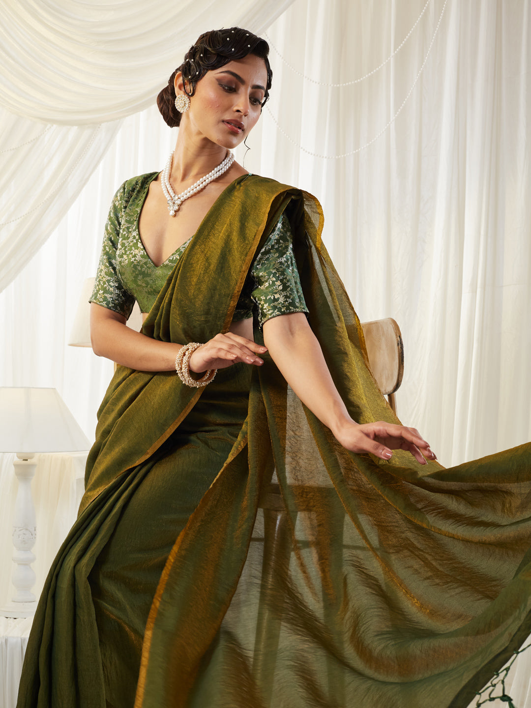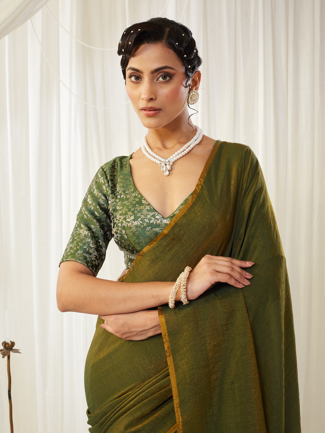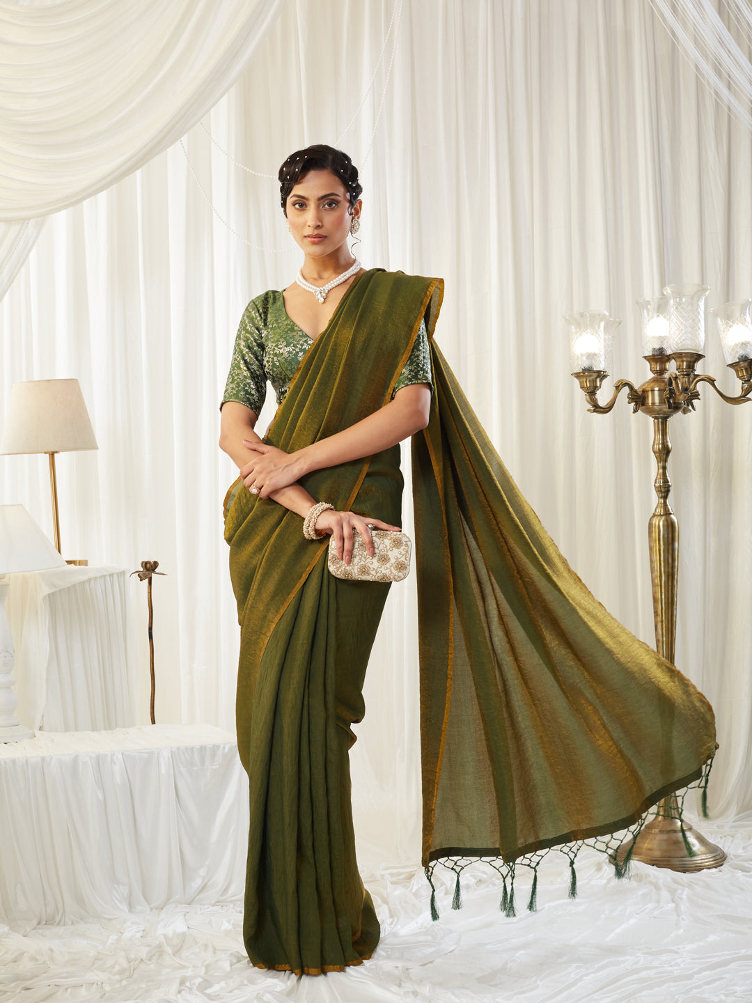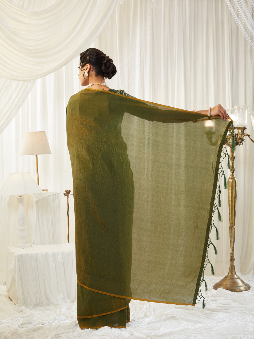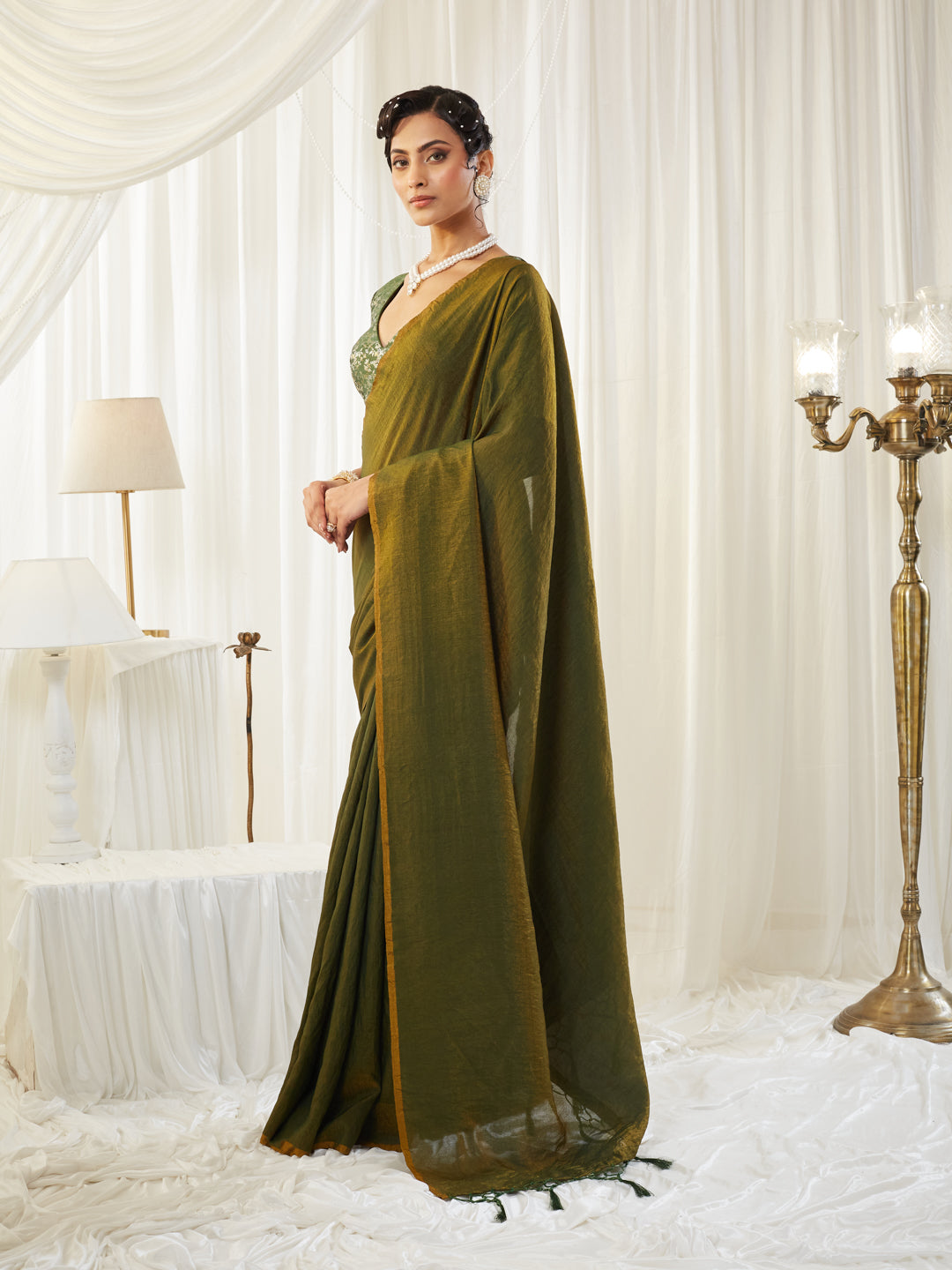 This olive green silk cotton saree is a perfect blend of comfort, elegance, and earthy sophistication, featuring a naturally textured drape that falls effortlessly for everyday grace or festive charm. The saree showcases a subtle sheen with a beautifully woven finish and a contrasting mustard-gold pallu highlighted with hand-tied tassels, adding a touch of artisanal detail. Paired with a striking green printed V-neck blouse, the look balances traditional richness with contemporary styling. Lightweight, breathable, and effortlessly chic, this saree is ideal for daytime celebrations, festive gatherings, and refined ethnic dressing, offering timeless simplicity with modern appeal.