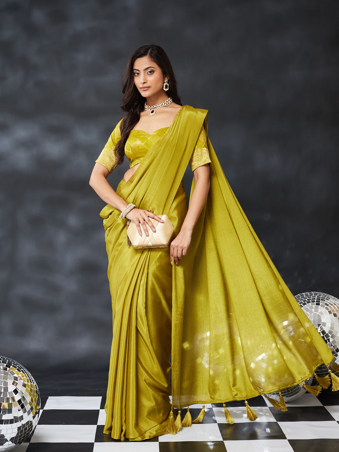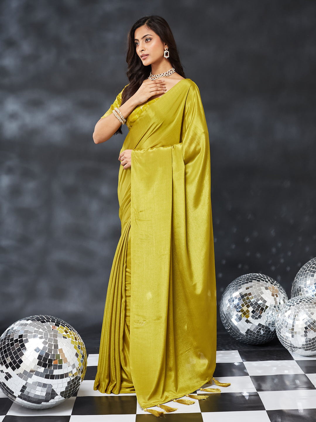 Give your ethnic wardrobe a chic upgrade with this elegant olive green silk saree. Crafted from ultra-smooth silk, the saree features a glossy, fluid drape that enhances its premium look. The rich mustard hue adds a contemporary yet festive touch, making it perfect for wedding functions, parties, and special celebrations.The solid body and shimmering texture allow effortless styling, while the tasselled pallu adds a playful and stylish edge. Paired with a matching embroidered blouse, this saree blends simplicity and luxury for a refined ethnic statement.