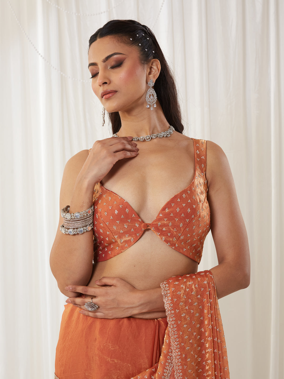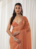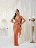 Step into effortless glamour with this Embellished Silk Blend Saree, a perfect statement piece for cocktail nights, festive parties, and reception celebrations. The saree features dense, all-over stone highlighting, giving it a radiant sparkle that stands out beautifully under lights.The rich peach shade blends warmth and luxury, making the saree ideal for both day and evening events. Crafted in lightweight silk blend, the saree drapes smoothly with a graceful flow, while the pallu carries a mesmerizing shimmer that enhances every movement.Complementing the saree is a designer high-neck blouse, adding structure and a contemporary edge to the classic drape. This combination of modern blouse styling and traditional sparkle makes the outfit truly captivating