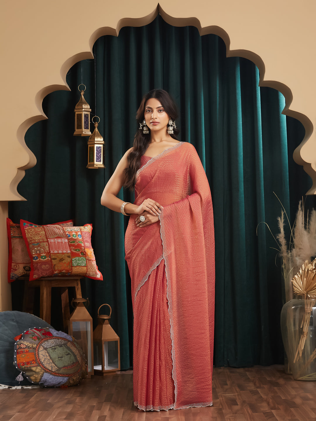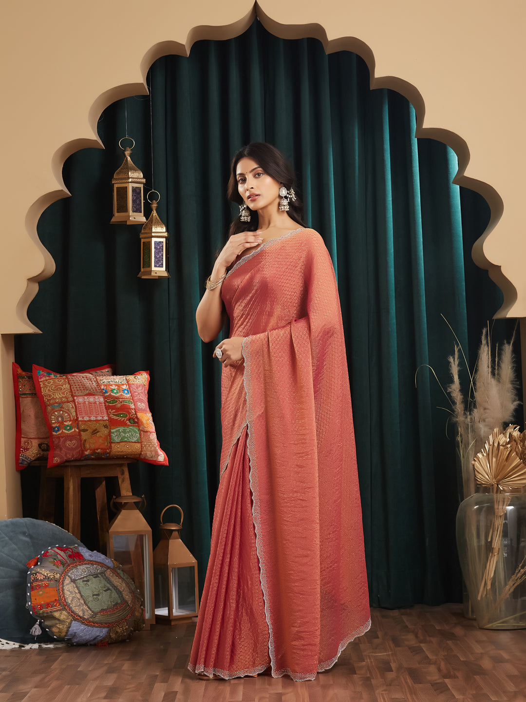 KASEE Women's Pink Gold Textured Art Silk Saree with Embellished Scallop Border
