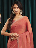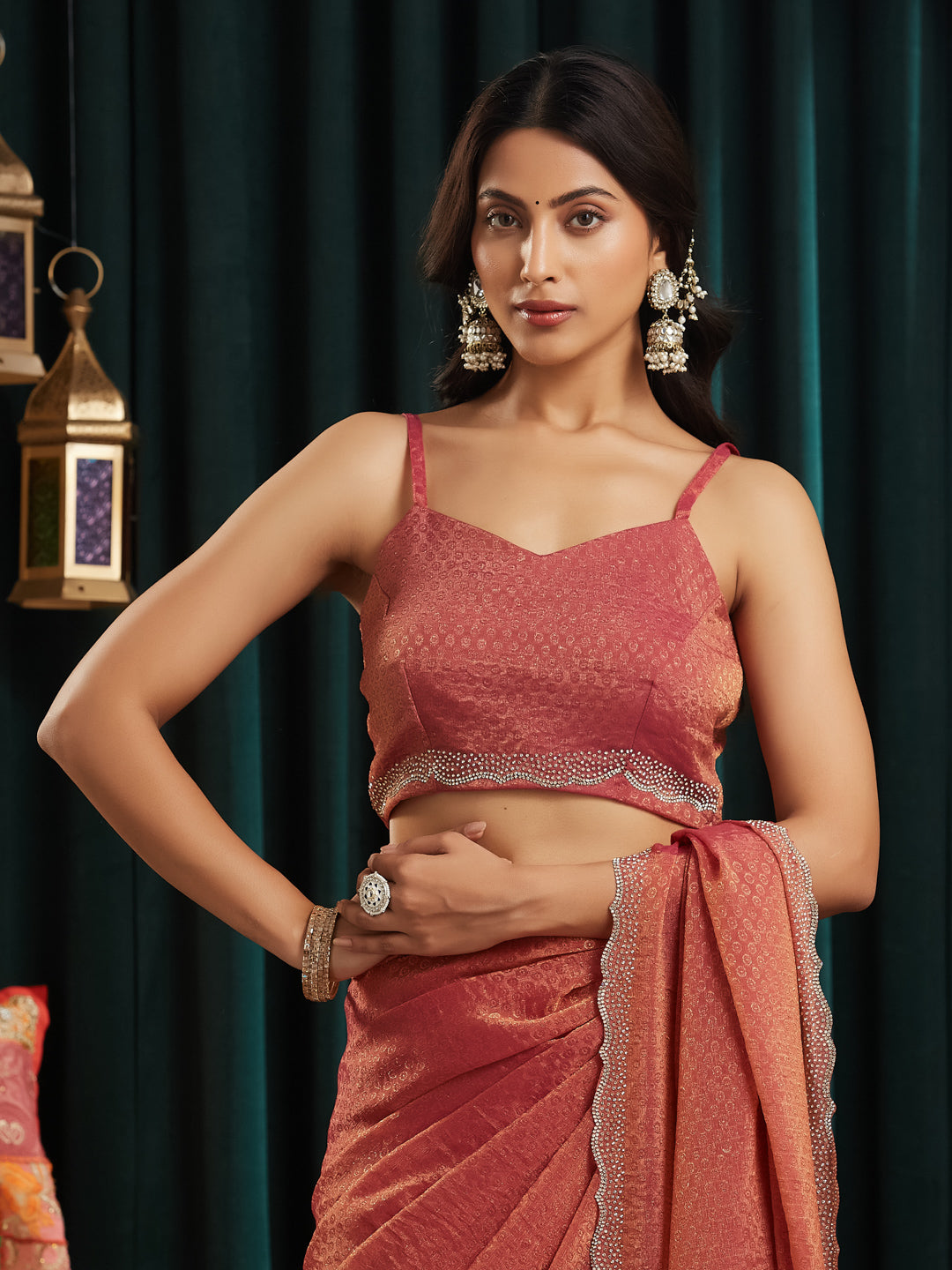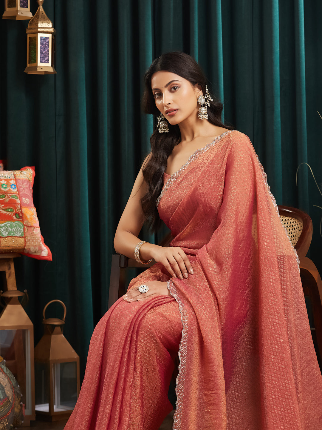 Elevate your festive wardrobe with this gorgeous Pink Textured Georgette Saree, crafted to bring together contemporary elegance and traditional charm. The saree features a unique self-textured pattern that adds depth, richness, and a subtle glow to the drape. Crafted from premium lightweight art silk, it flows effortlessly, giving you a flattering silhouette and comfortable wear for long celebrations.The pallu carries a soft sheer effect, beautifully showcasing the intricate texture underneath. The entire saree is framed with a delicately embellished border, finished with shimmering threadwork and bead accents that add just the right touch of glamour.This saree is paired with a chic and modern designer blouse featuring a sleek square neckline, making it perfect for those who love blending traditional silhouettes with contemporary cuts. The blouse complements the saree? texture and enhances its fashionable appeal.Whether it? a wedding, festive party, or evening celebration, this saree promises a standout, head-turning look.