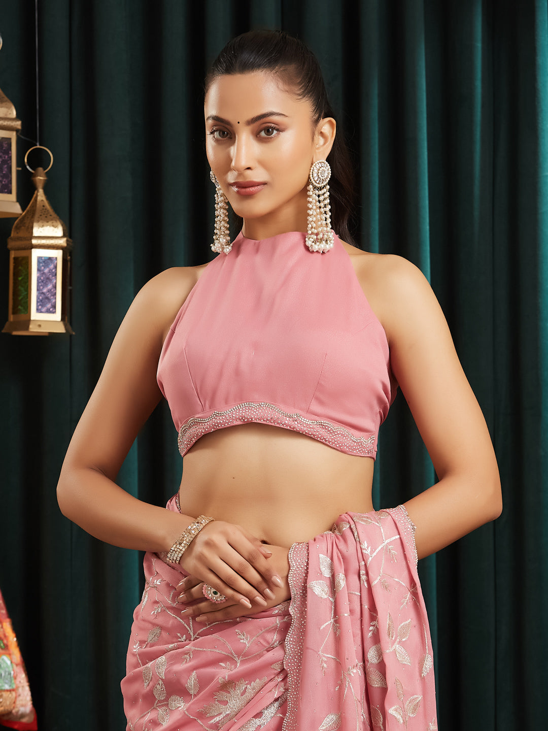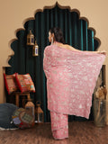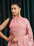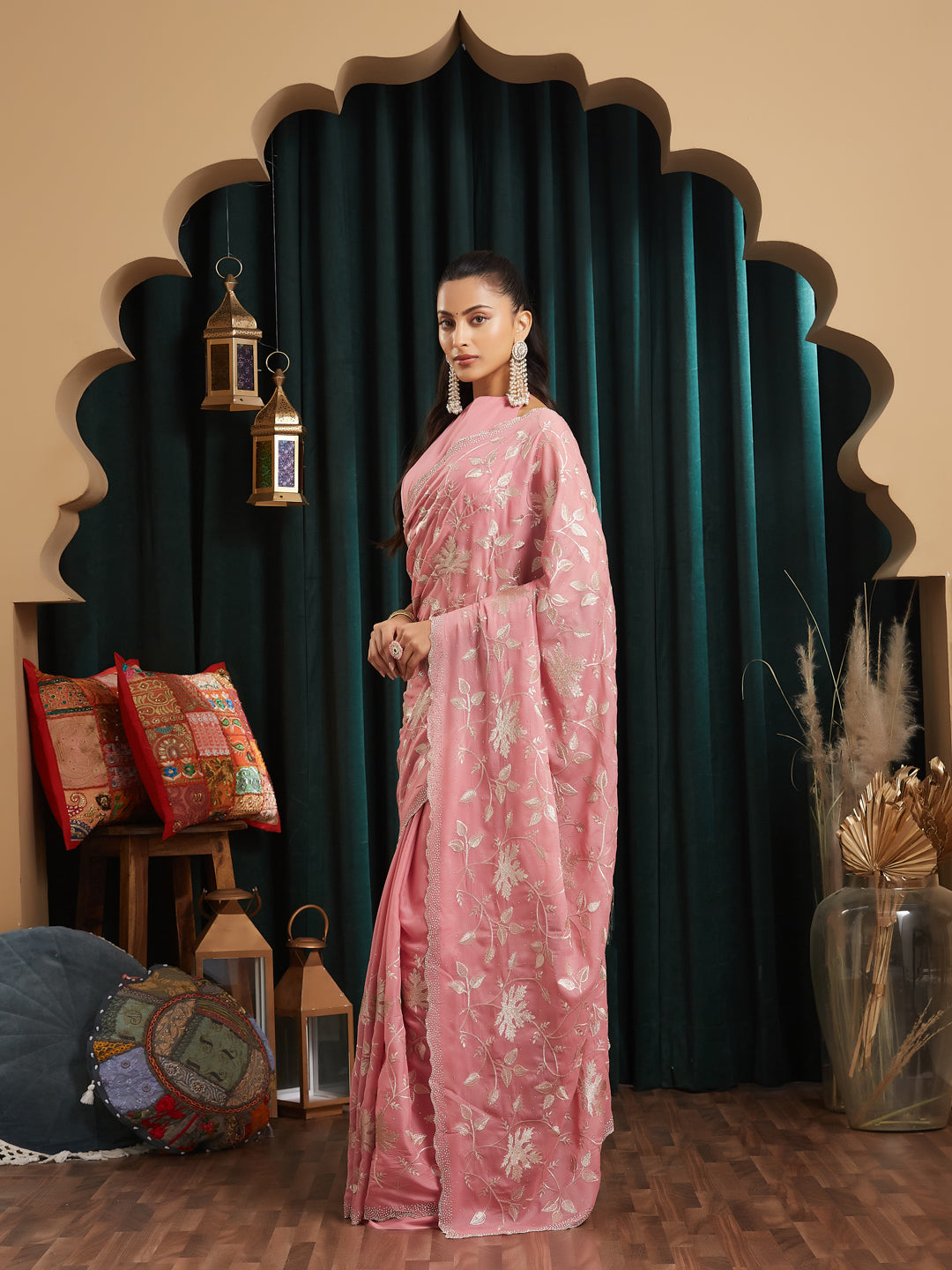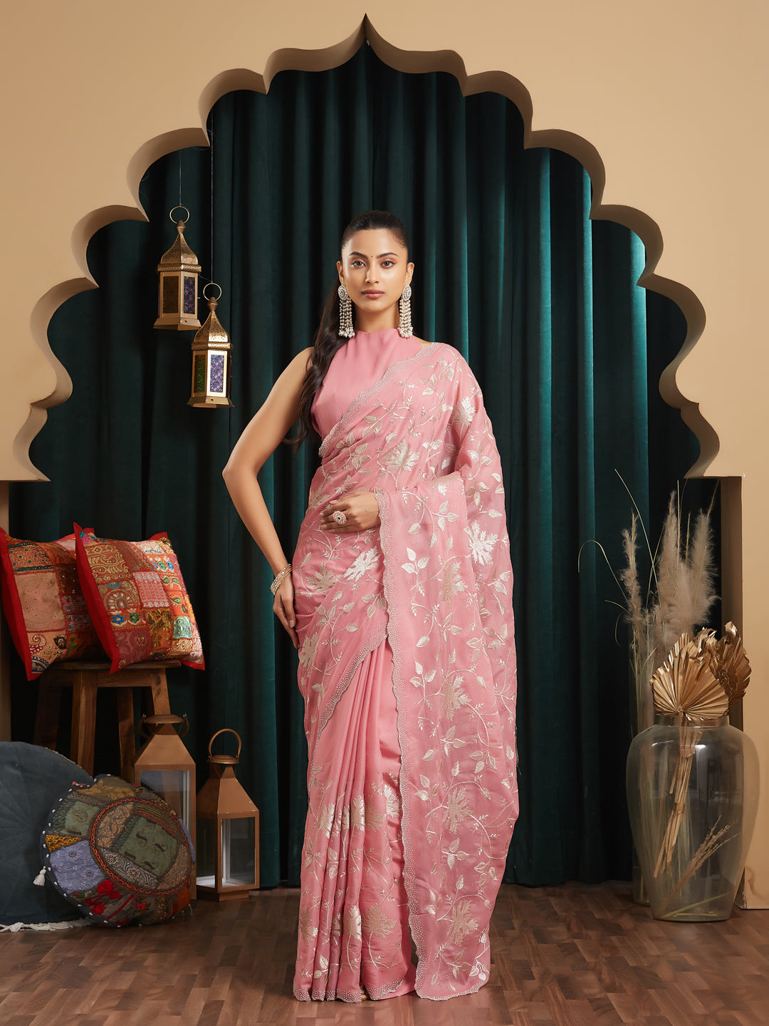 This elegant pink poly silk saree showcases a beautifully feminine charm with its intricate all-over metallic floral embroidery crafted in subtle silver threadwork. The delicate scalloped border, adorned with fine stone embellishments, adds just the right amount of shimmer, making the saree perfect for festive occasions, weddings, and evening celebrations. Its lightweight, airy texture drapes effortlessly, offering a refined blend of sophistication and comfort. The soft pastel hue paired with the ornate detailing creates a graceful statement look. Style it with pearl chandbalis, a sleek hairdo, and minimal glam makeup to complete the ensemble with timeless elegance.
